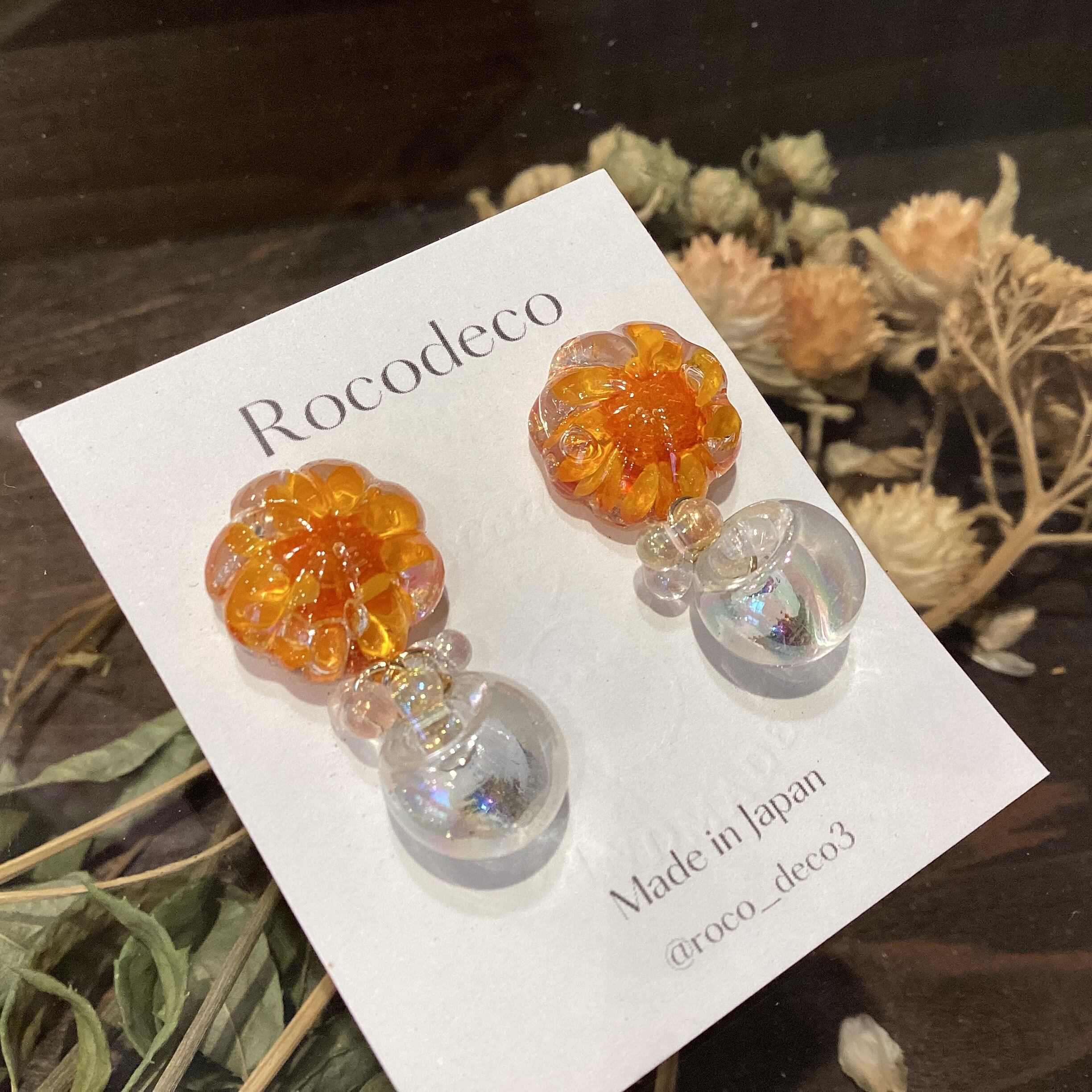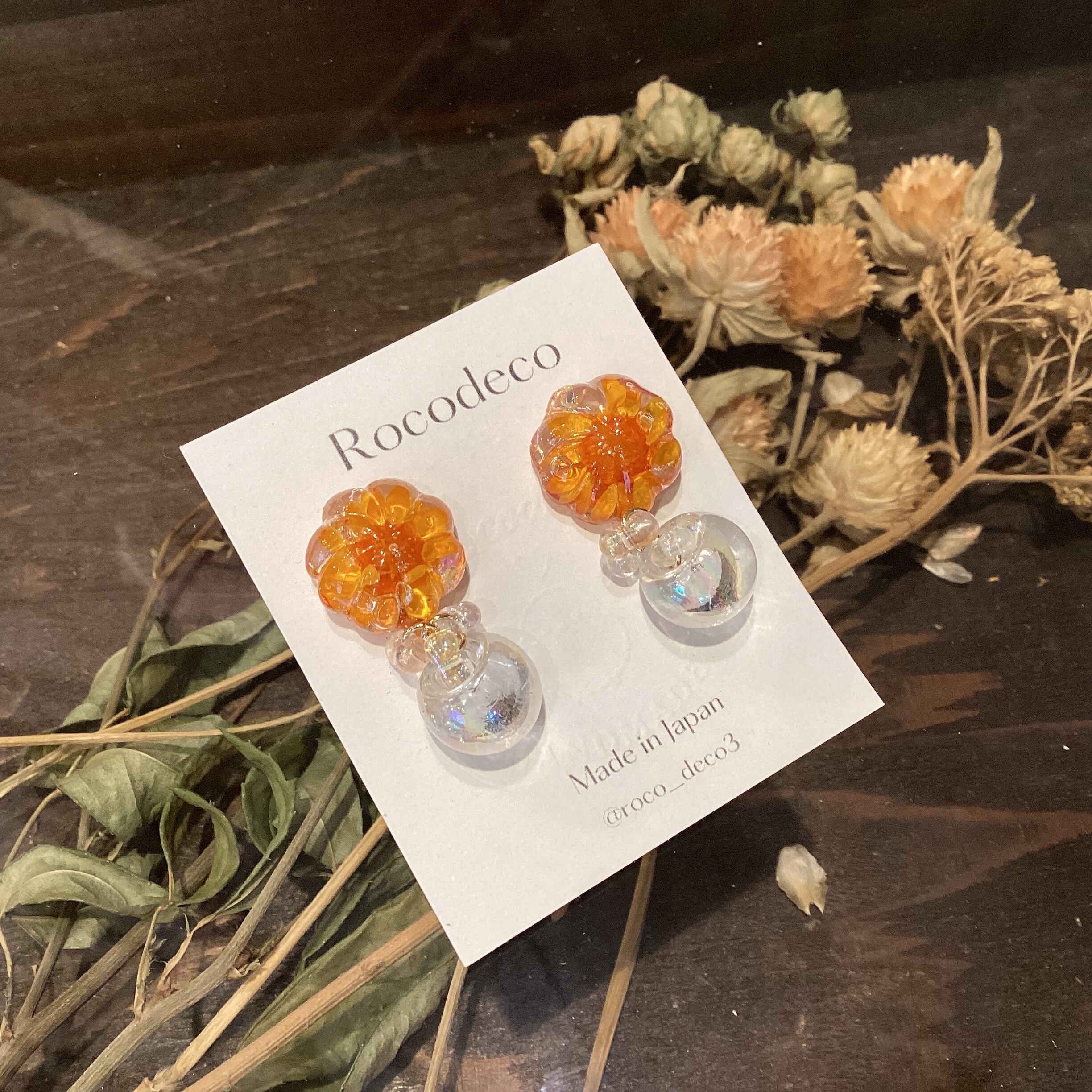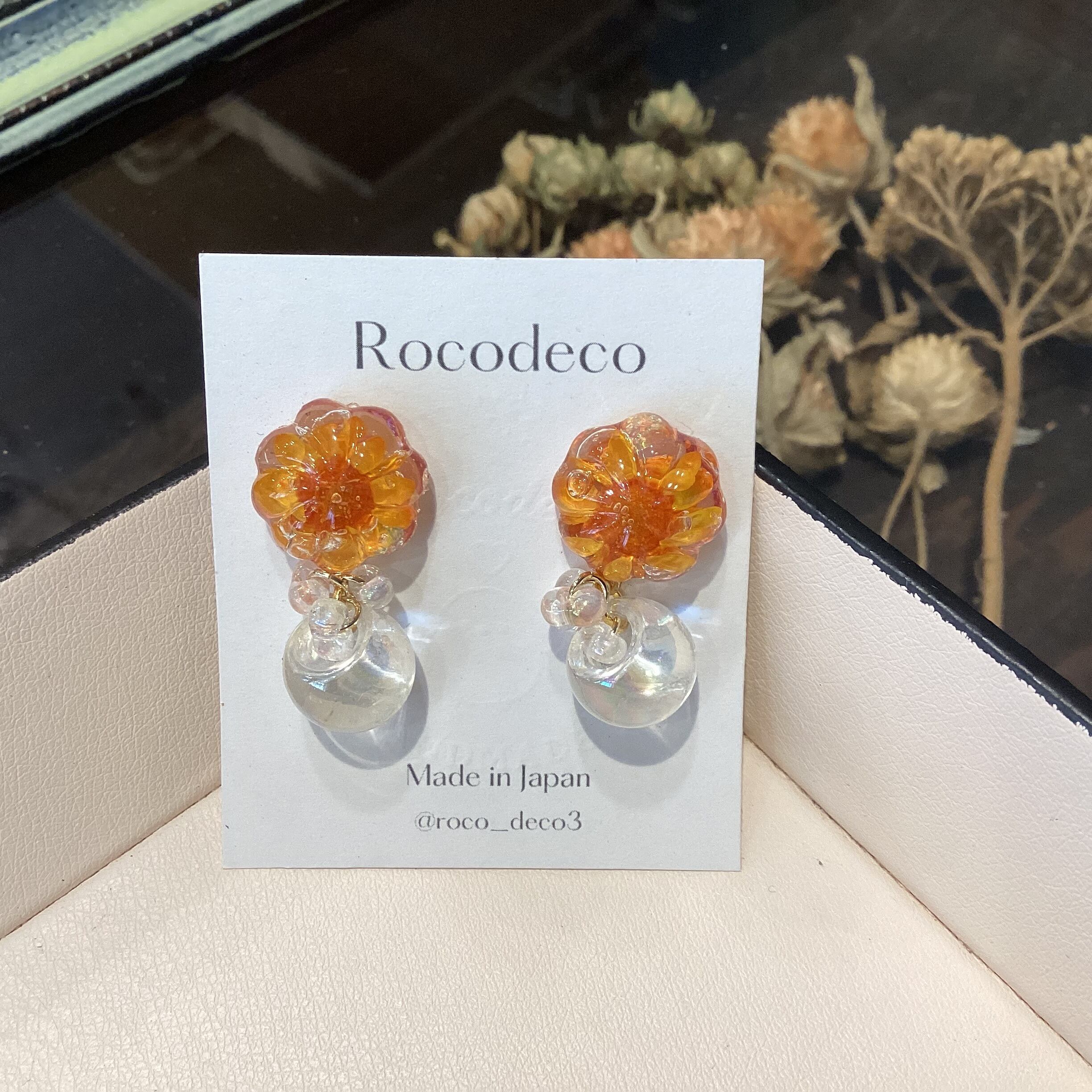 お花型のレジンにオレンジのお花を閉じ込めた作品となっております。 お色が綺麗で耳元を華やかにしてくれるピアスです。 ※ハンドメイドのため、左右で少し表情が異なることがございます。 あらかじめご了承くださいませ。 ※ こちらの商品はイヤリングへの変更はできません。 ご了承くださいませ。 ※こちらの作品はアレルギー対応の金具を使用しておりません。アレルギーをお持ちの方はご購入をお控えください。 【清水寺808】