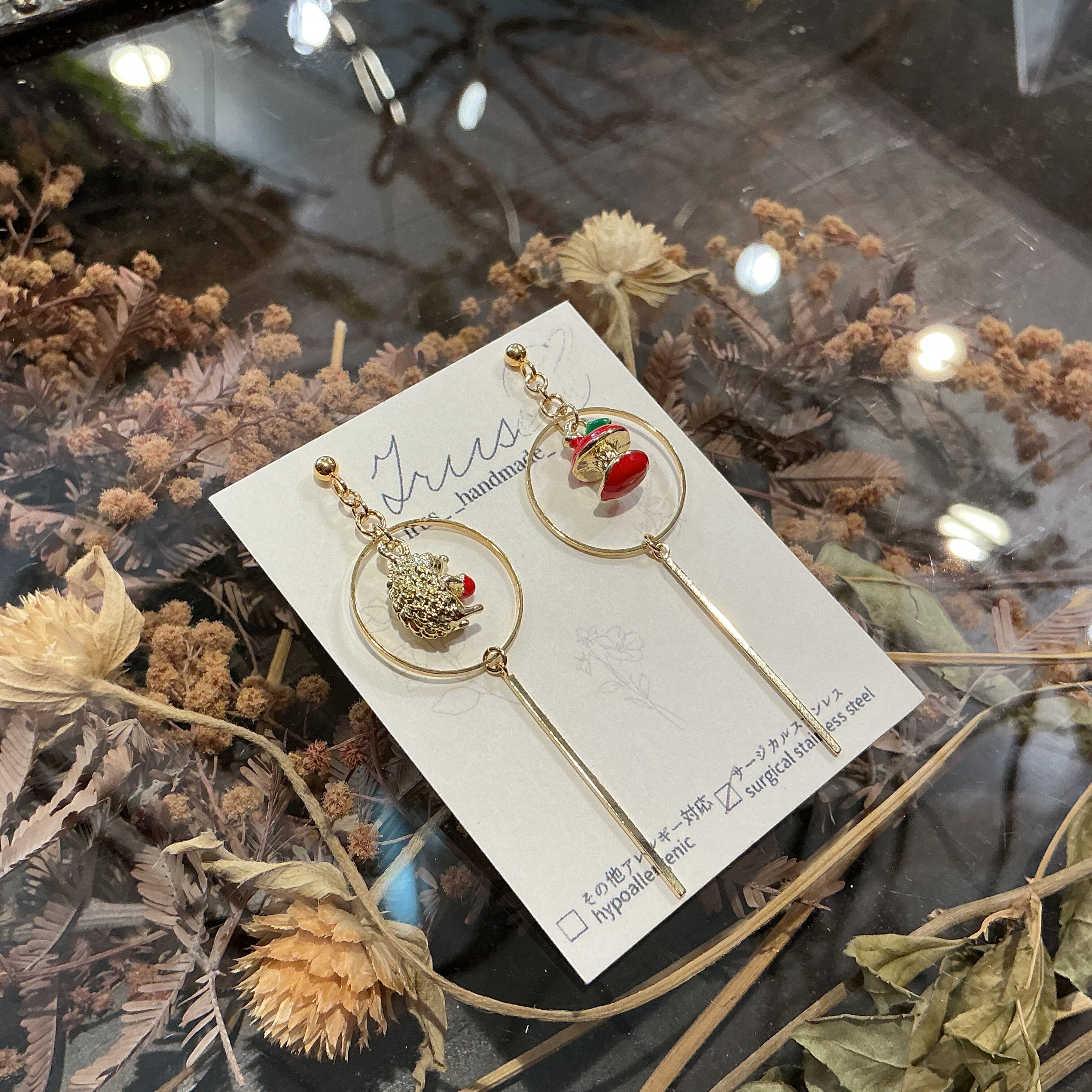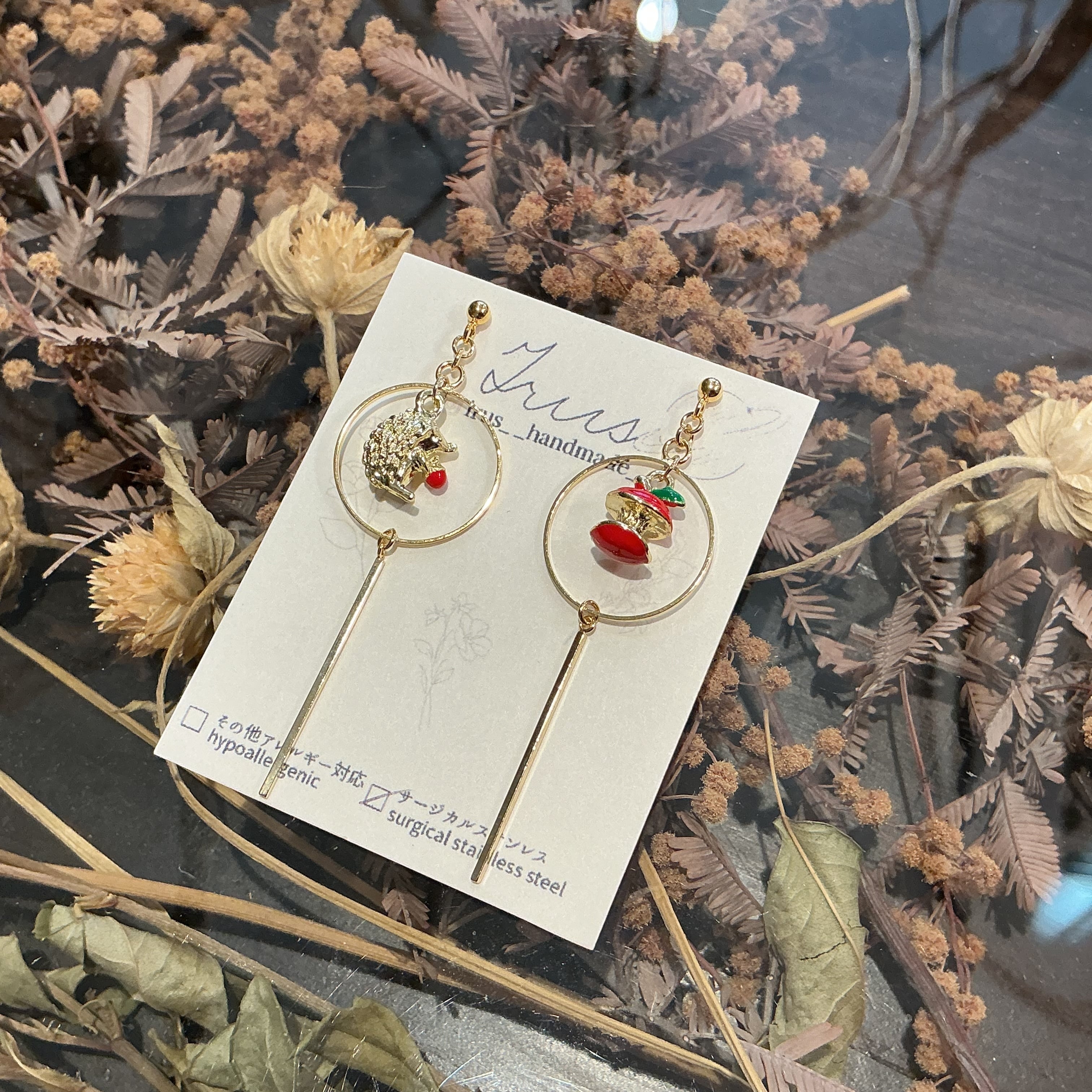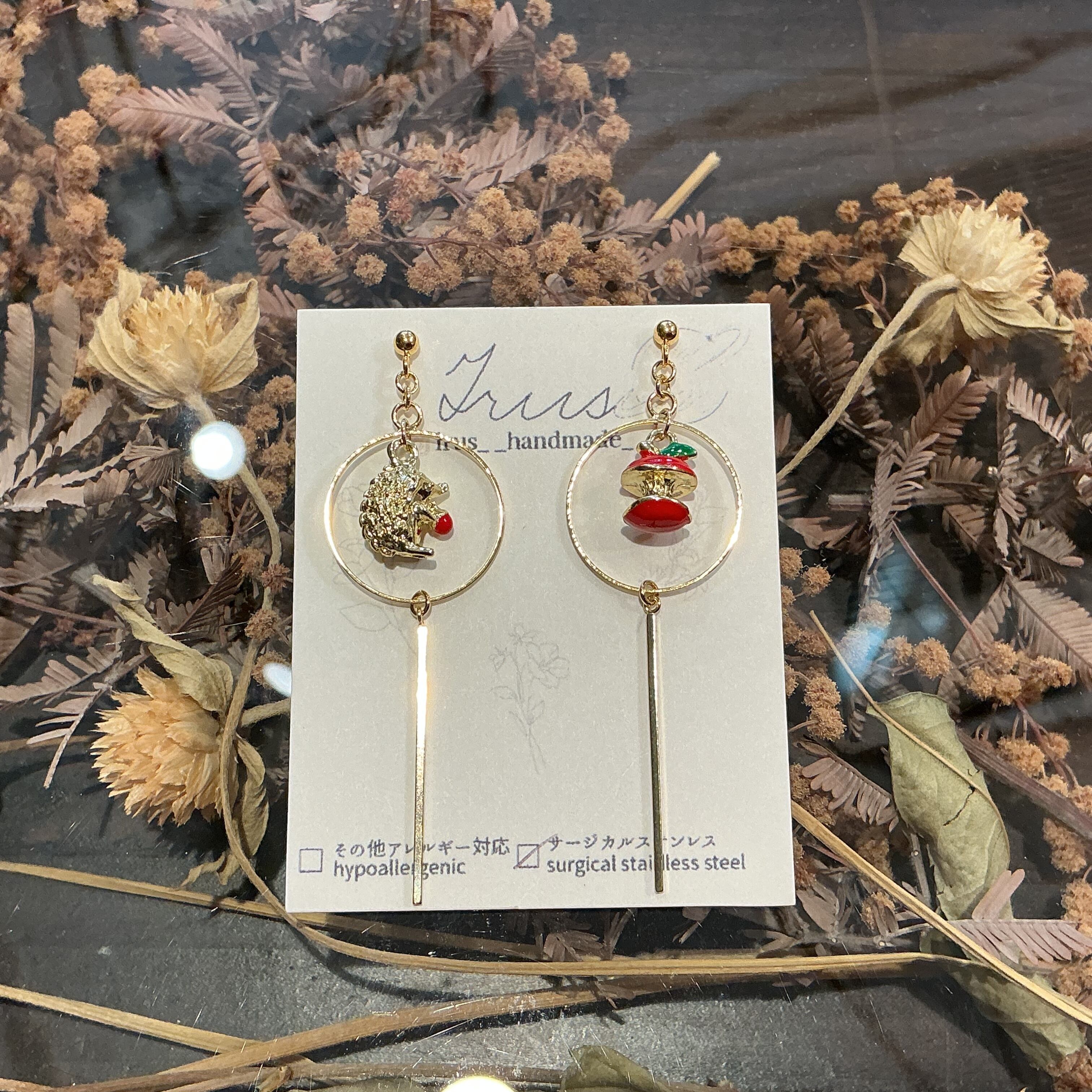 食べられたりんごとハリネズミのチャームを用いた作品です。
