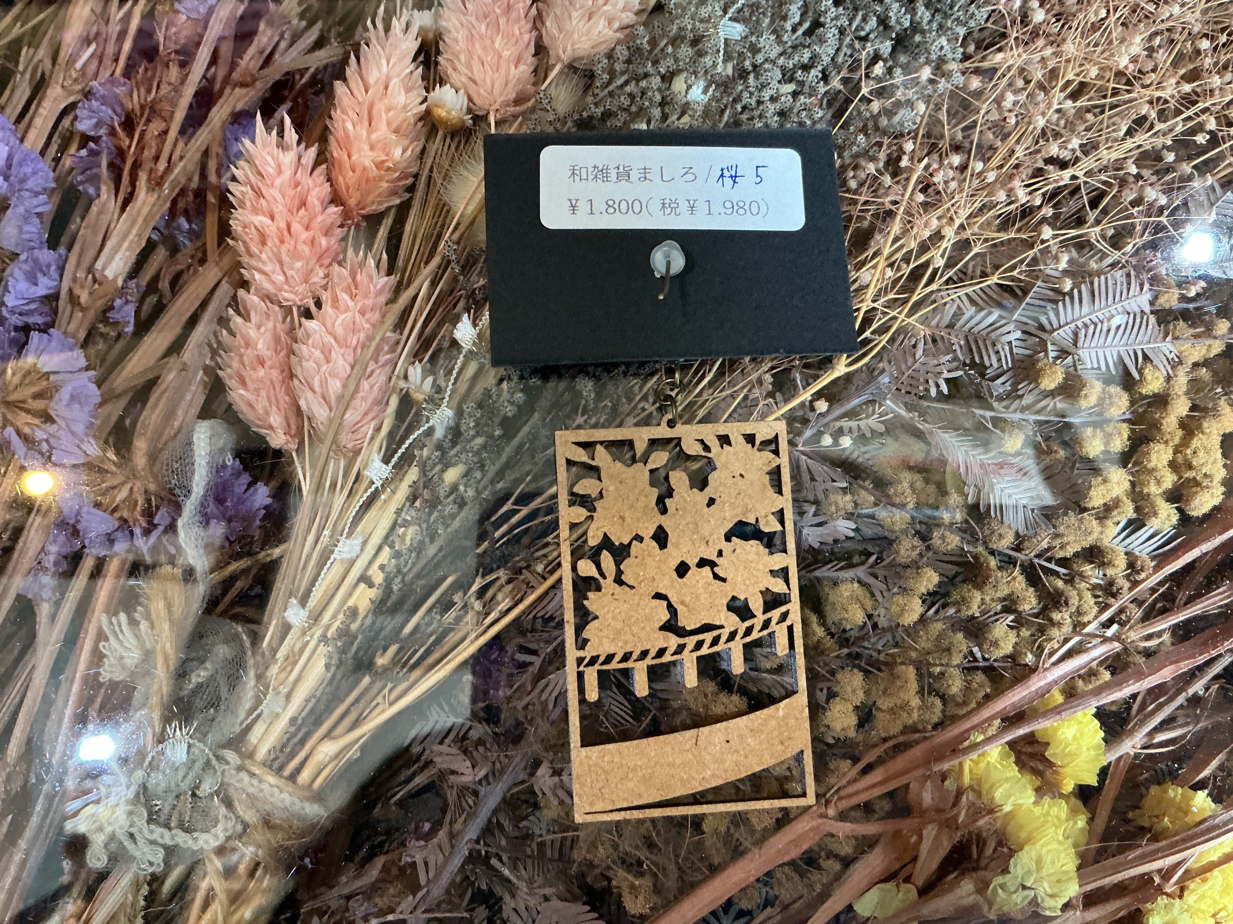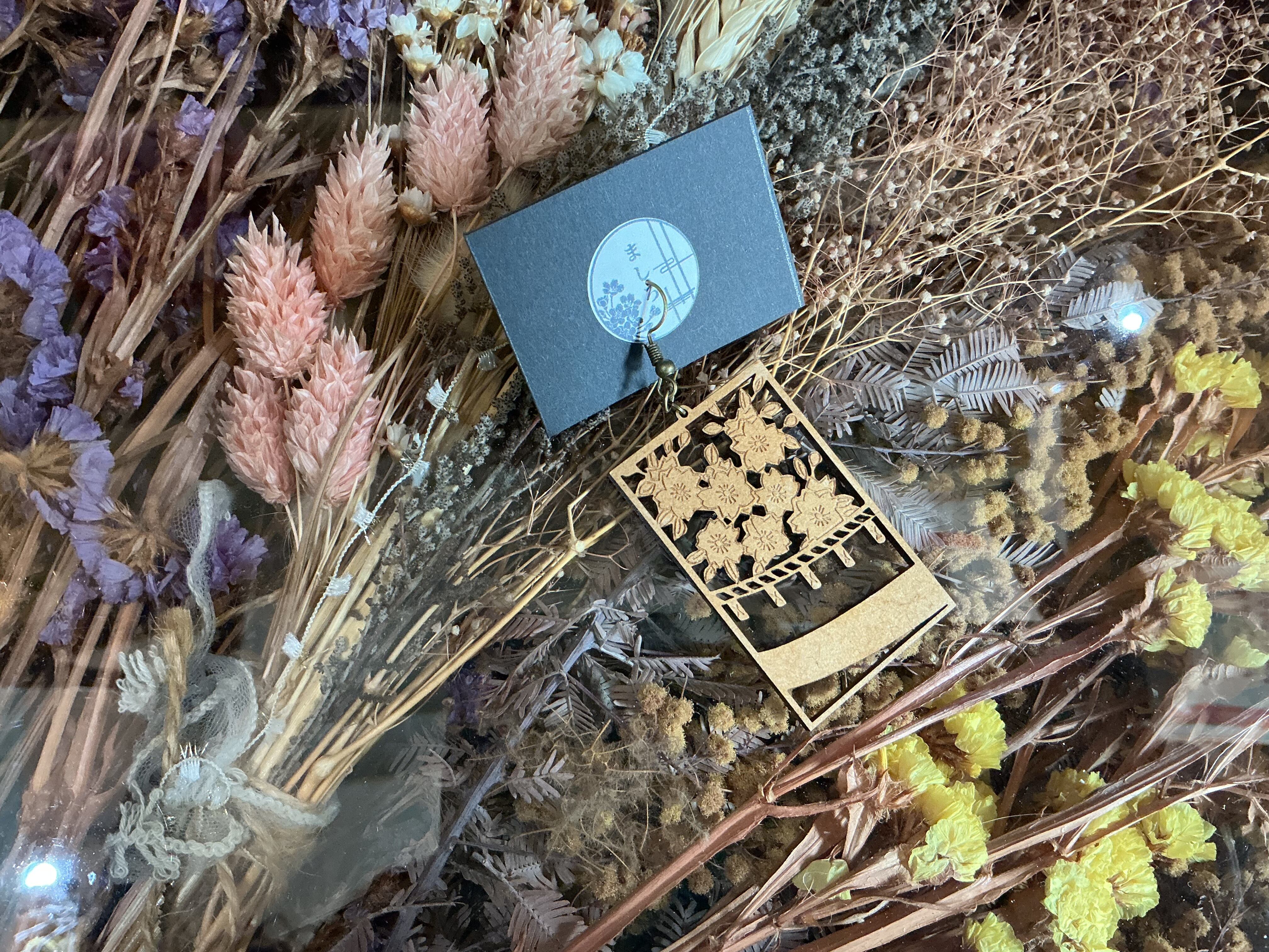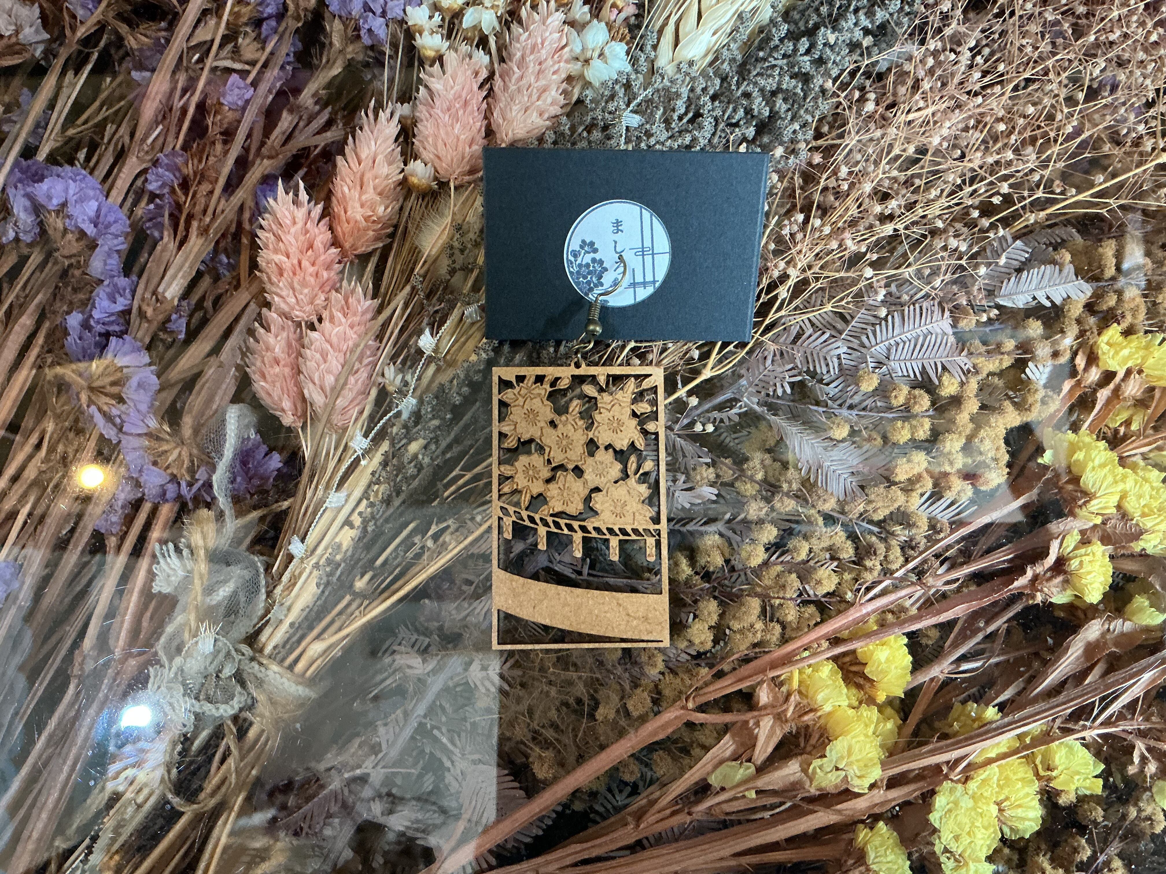 木彫りで作られた花札の桜がモチーフのピアスです。