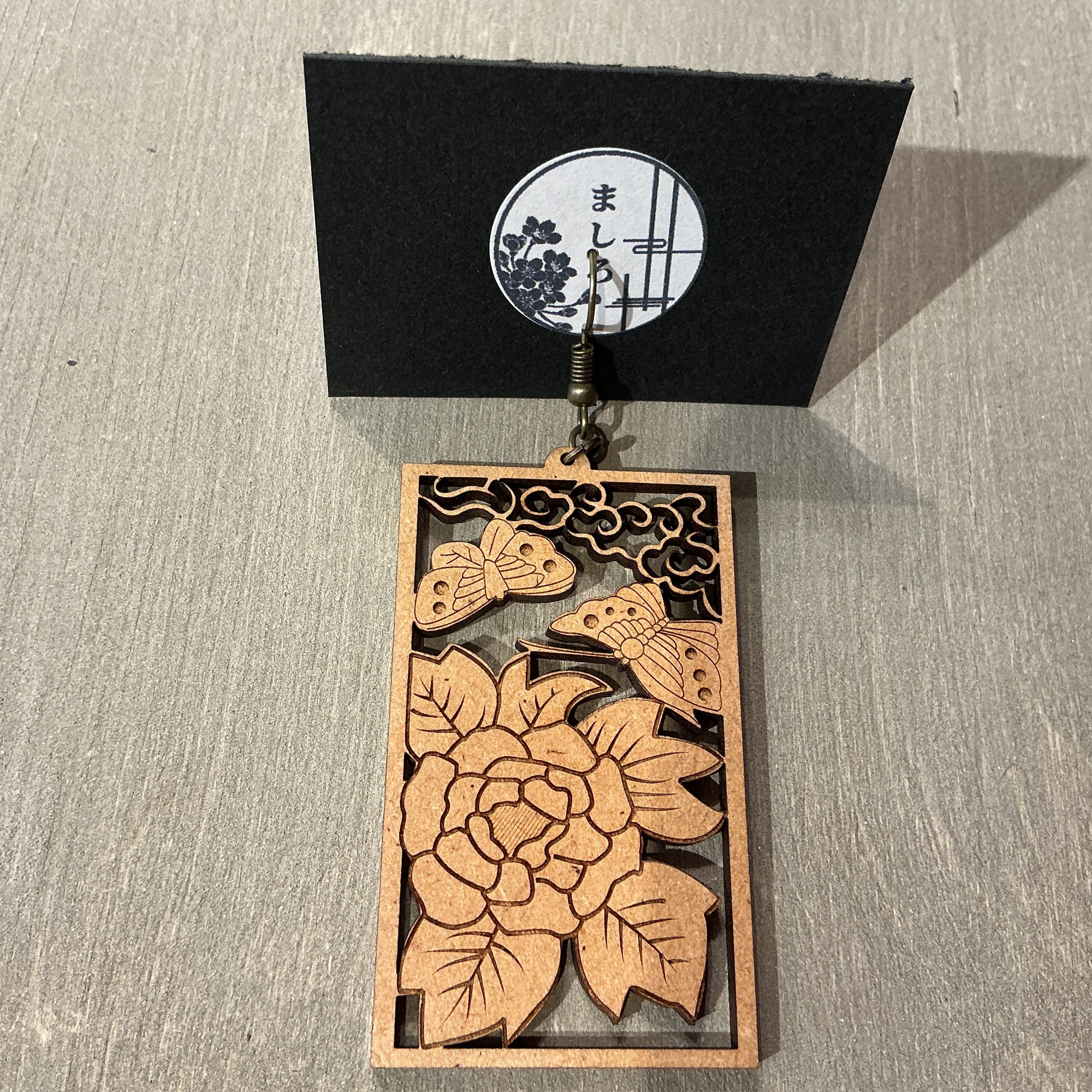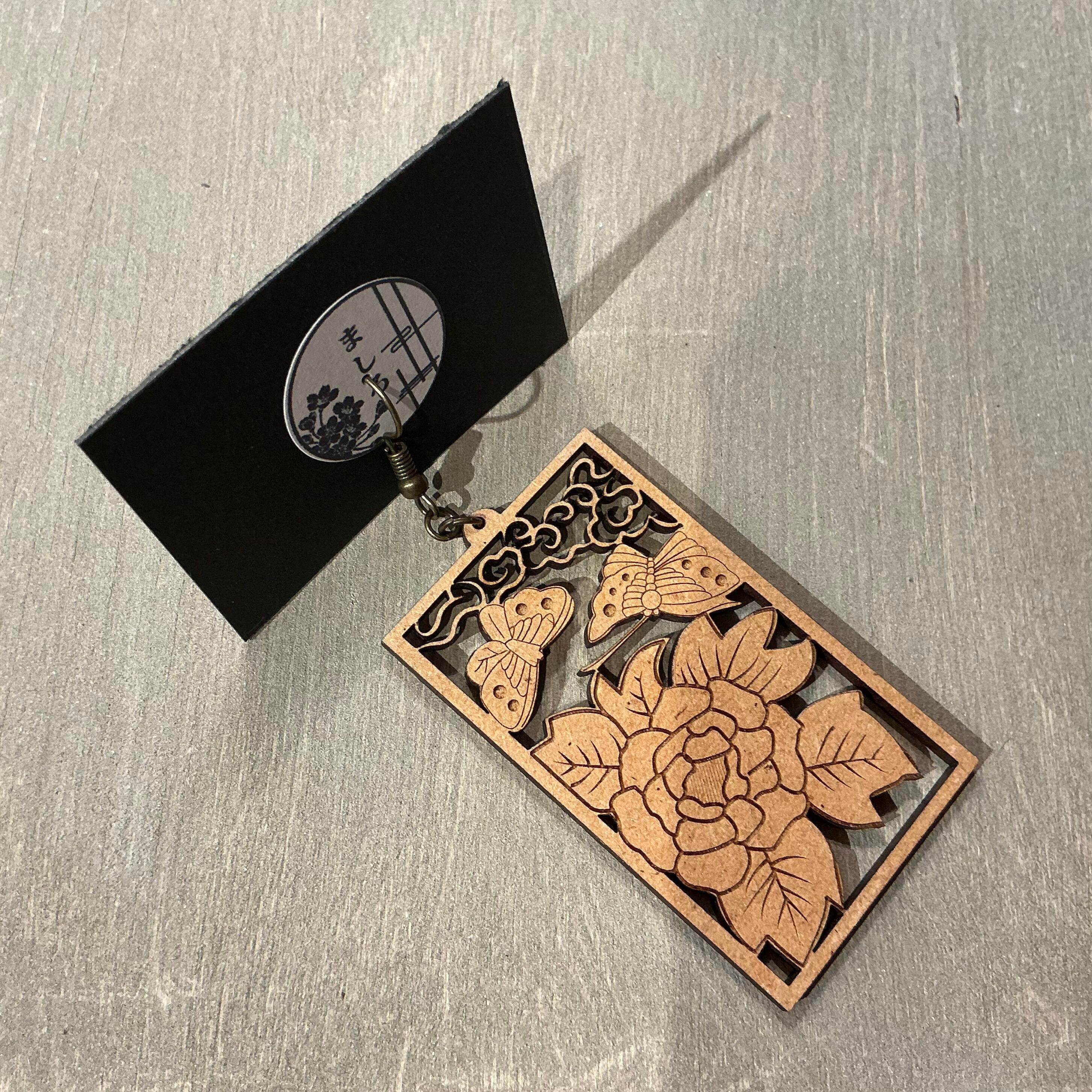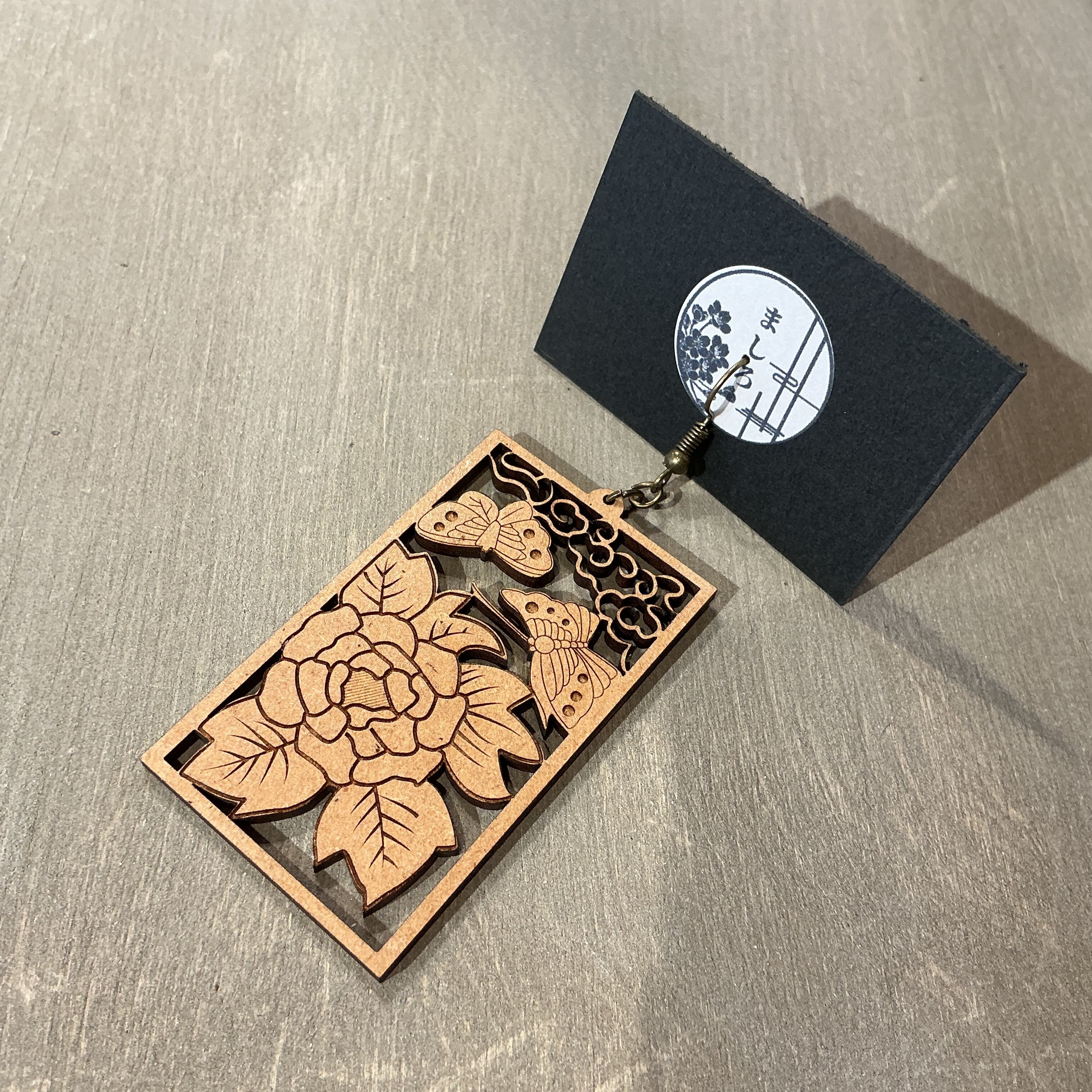 The peony of Japanese playing cards made with wood is a wooden earring in a motif.