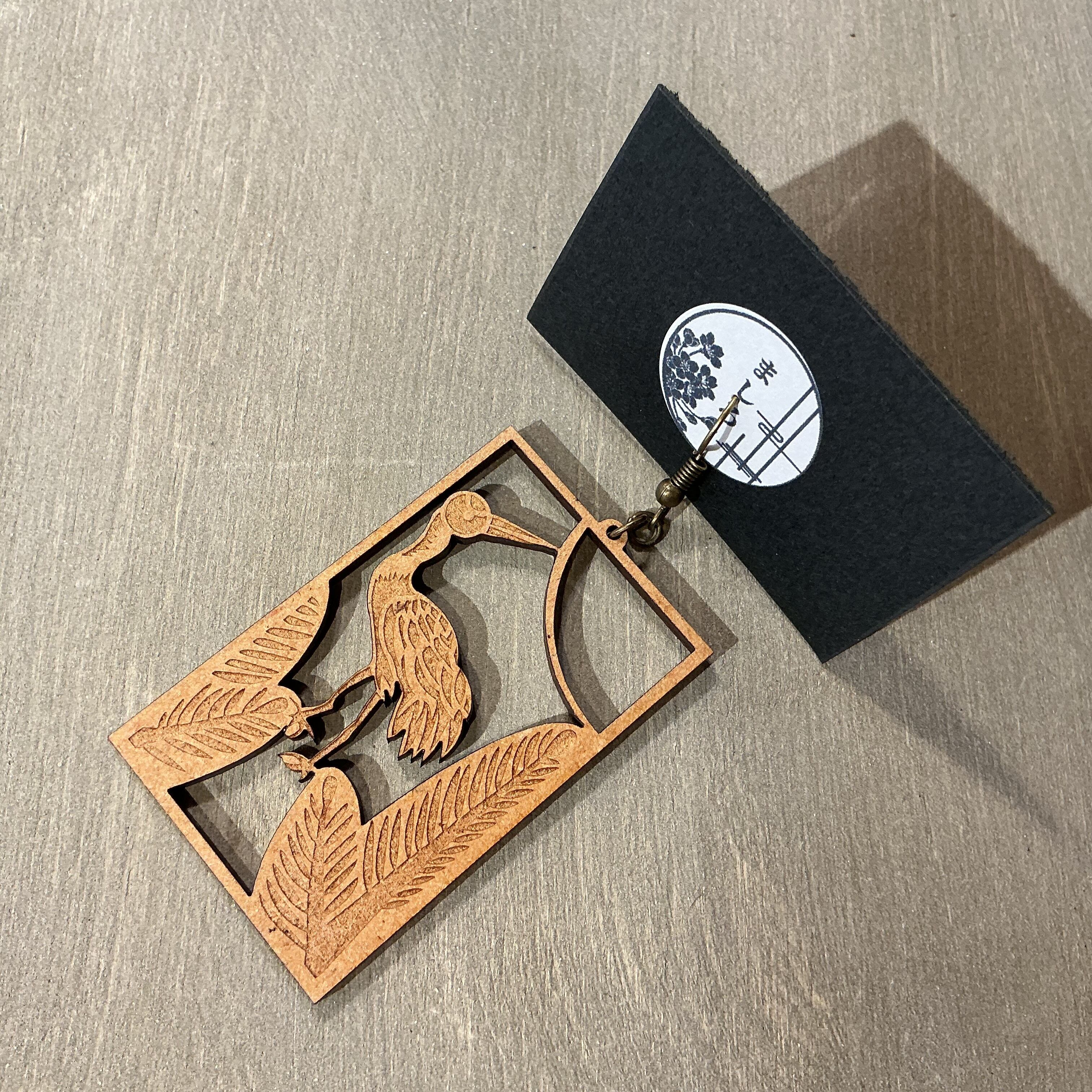 木材で作られた花札の「松に鶴」がモチーフな木彫りピアスです。