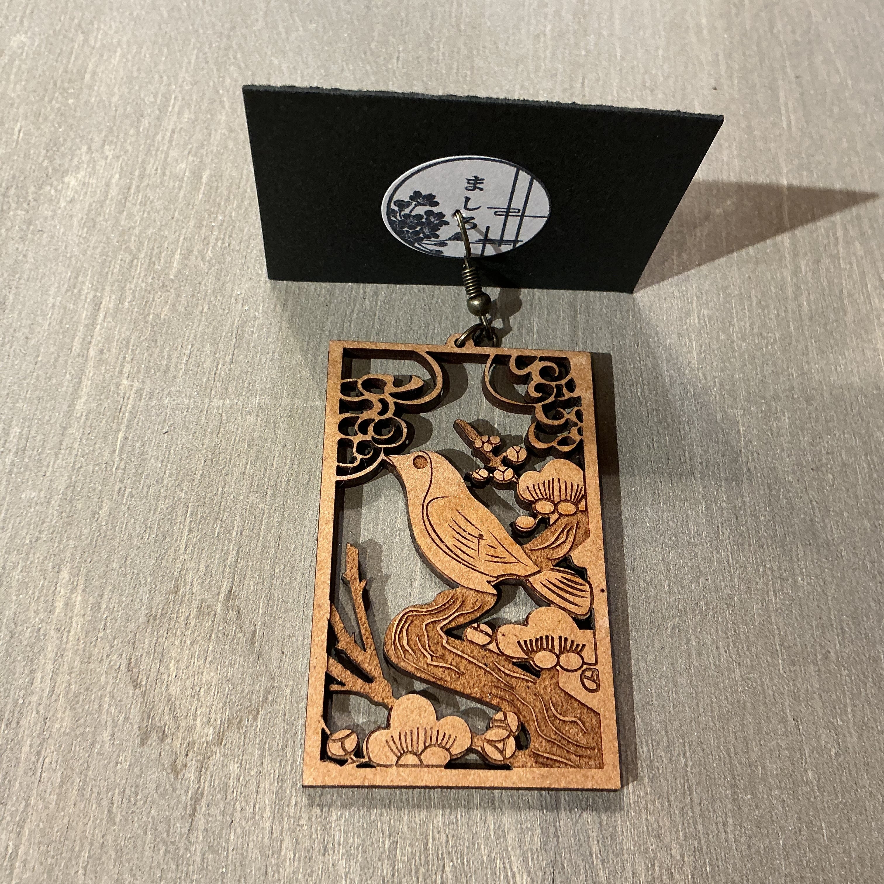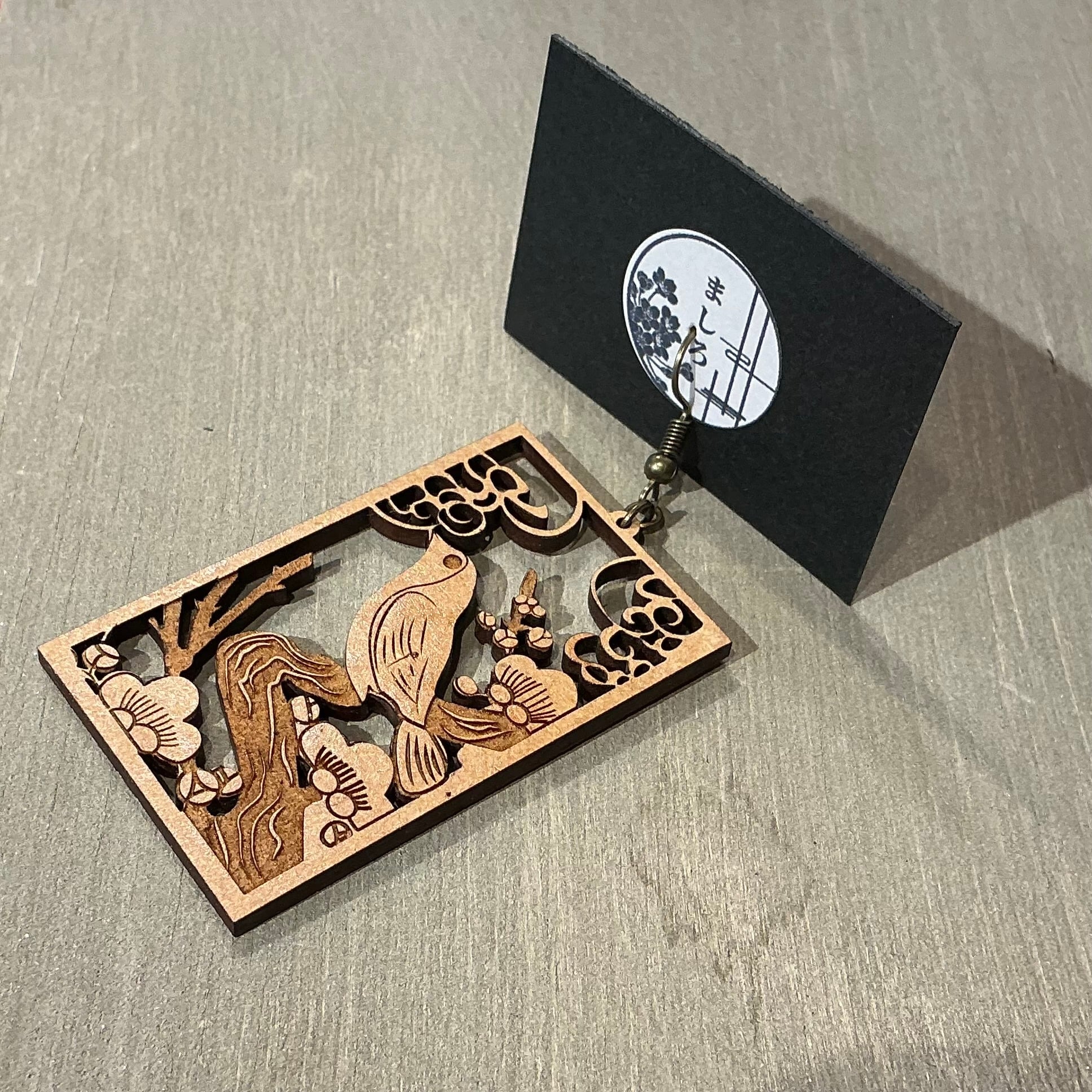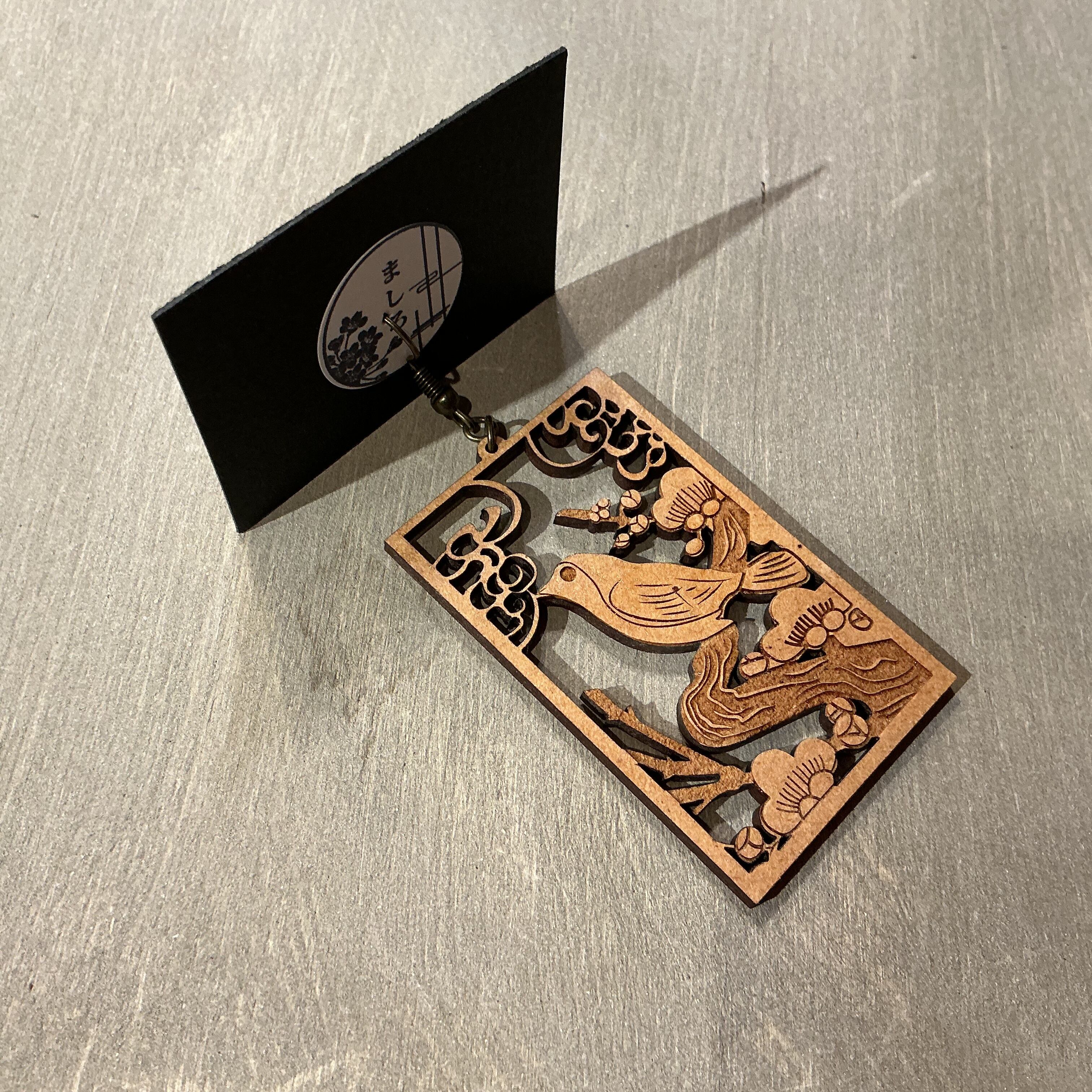 木材で作られた花札の梅がモチーフな木彫りピアスです。