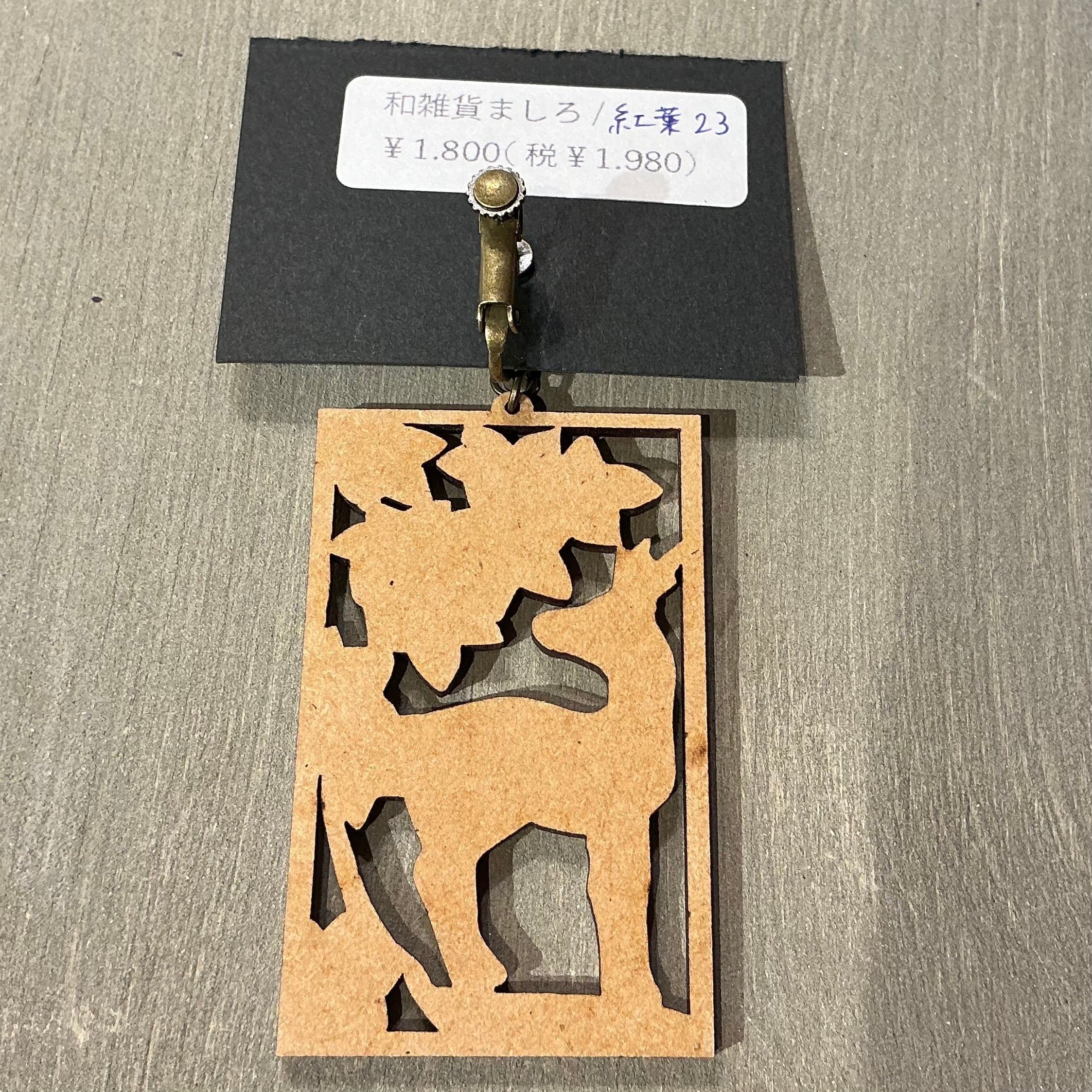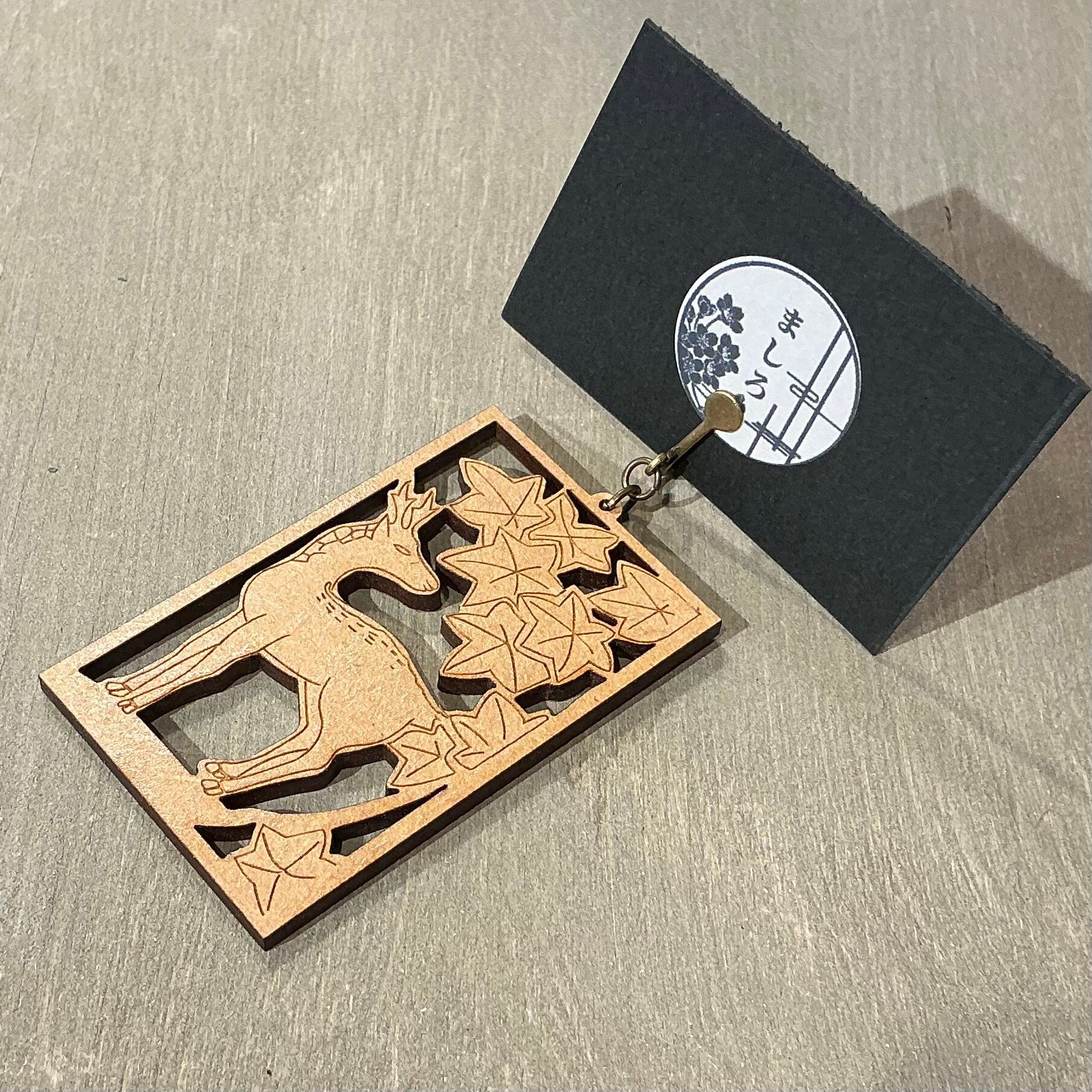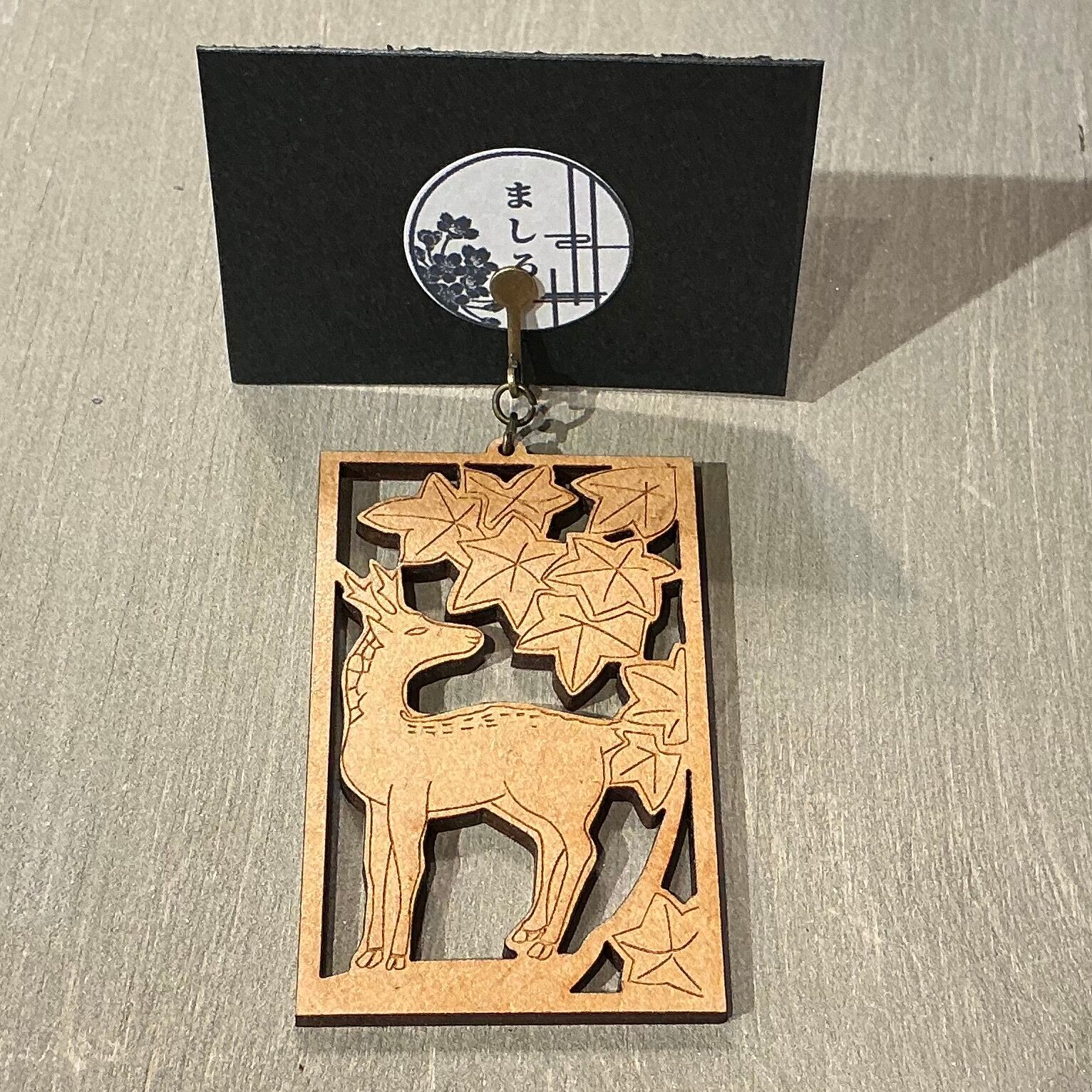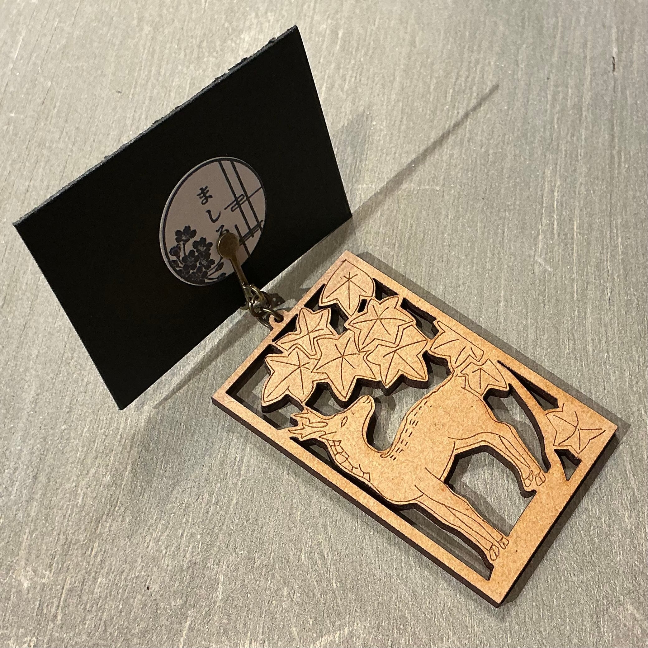 木材で作られた花札の「紅葉に鹿」がモチーフな木彫りイヤリングです。