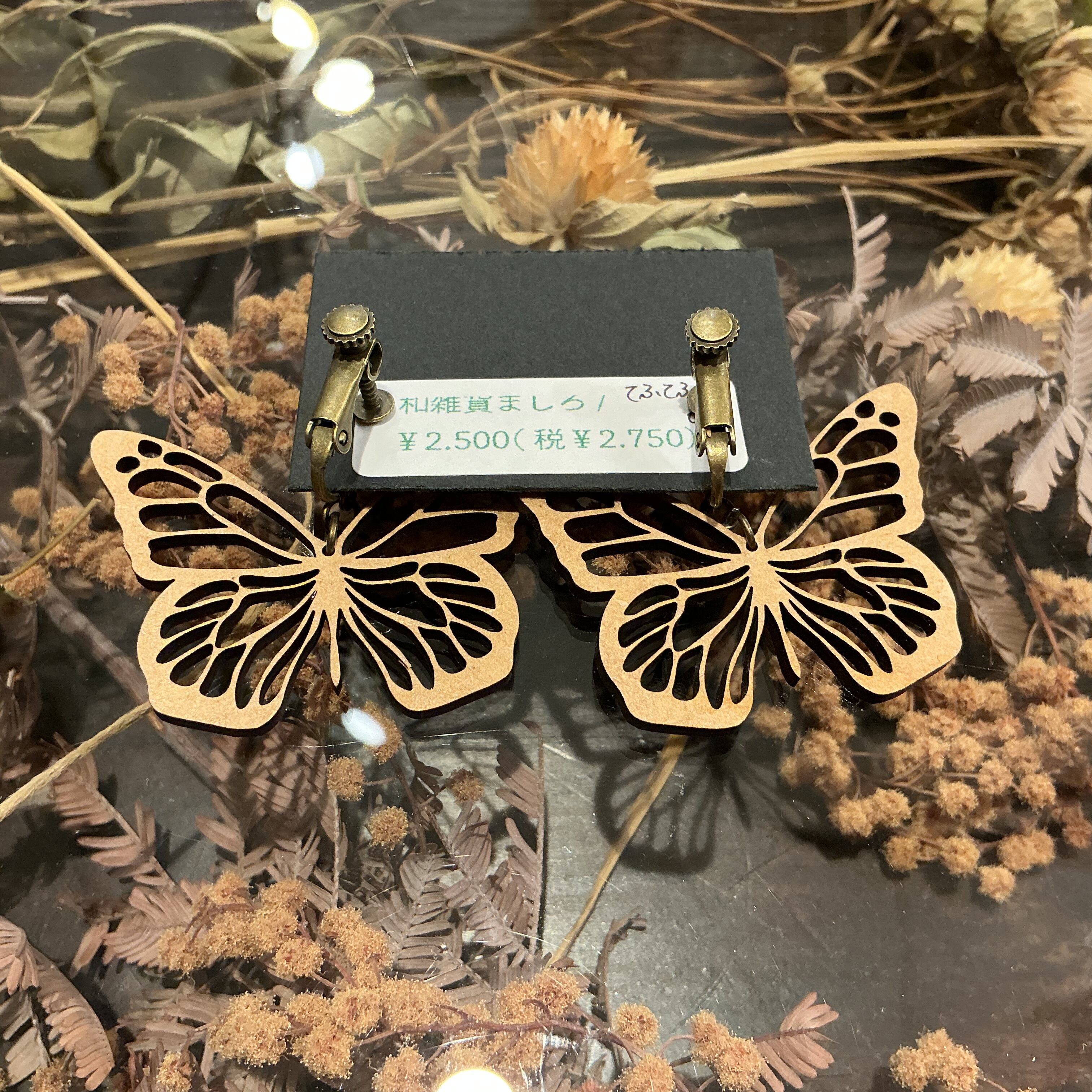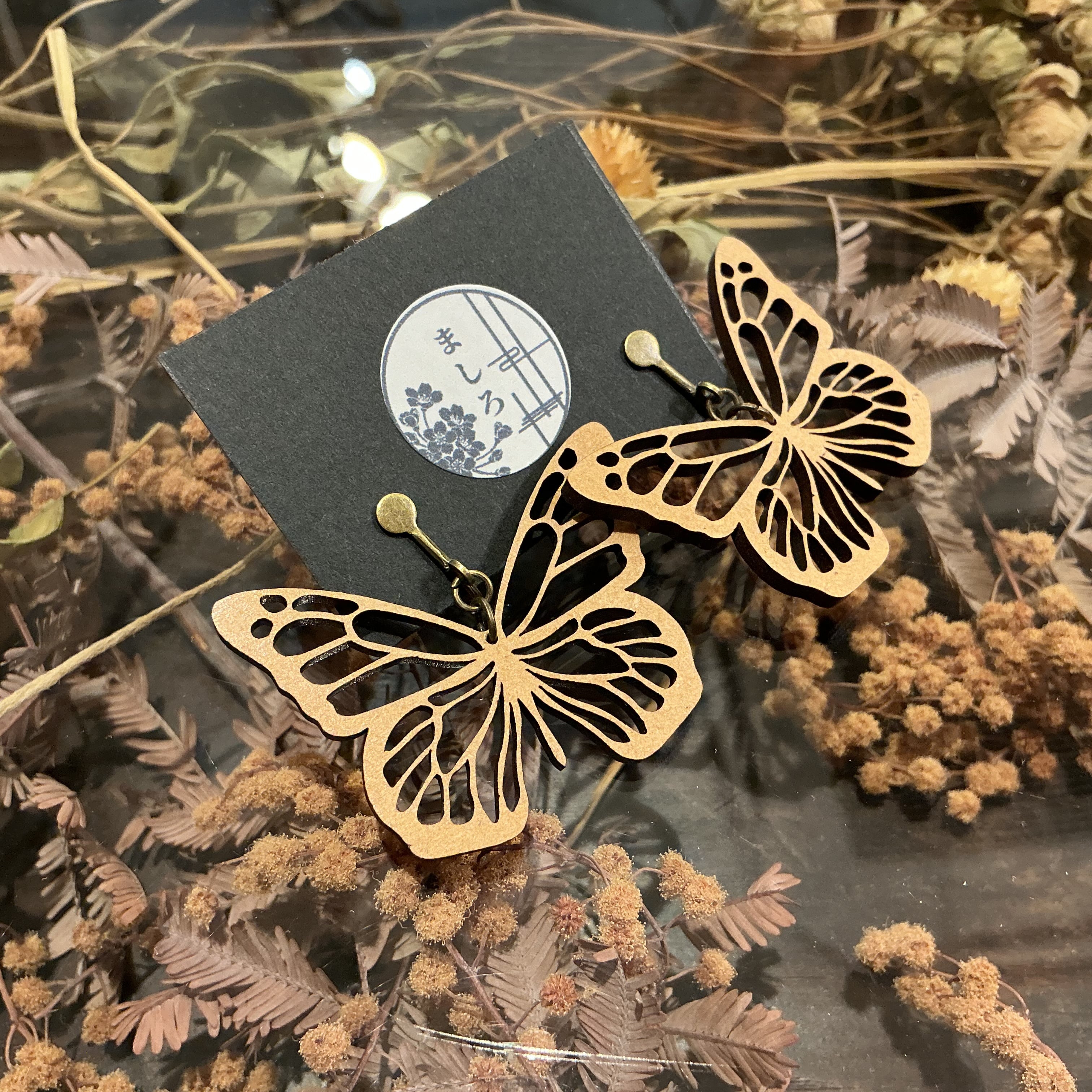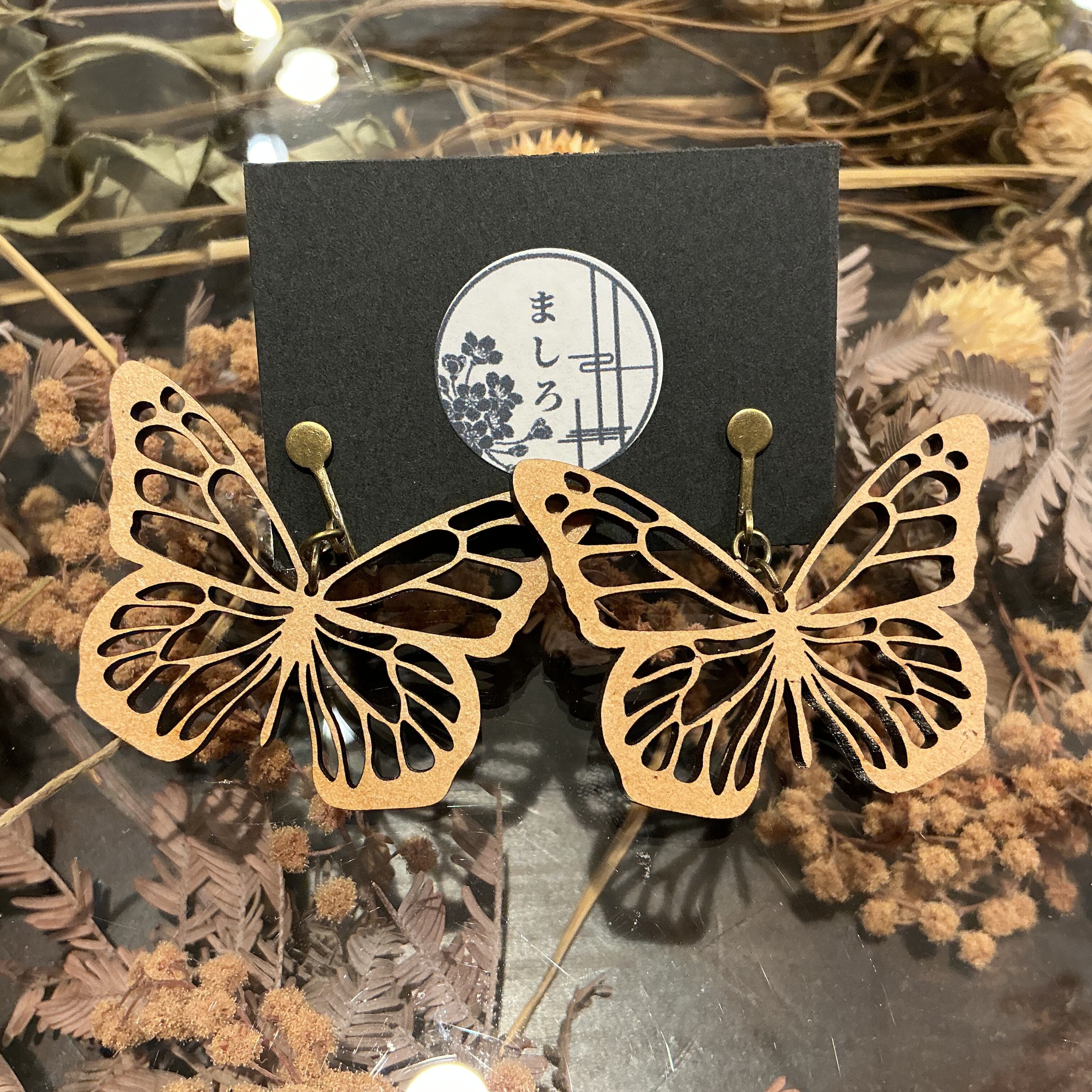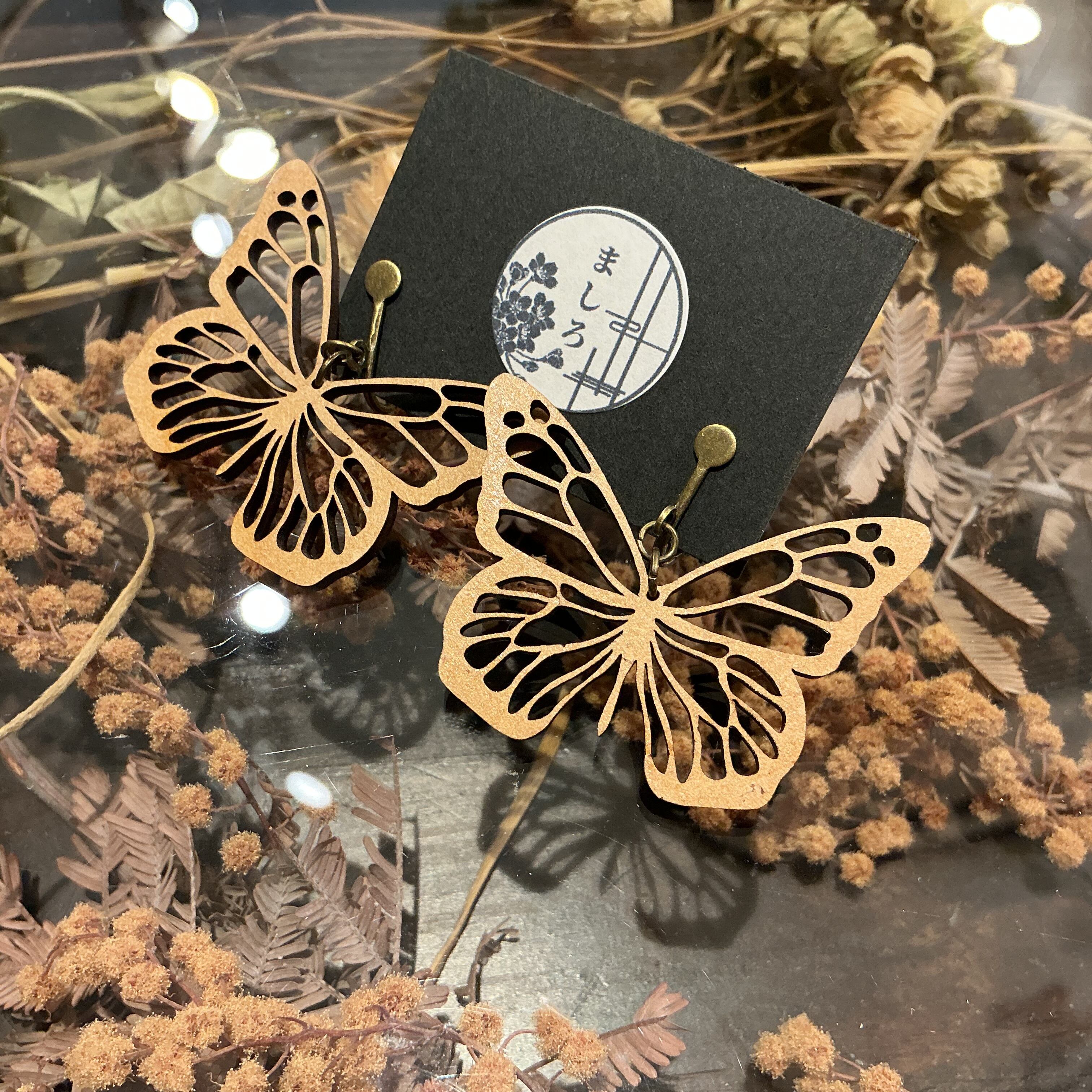木材を彫って作られたてふてふ(ちょうちょ)のイヤリングです✨