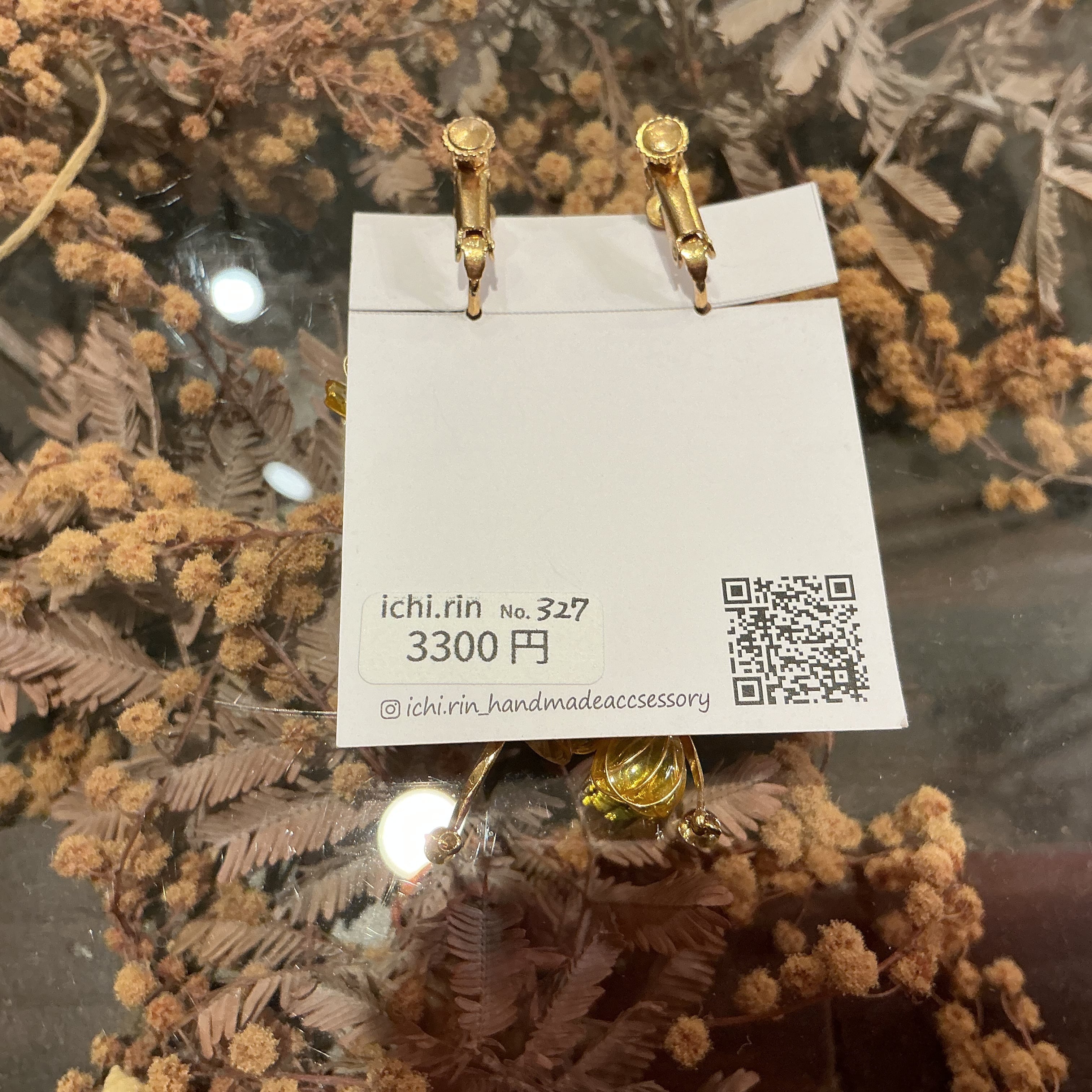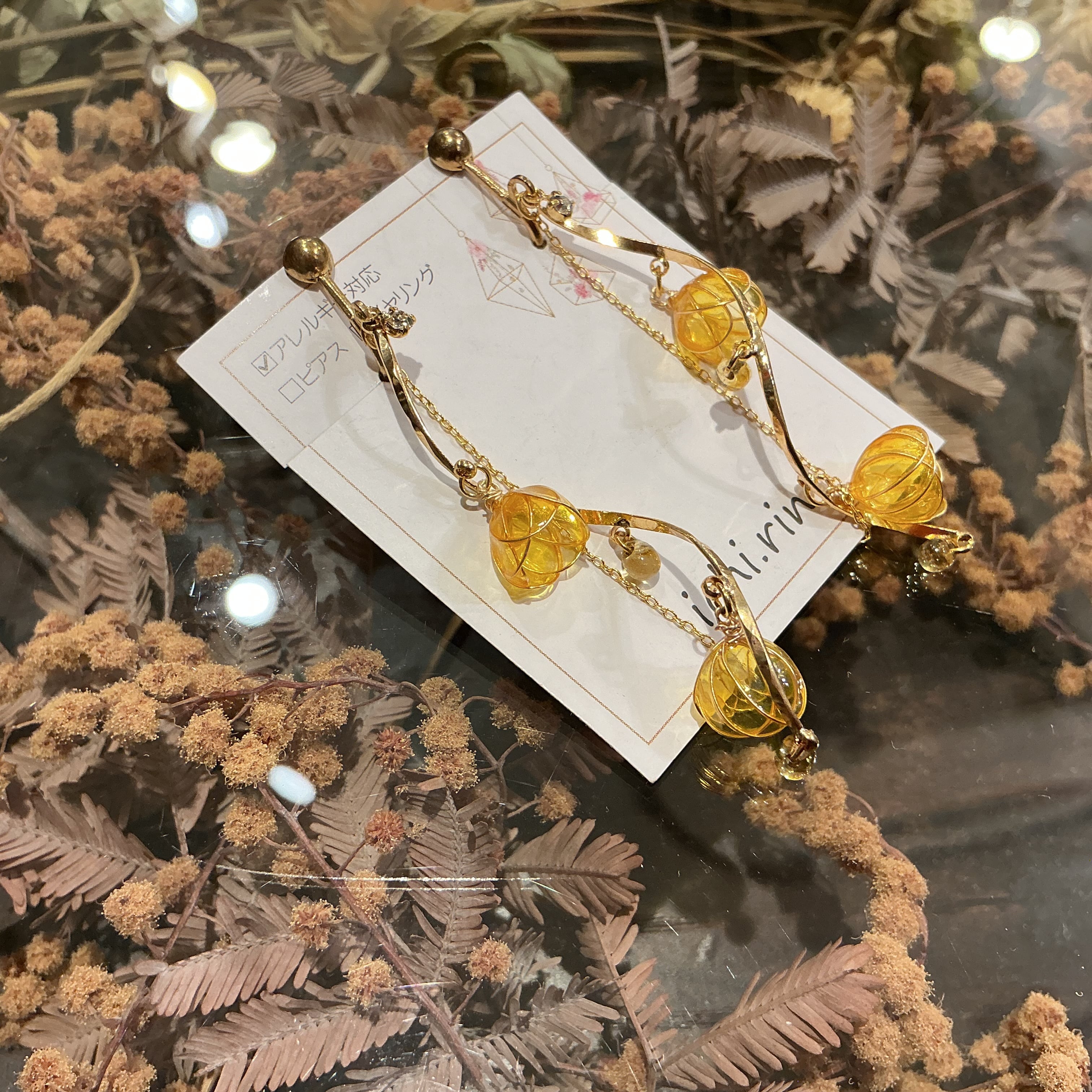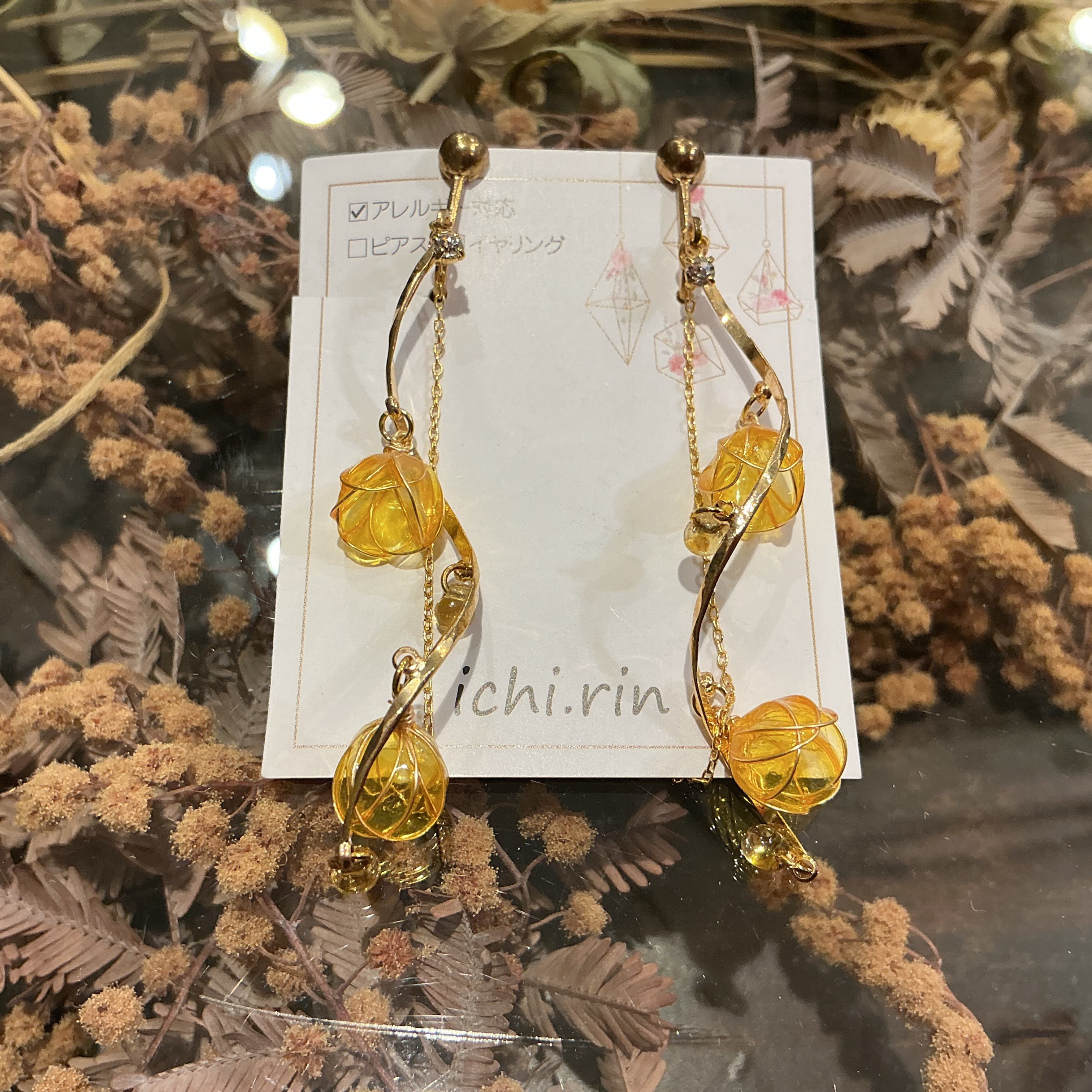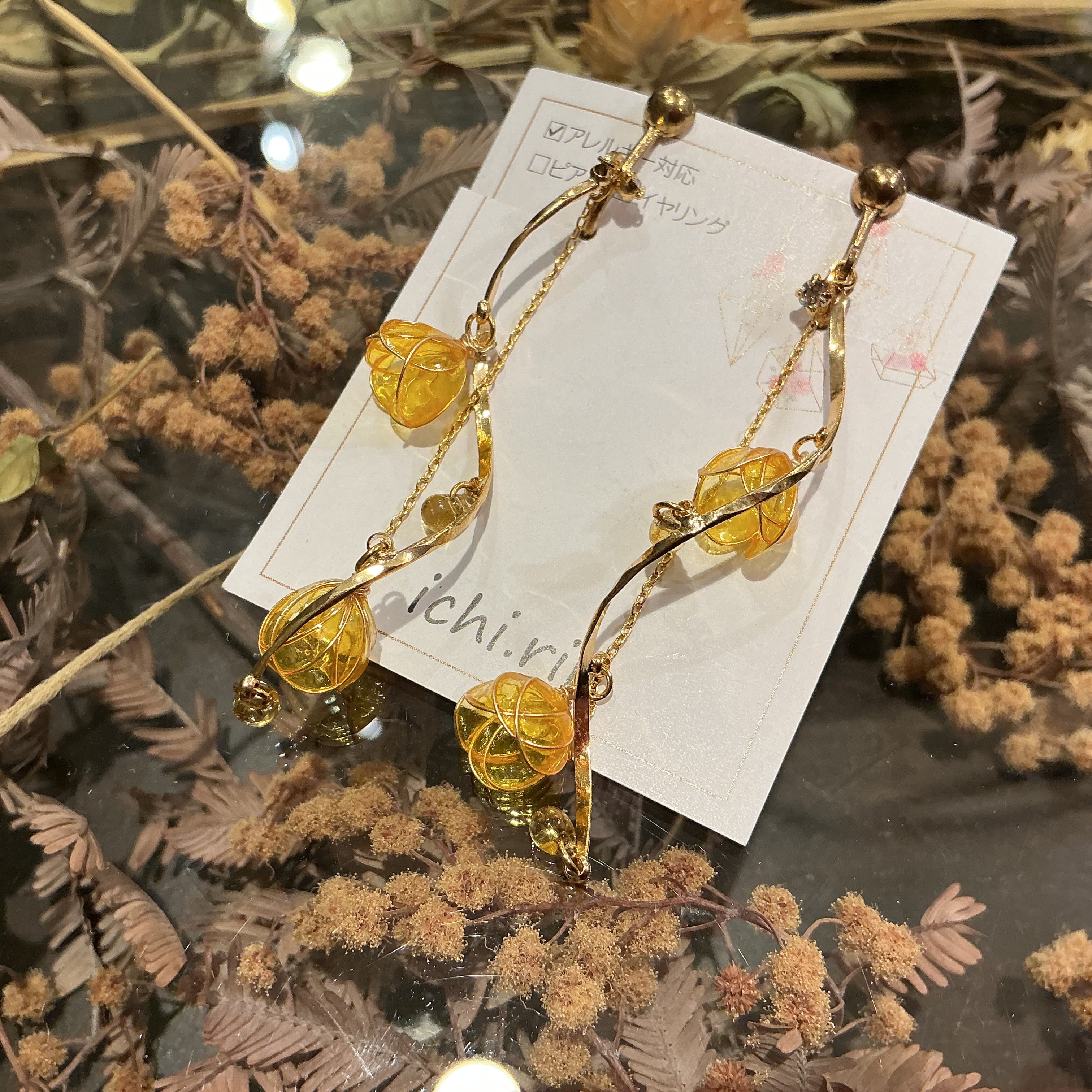 明るく濃い黄色のお花が可愛らしいイヤリングです✨
