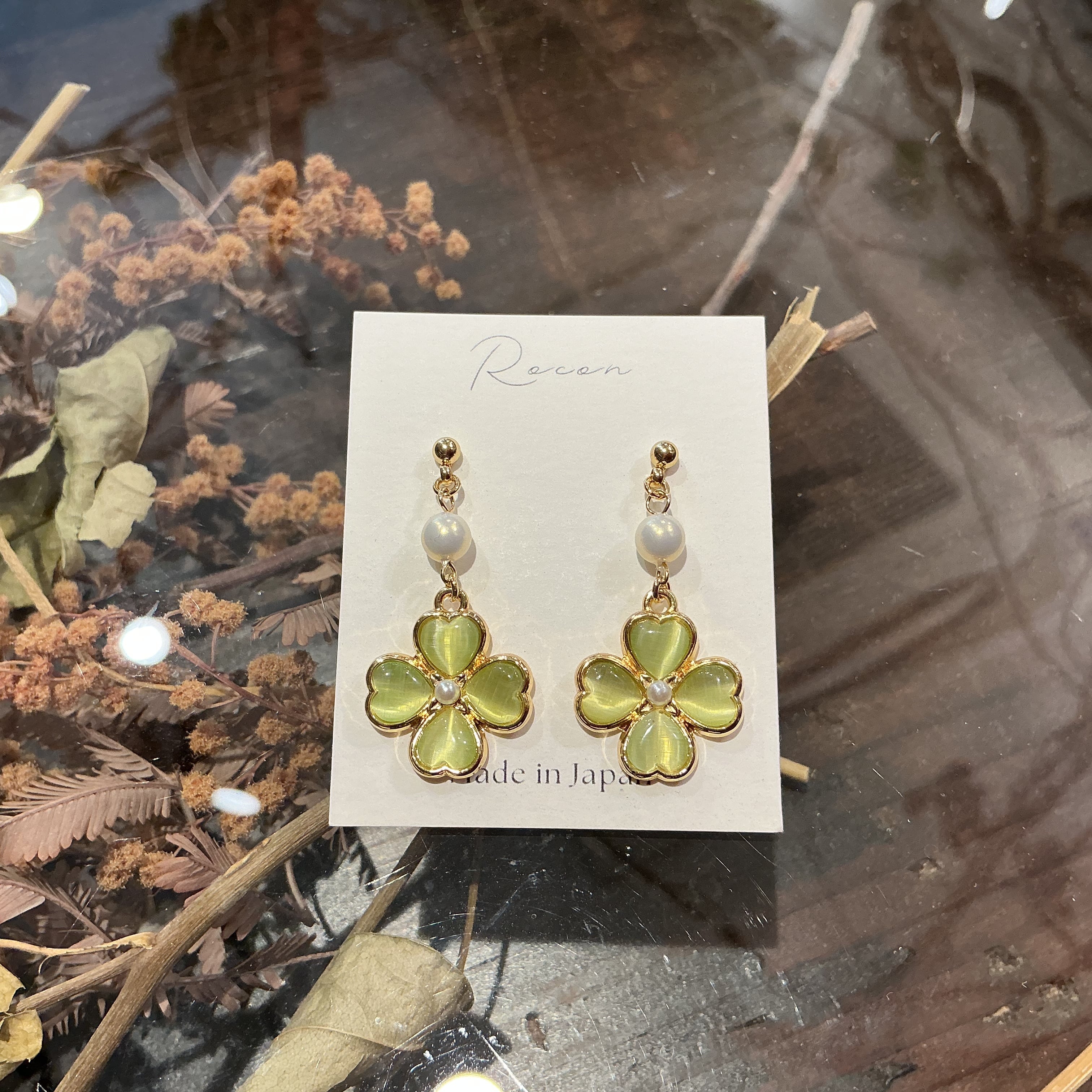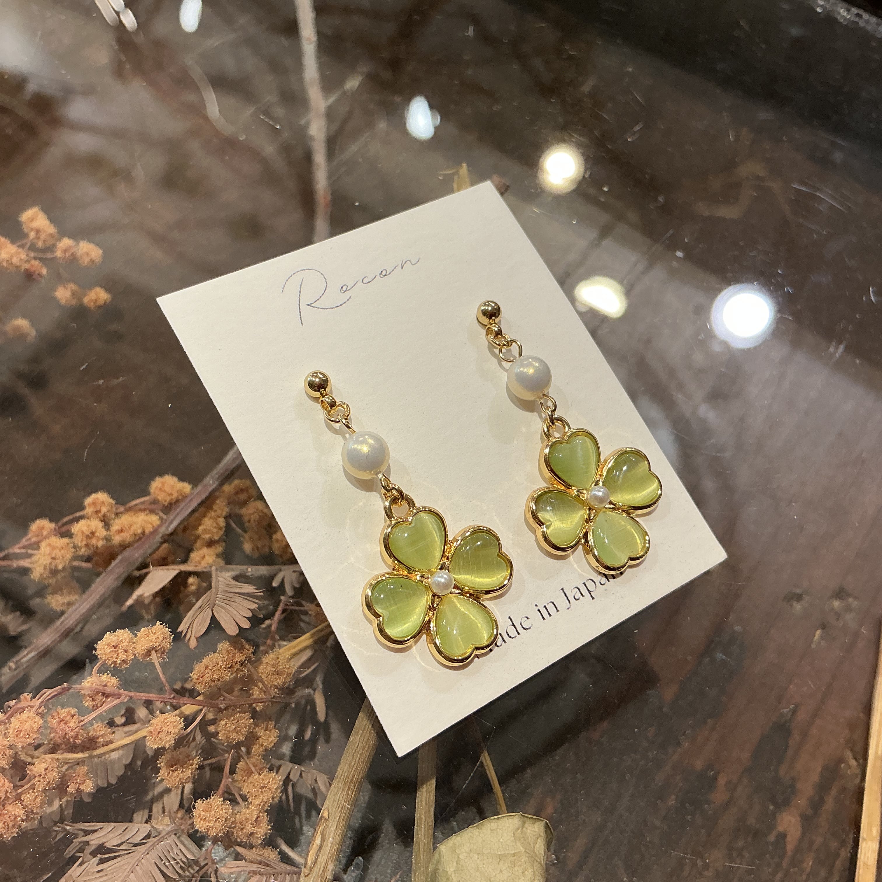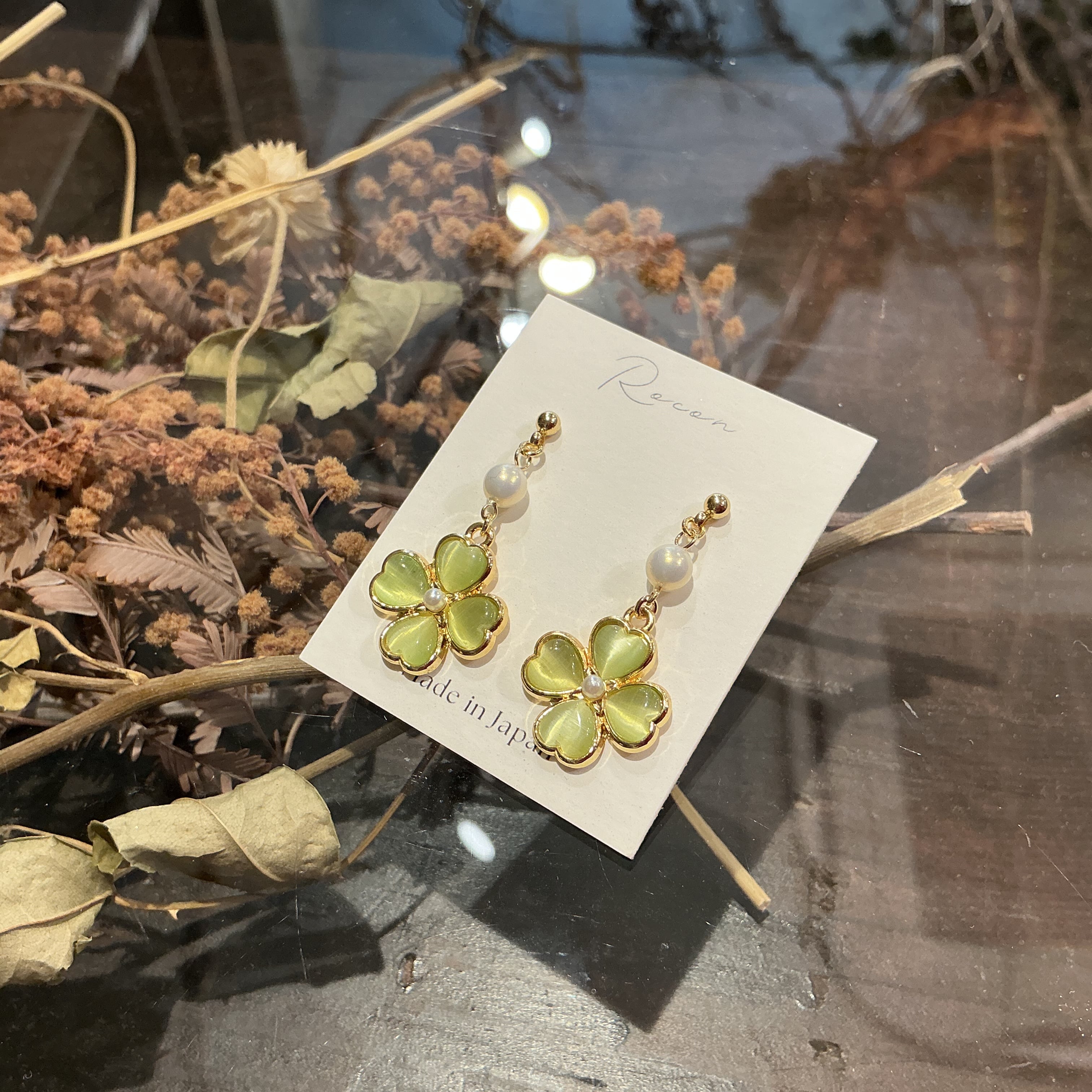 綺麗な黄緑色のクローバーのピアスです。