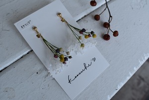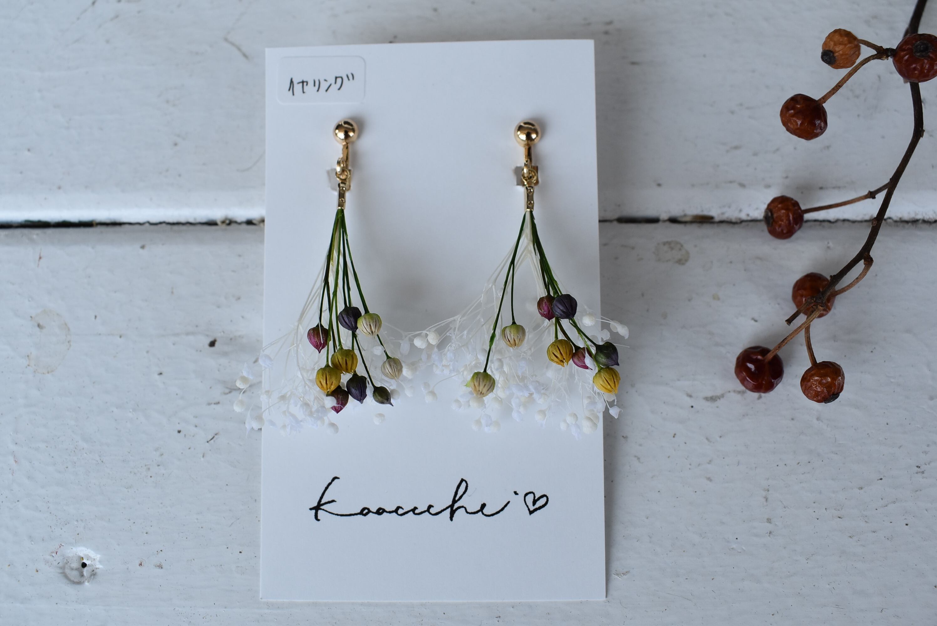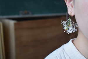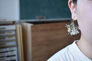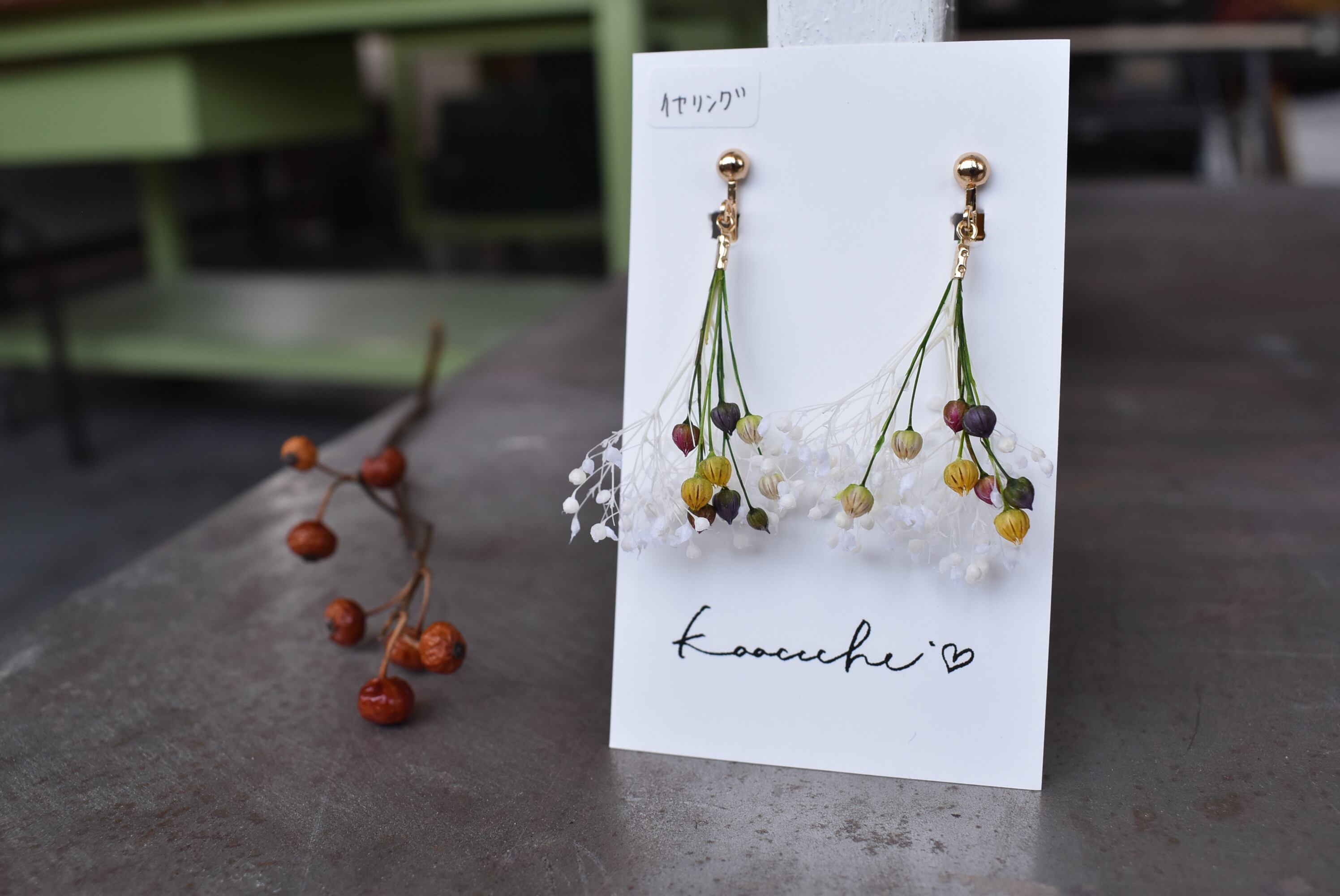 白のかすみ草とリンフラワーのイヤリング&ピアスです。 色味の組み合わせが可愛いアクセサリーです。 コーディネートのポイントにとても良いですね。 ピアス、イヤリング交換可能です。 ハンドメイド&素人による撮影のため、実物の色や大きさが異なる場合がございます。 その点をご了承下さい。 ピアス、イヤリング希望の方は、ご購入の際に必ず備考欄にご連絡を頂きますでしょうか。