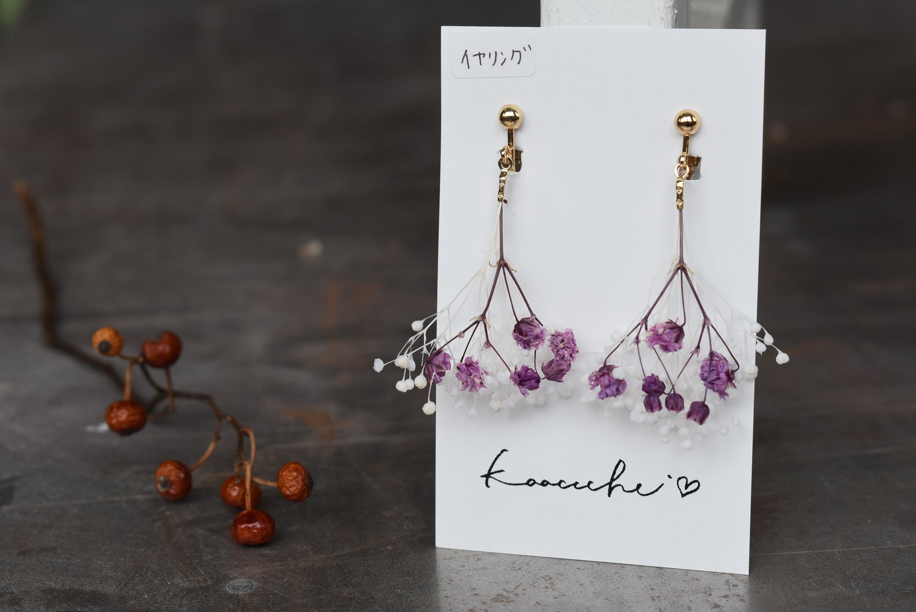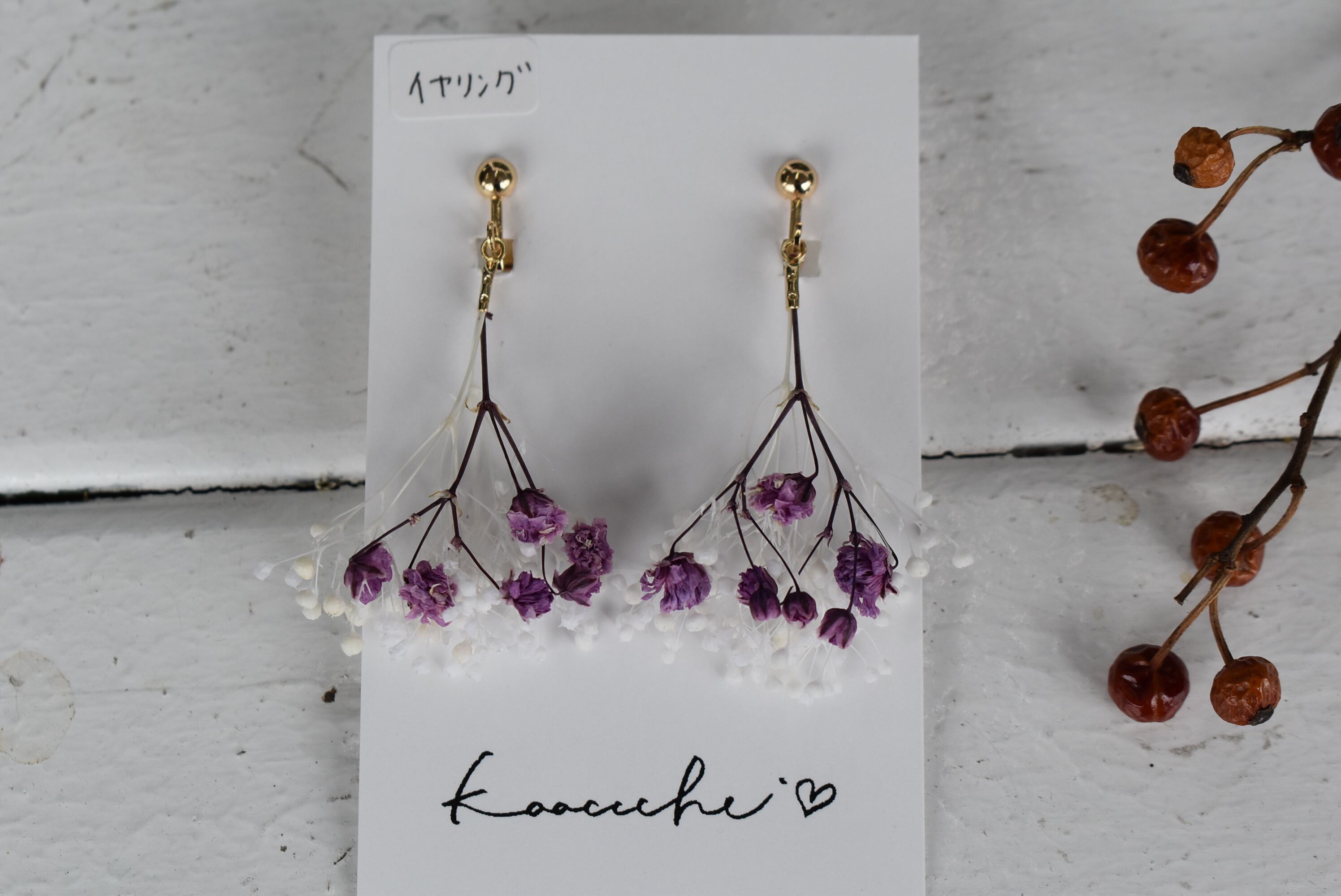 白と紫のかすみ草が合わさったイヤリングです。 お顔周りをふわっと華やかにしてくれ、コーディネートのポイントにもなりますね。 お花がふんわりと優しく可愛らしいアクセサリーです。 ピアス、イヤリング交換可能 ※ピアス、イヤリング変更希望の方は、必ず備考欄にご連絡ください。 2122、2223イヤリング 2121.2120ピアス