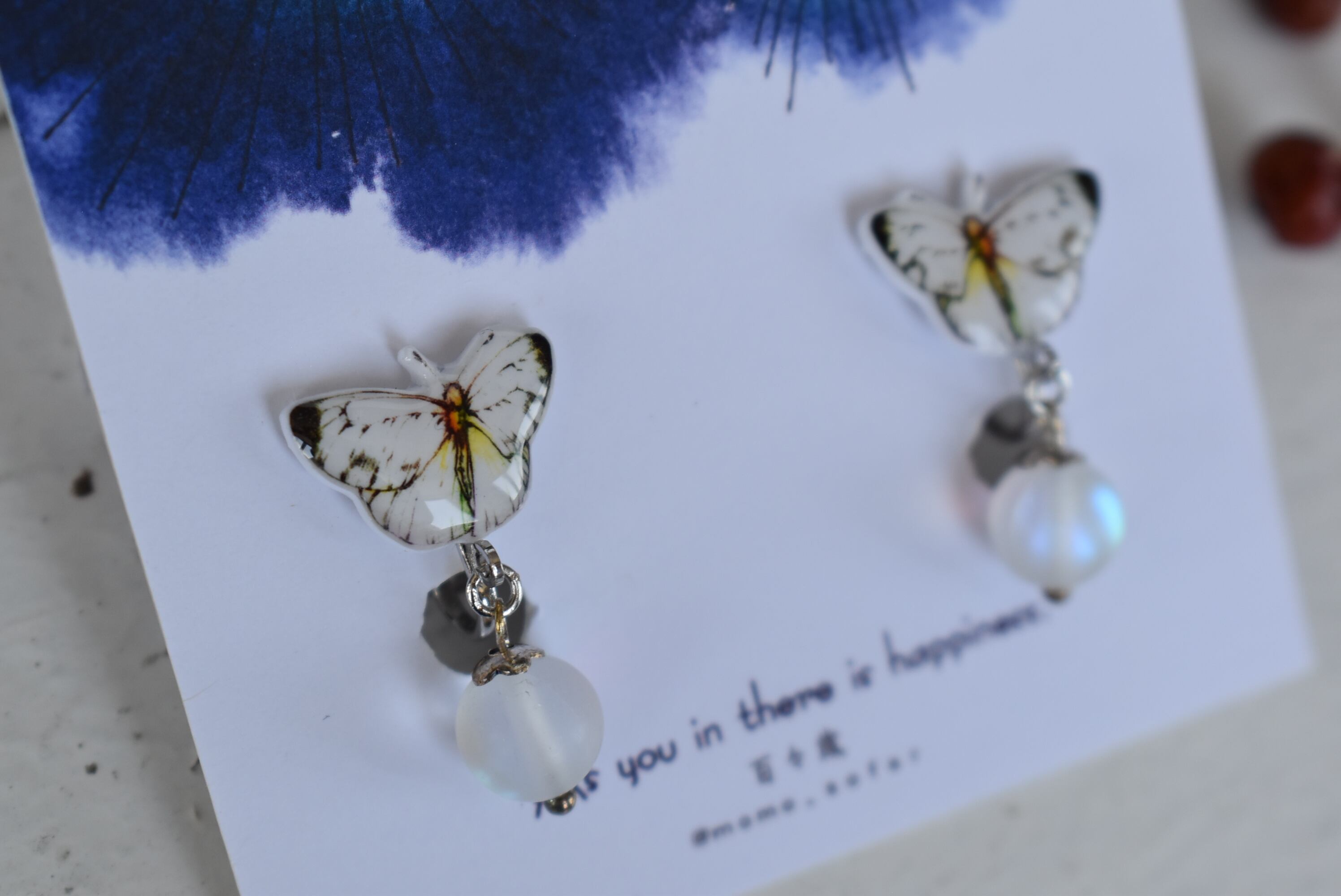 白い蝶々のイヤリングです。 可愛く、美しい蝶々ですね。 耳元でポイントになってくれるアクセサリーです。【132】 イヤリング ニッケルフリー