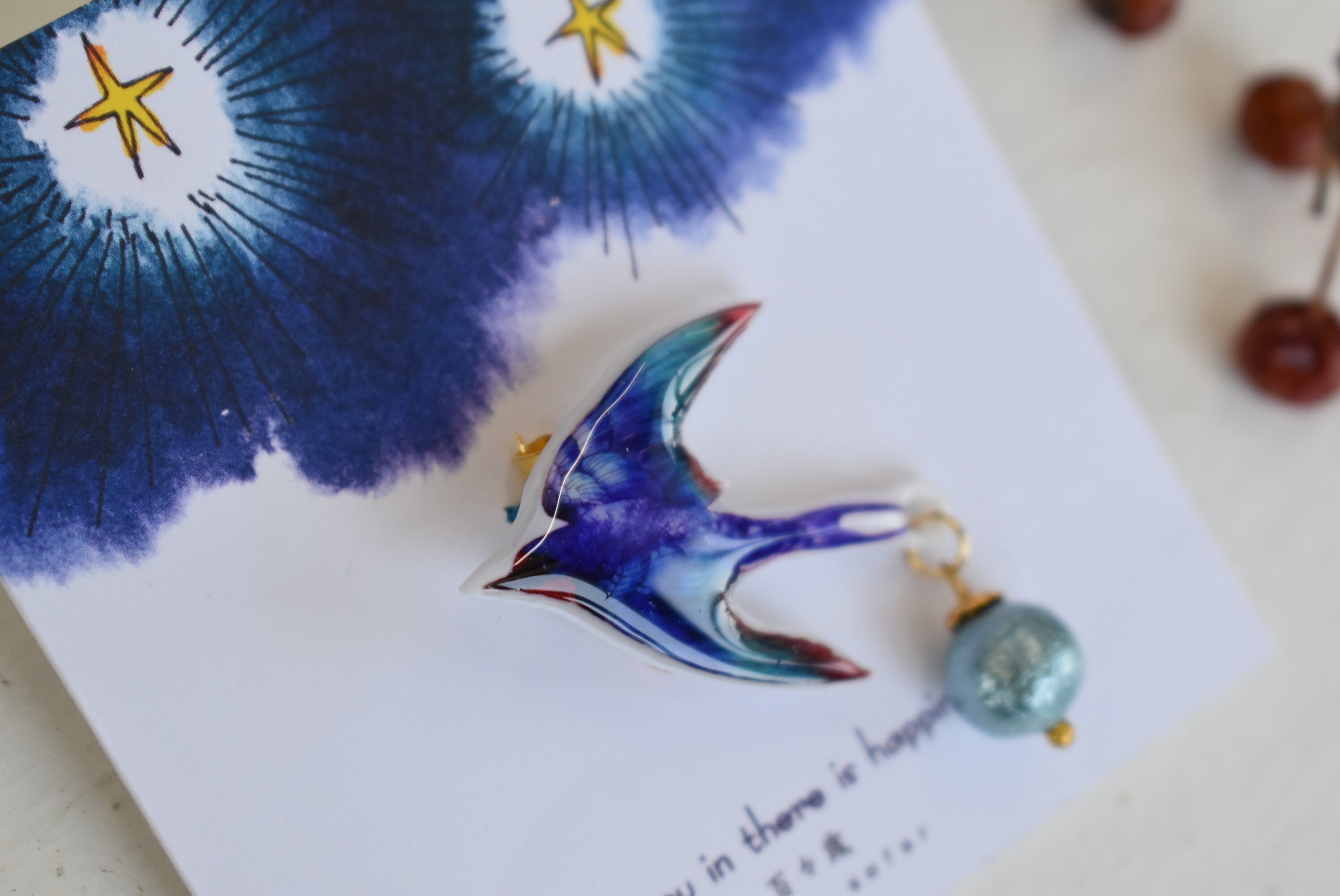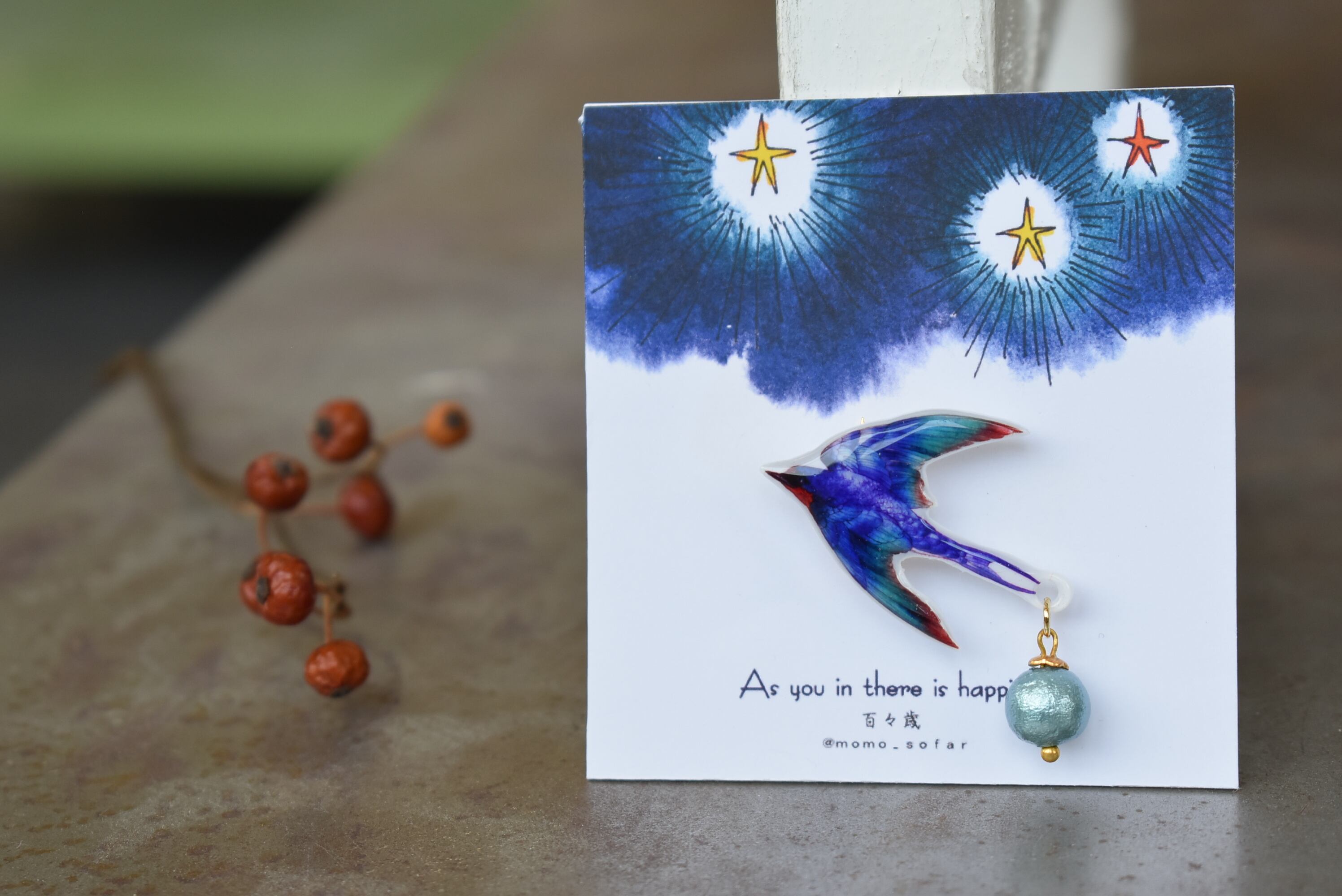 イラストが美しいツバメのブローチです。 水色のパールがついています。 お洋服やバッグなどのワンポイントにとても良いです。【118】