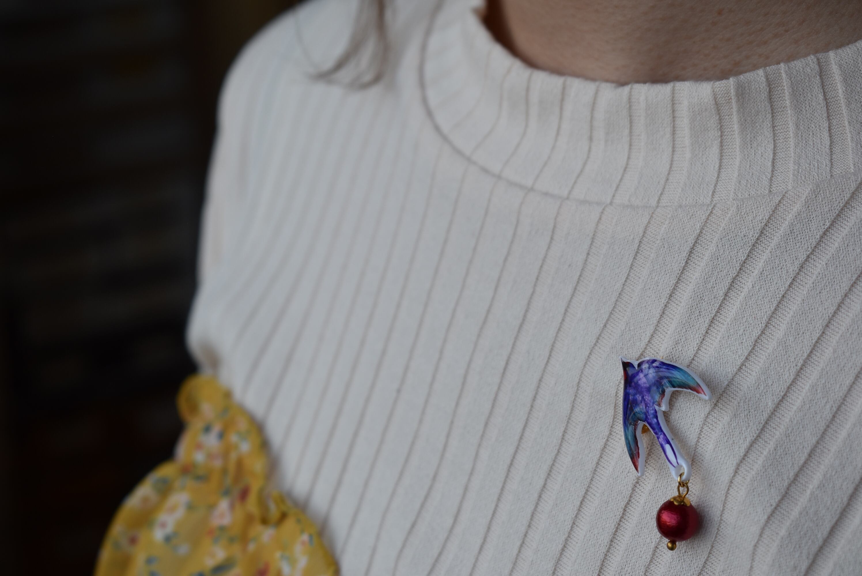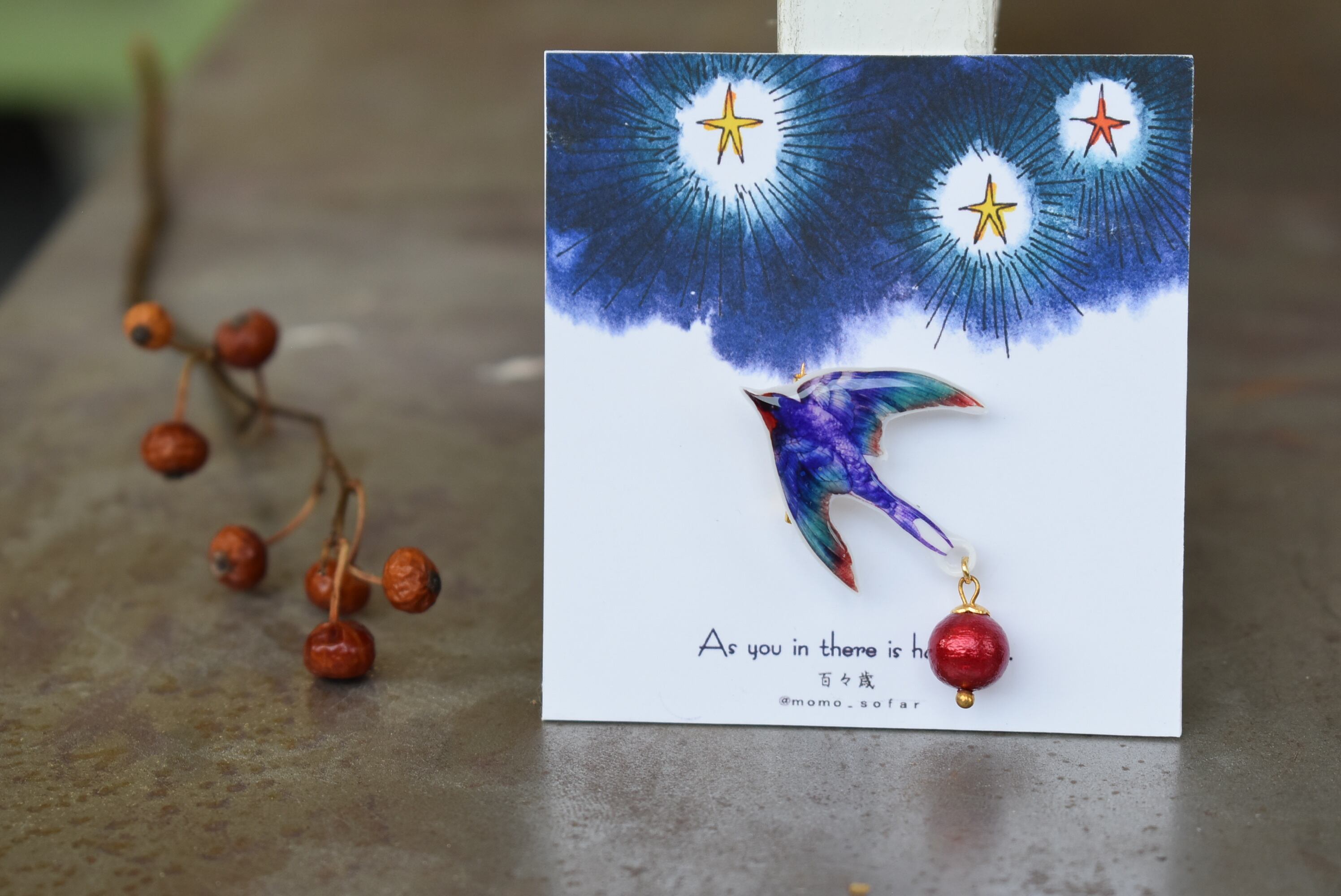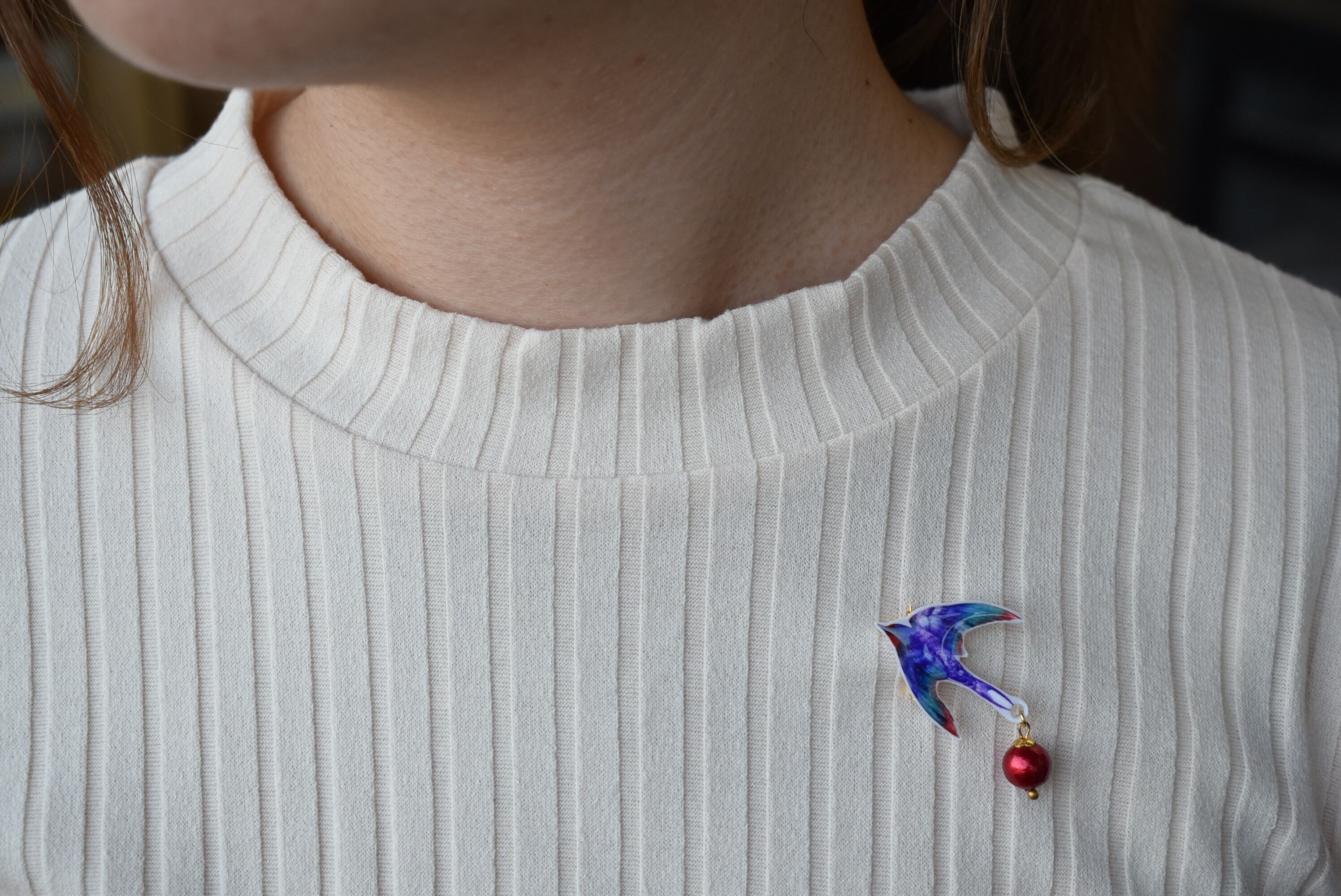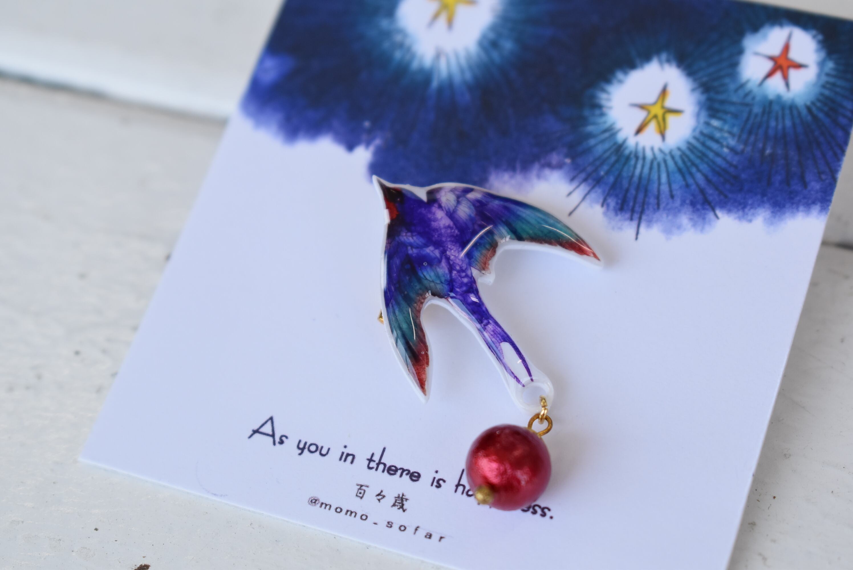 イラストが美しいツバメのブローチです。 赤色のパールがついています。 お洋服やバッグなどのワンポイントにとても良いです。【120】