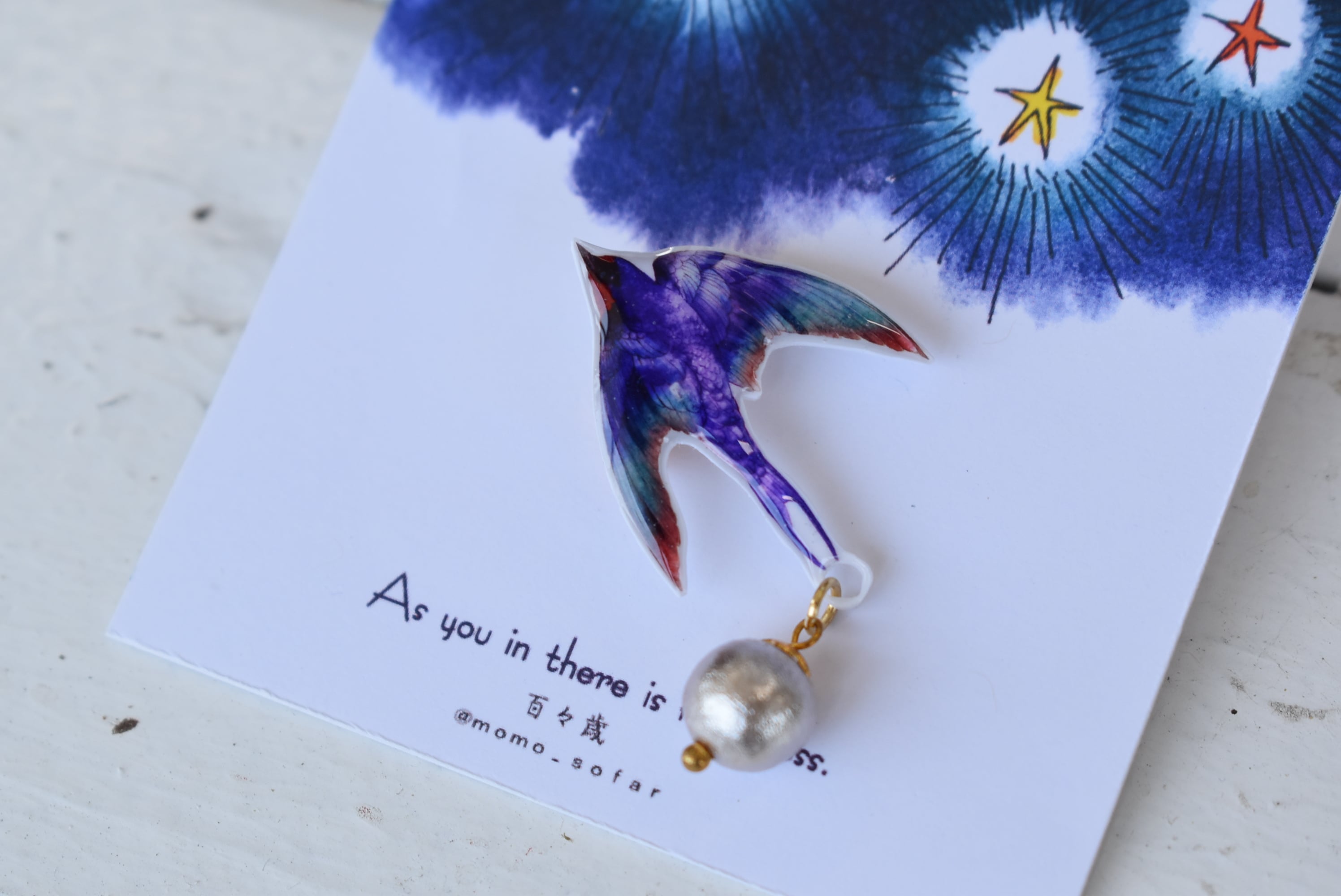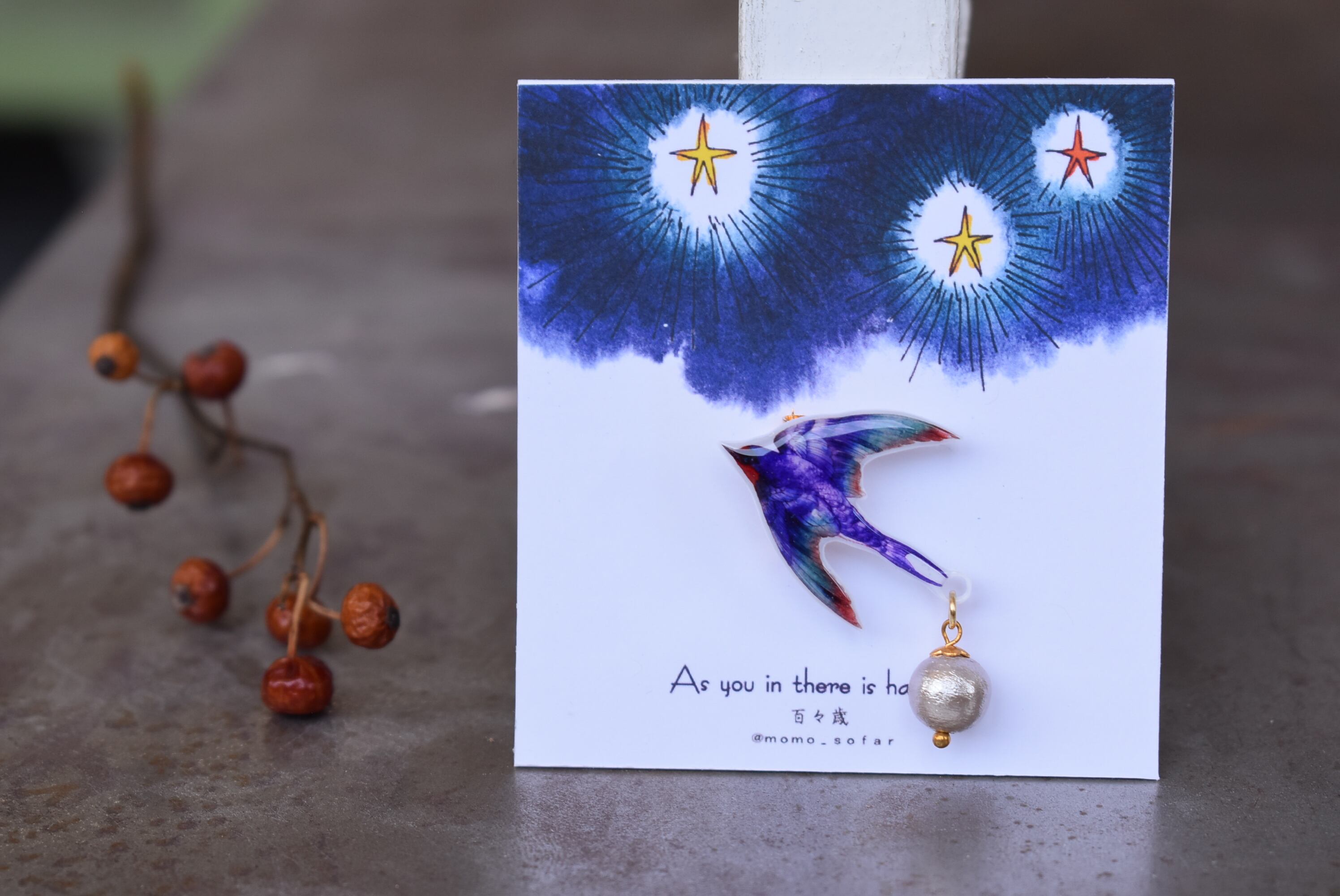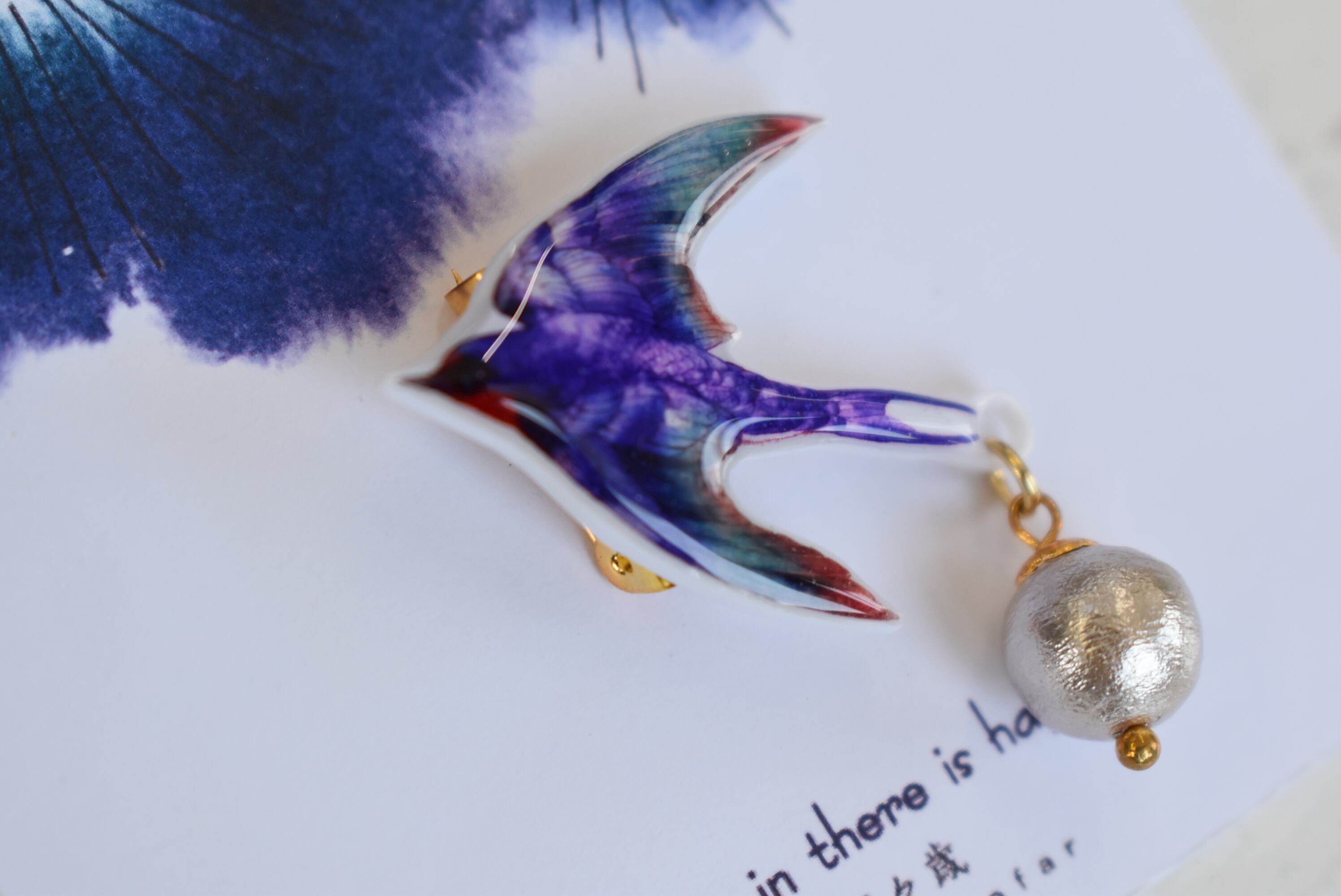 イラストが美しいツバメのブローチです。 白のパールがついています。 お洋服やバッグなどのワンポイントにとても良いです。【116】