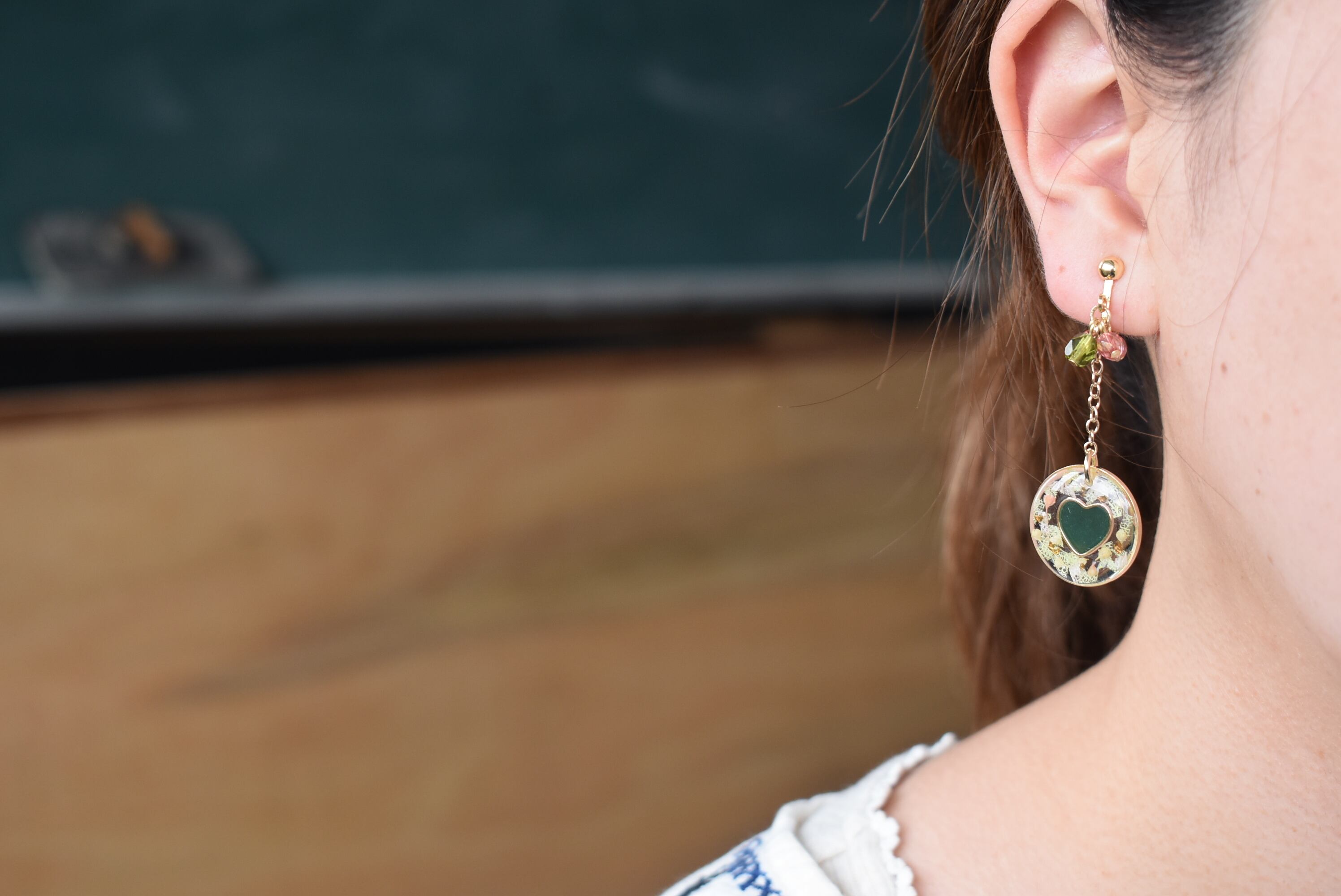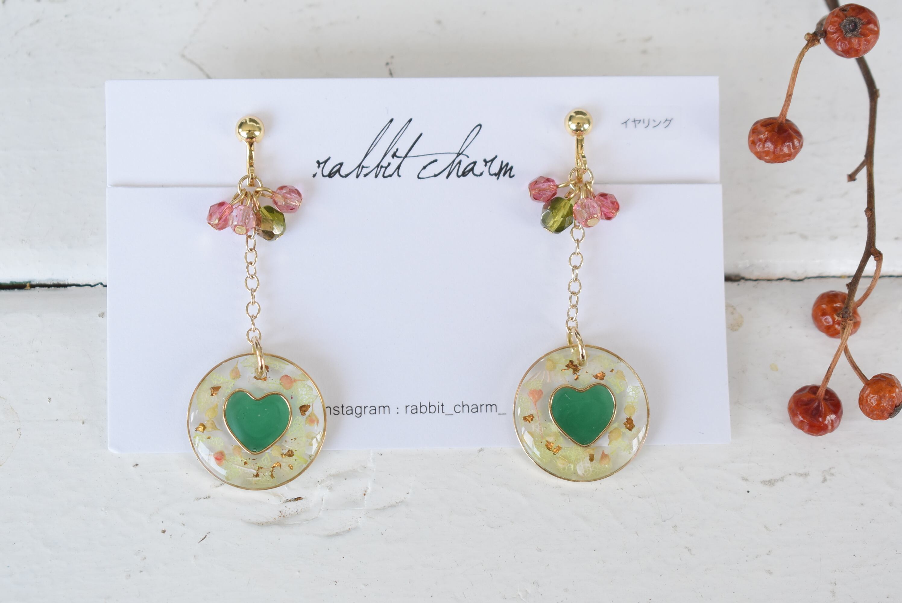 緑のハートがゆらゆら揺れるイヤリングです。 ビーズがキラキラとアクセントになっていて可愛いです。 コーディネートのポイントになりますね。【126】 ピアス変更可能 ハンドメイド&素人による撮影のため、実物の色や大きさが異なる場合がございます。 その点をご了承下さい。 ピアスご希望の方は、ご購入の際に必ずご連絡を頂きますでしょうか。 ピアスは金属タイプです。