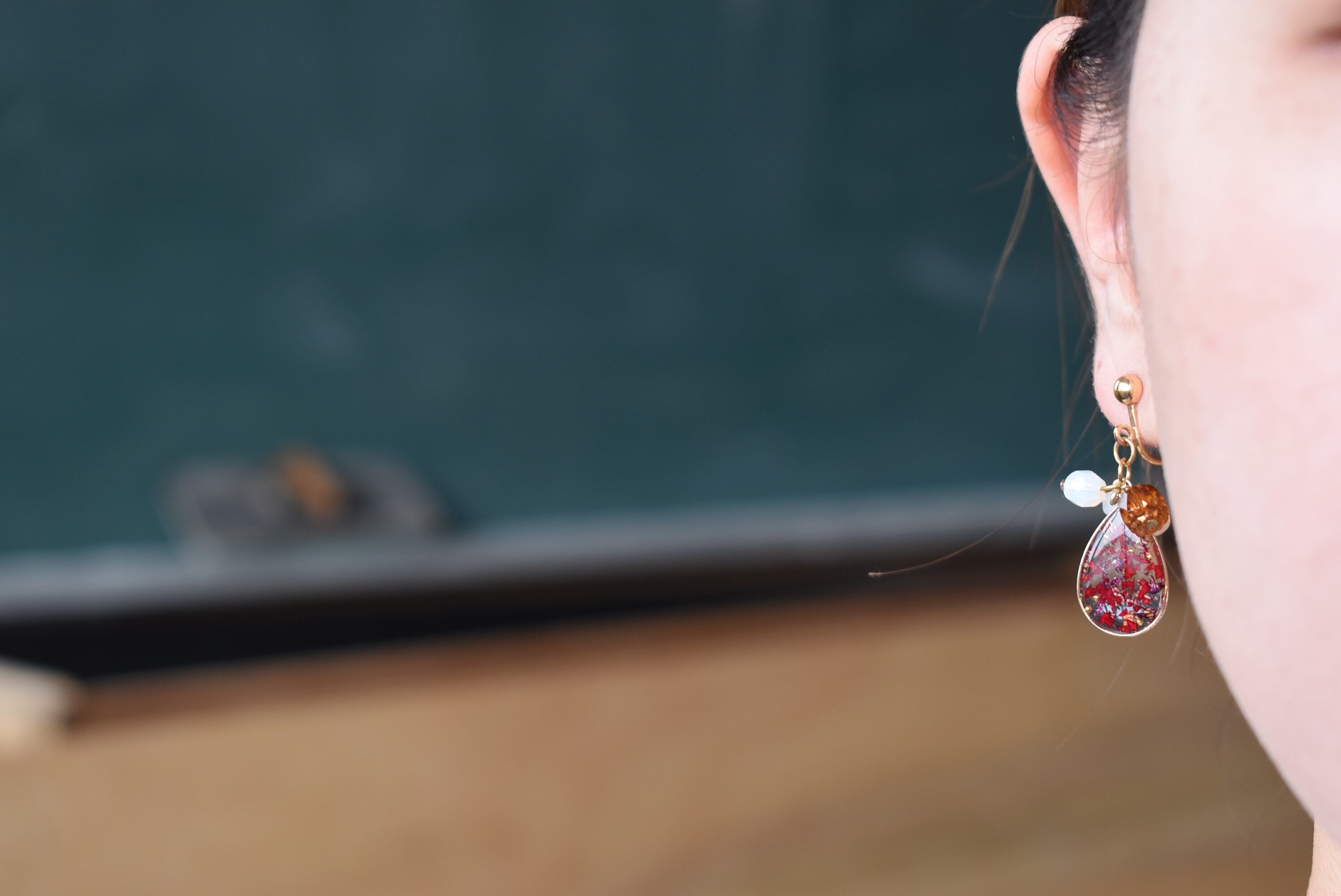 赤いお花が散りばめられていて耳元で映えるイヤリングですね。 ビーズがアクセントになっていて素敵です。 大人な雰囲気のアクセサリーですね。【90】 ピアス変更可能 ハンドメイド&素人による撮影のため、実物の色や大きさが異なる場合がございます。 その点をご了承下さい。 ピアスご希望の方は、ご購入の際に必ずご連絡を頂きますでしょうか。 ピアスは金属タイプです。