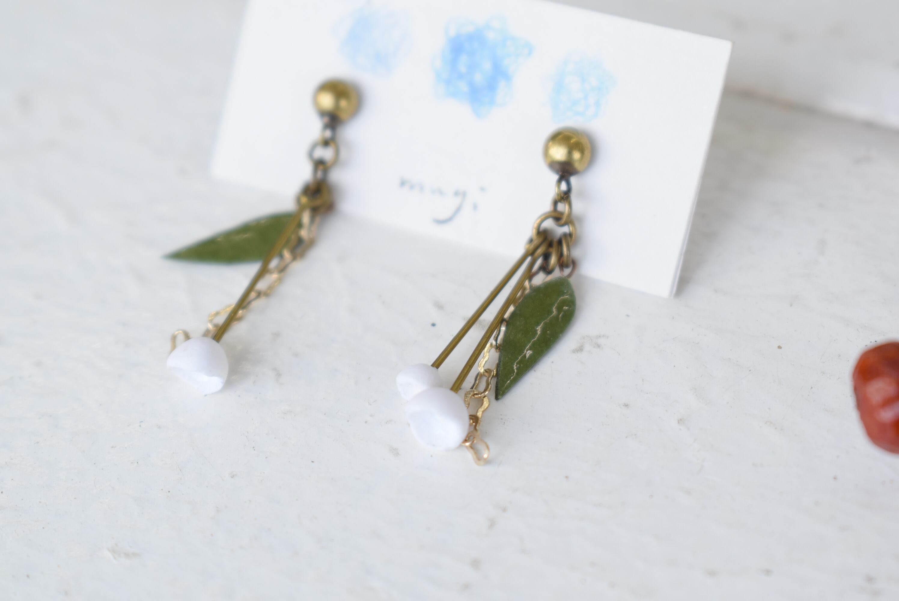 小ぶりなすずらんが可愛らしく揺れるピアスです。 優しく落ち着いた印象の素敵なアクセサリーです。【a157】【a157】 チタンピアス イヤリング変更可能 ハンドメイド&素人による撮影のため、実物の色や大きさが異なる場合がございます。 その点をご了承下さい。 イヤリングご希望の方は、ご購入の際に必ずご連絡を頂きますでしょうか。 イヤリングは金属タイプと樹脂タイプがございます。