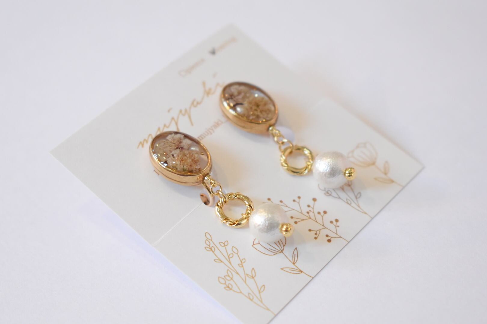 mujyakiさん制作のコットンパールとお花のイヤリングです^ ^ とても素敵なアクセサリーです! 【今-147】