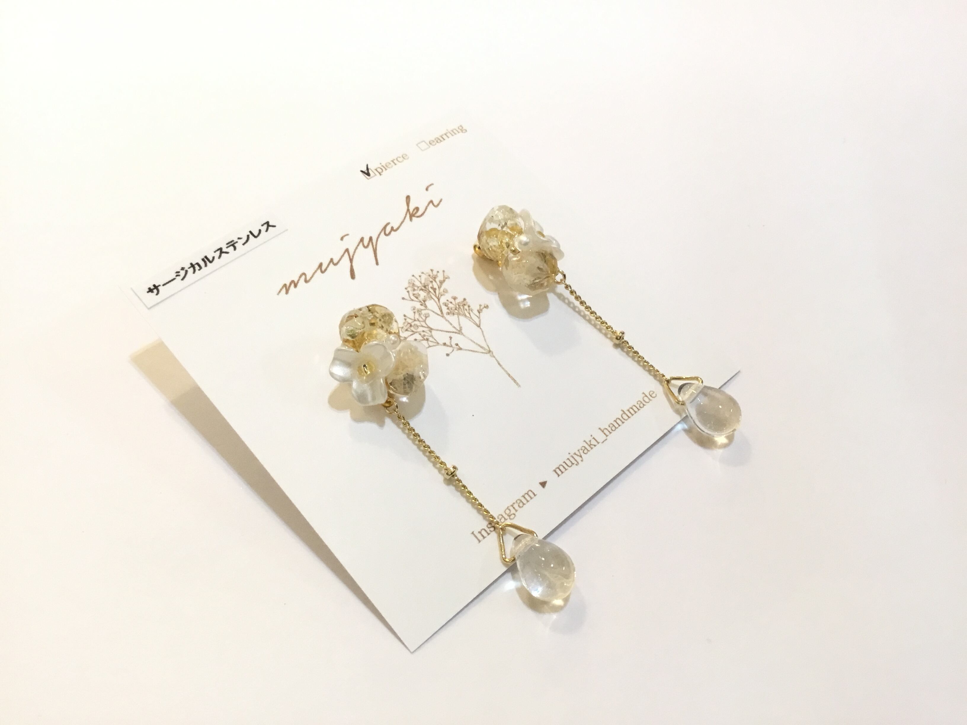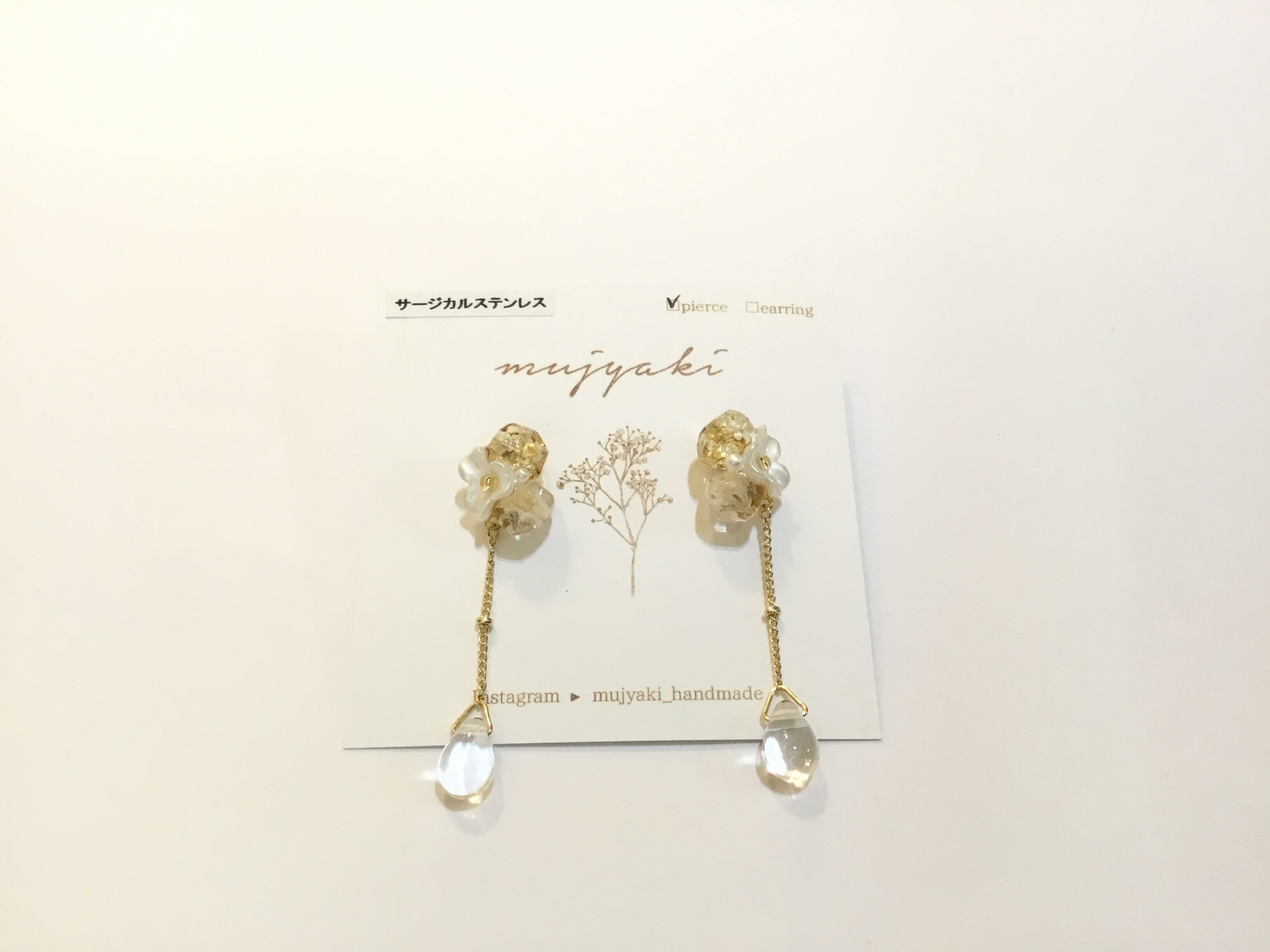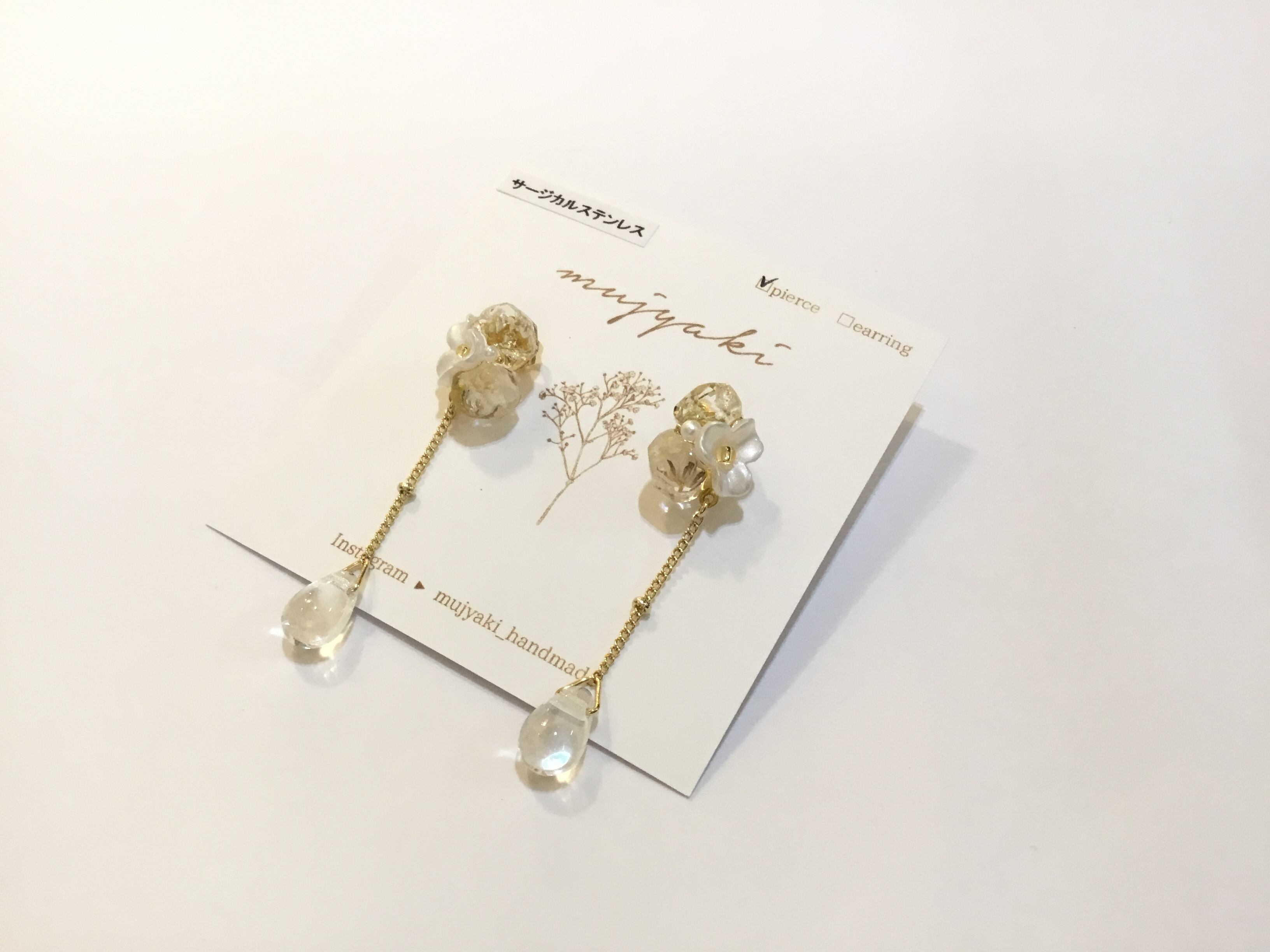 つぶつぶとお花が可愛い、ピアスです。 一粒一粒に、お花が封入されています。 ゆらゆら揺れるドロップが、また可愛いです。 八坂 247