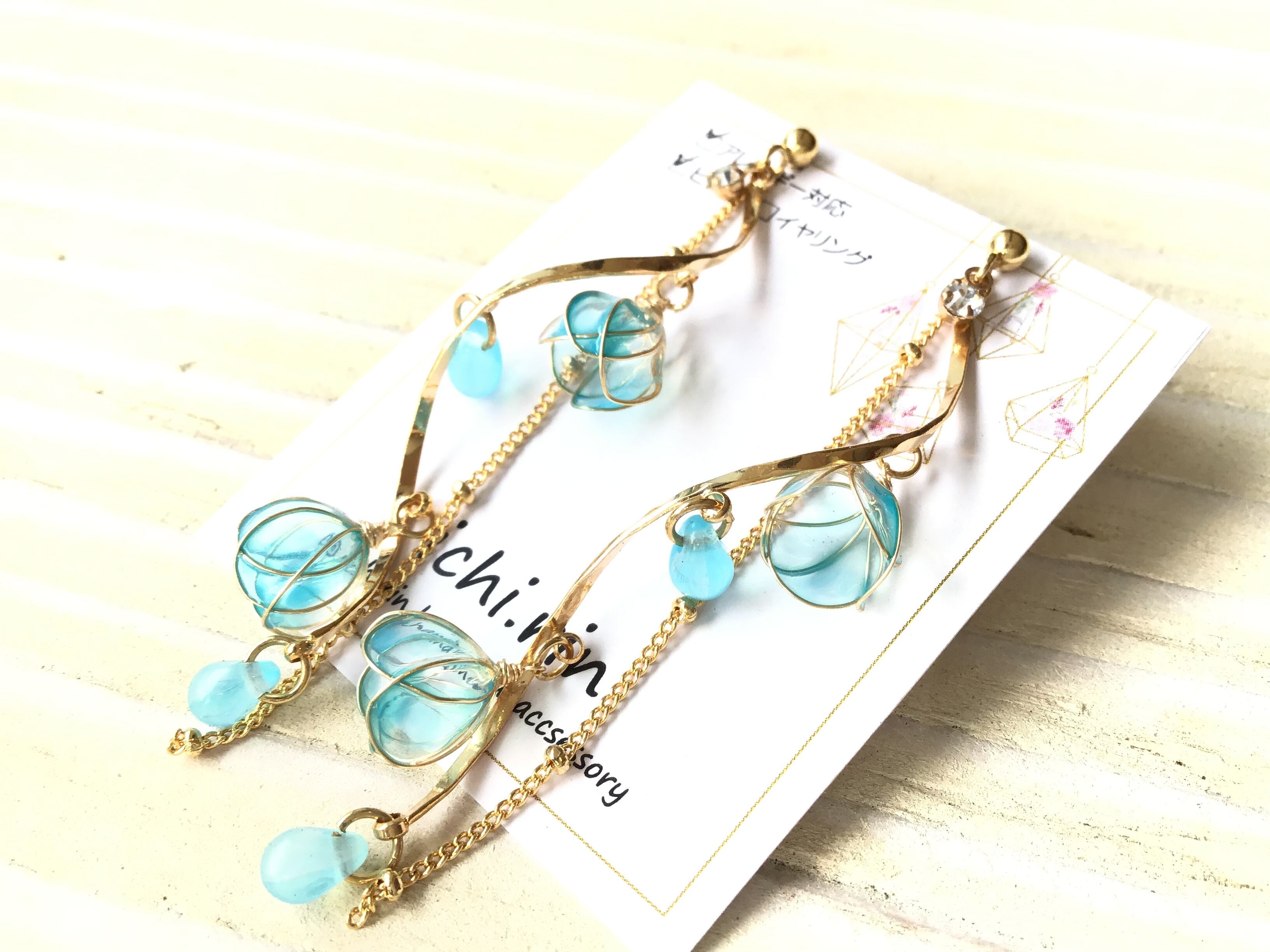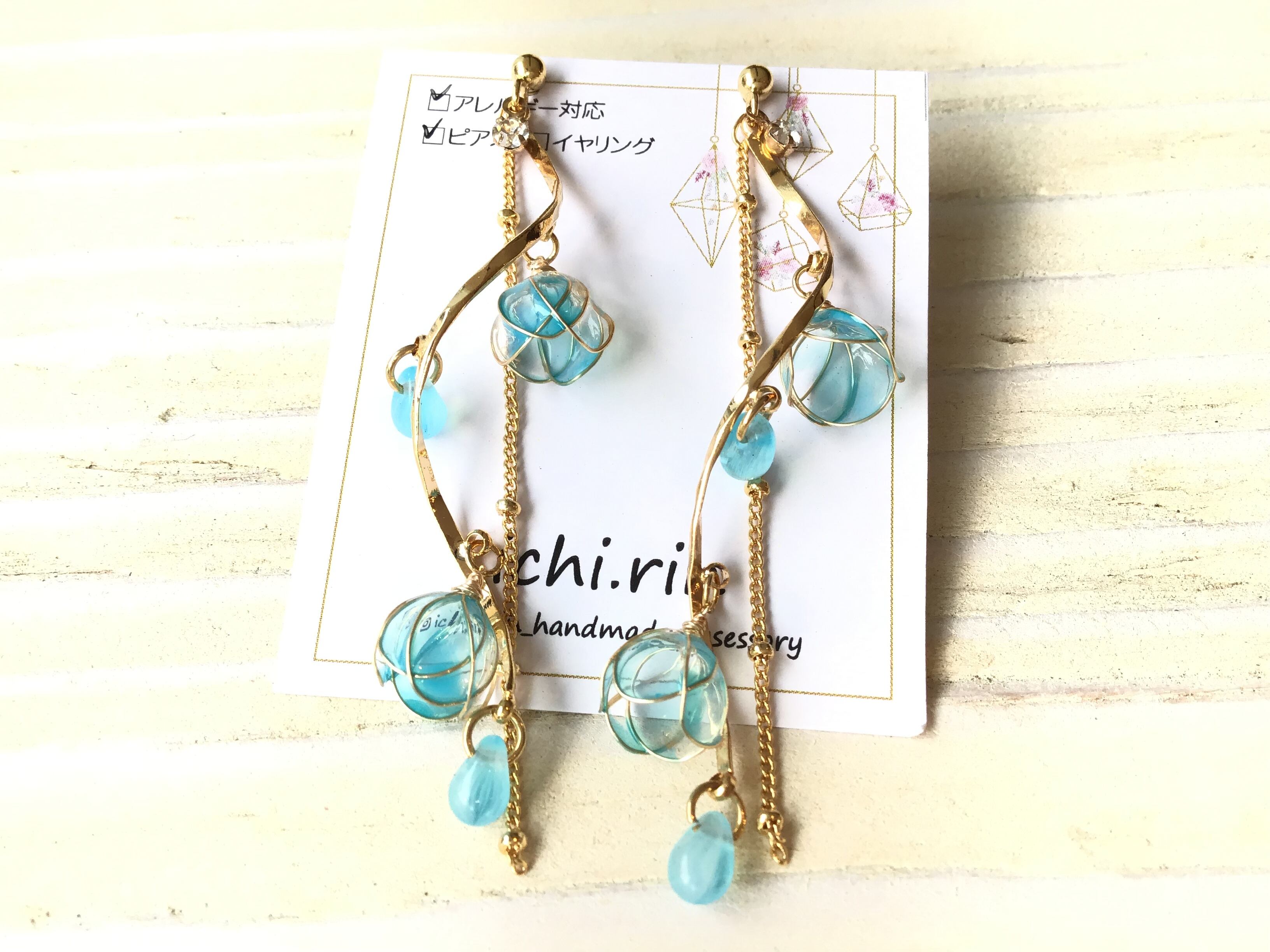 製作のクリアブルーのフラワーピアスです♡