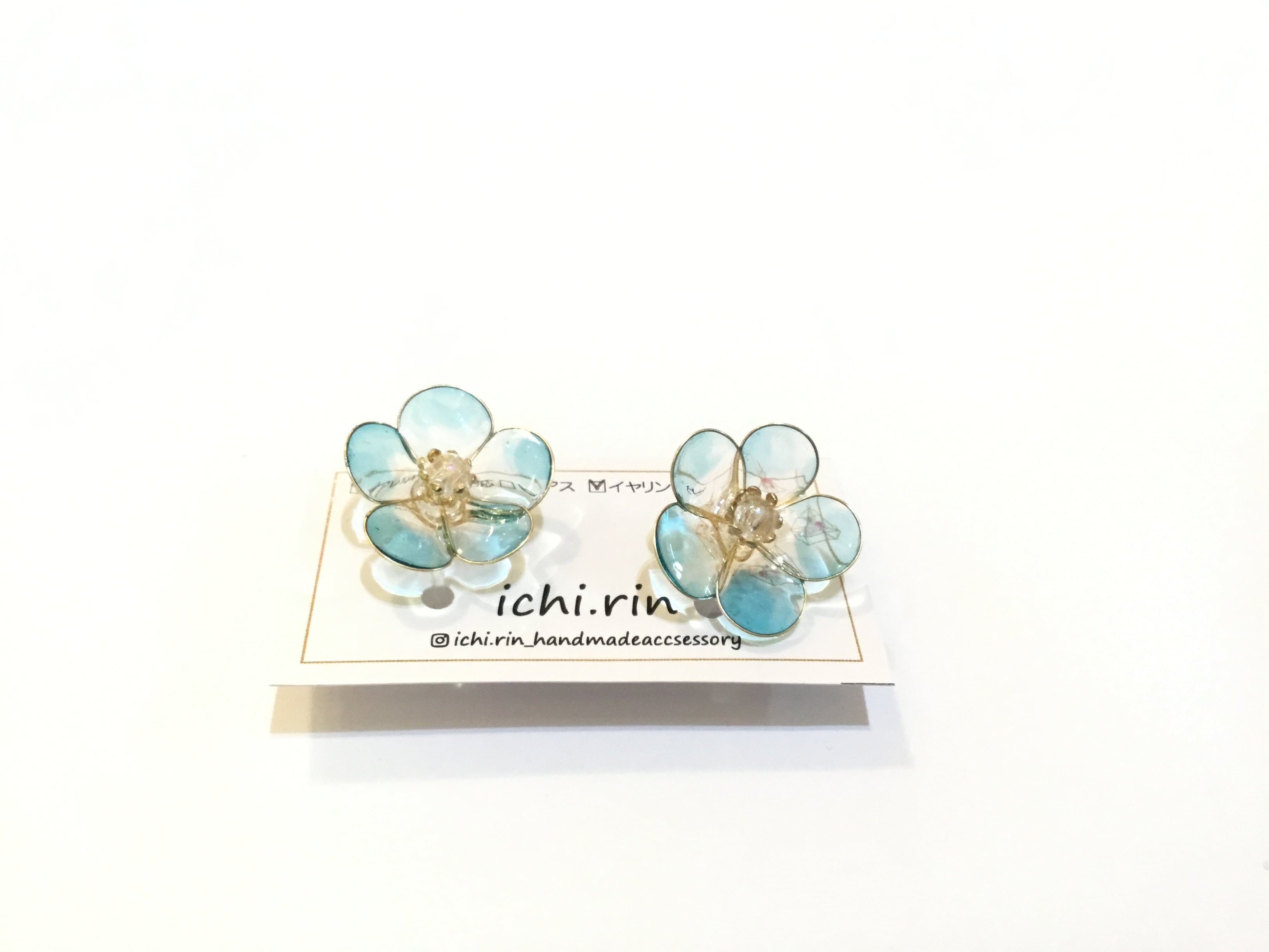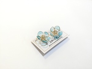 青いお花が可愛い、イヤリングです。 半透明の花びらがまた素敵です。 中心のビーズが、また作品の魅力を引き立ててくれます。 寺町 89