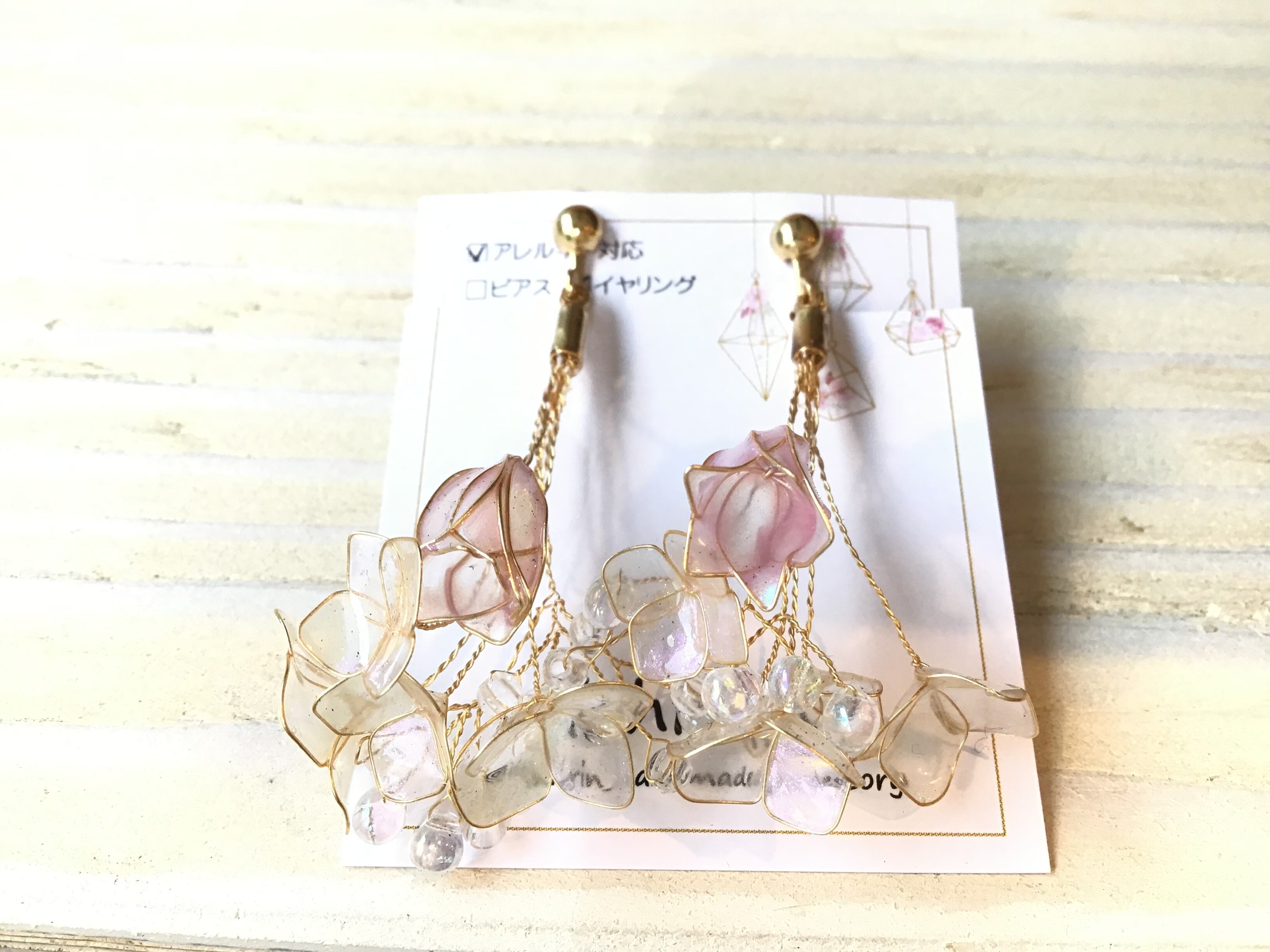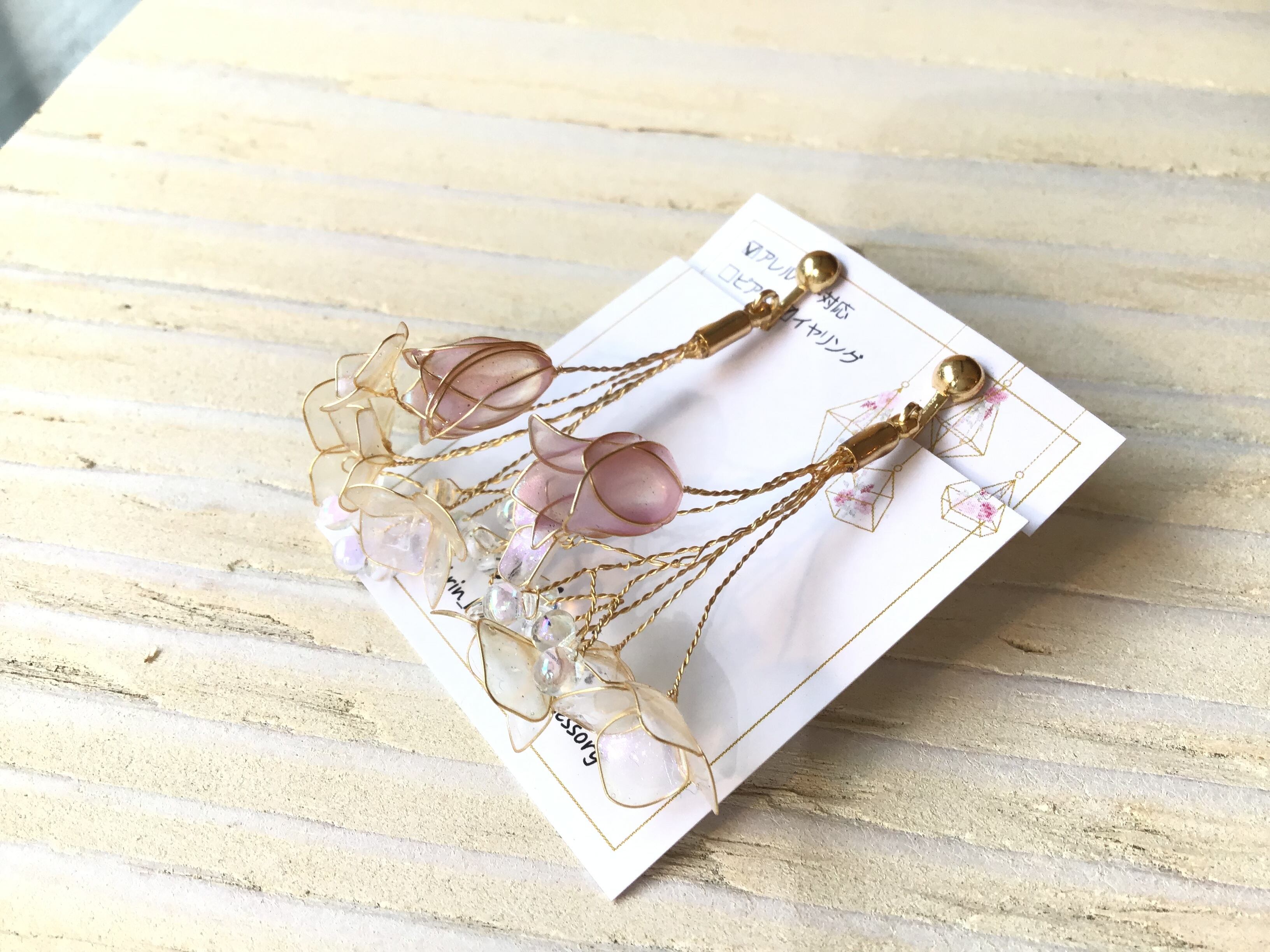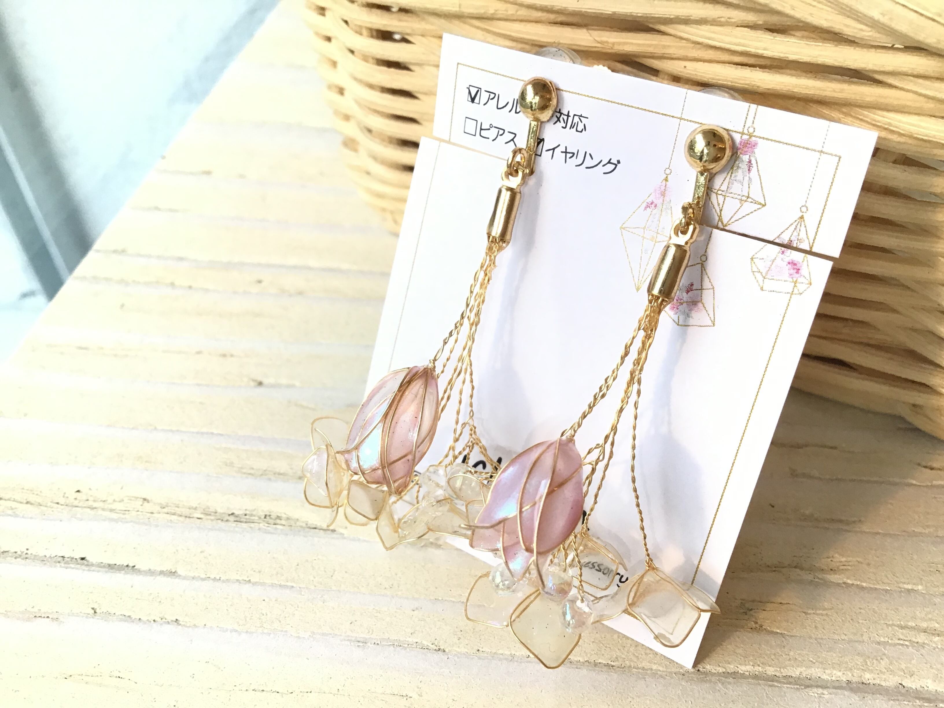 ichi.rin様制作のワイヤーディップアクセサリーです! 繊細でかわいらしいお花が、お顔周りを華やかにしてくれます♪ ミルキーピンクのチューリップは、偏光でとても可愛らしいです✨ 人気作品ですのでお早めにどうぞ‼︎ 【ピアス変更可能】 ピアスへ変更の際は、備考欄に必ずご記入下さい。 【八坂店158】
