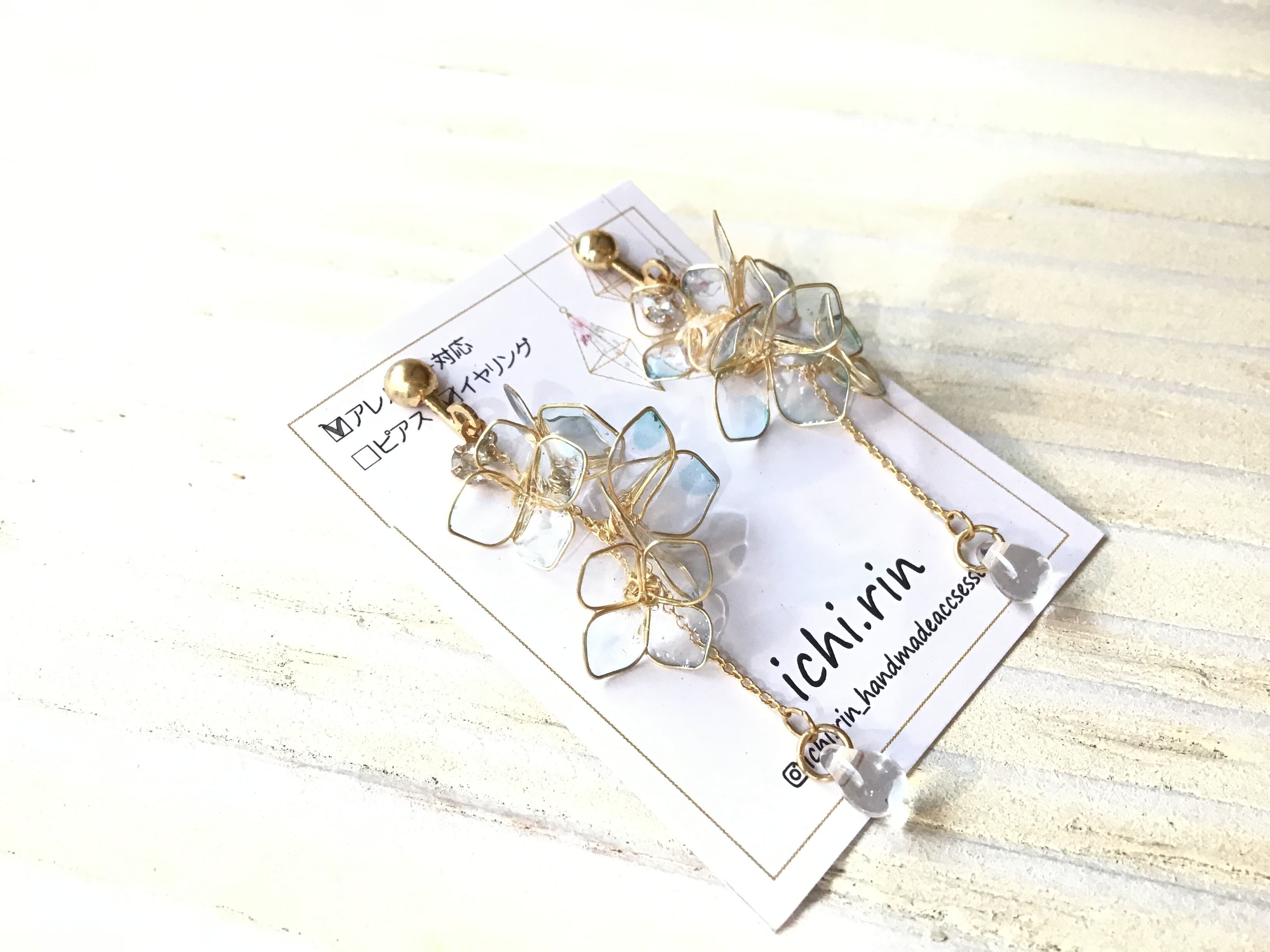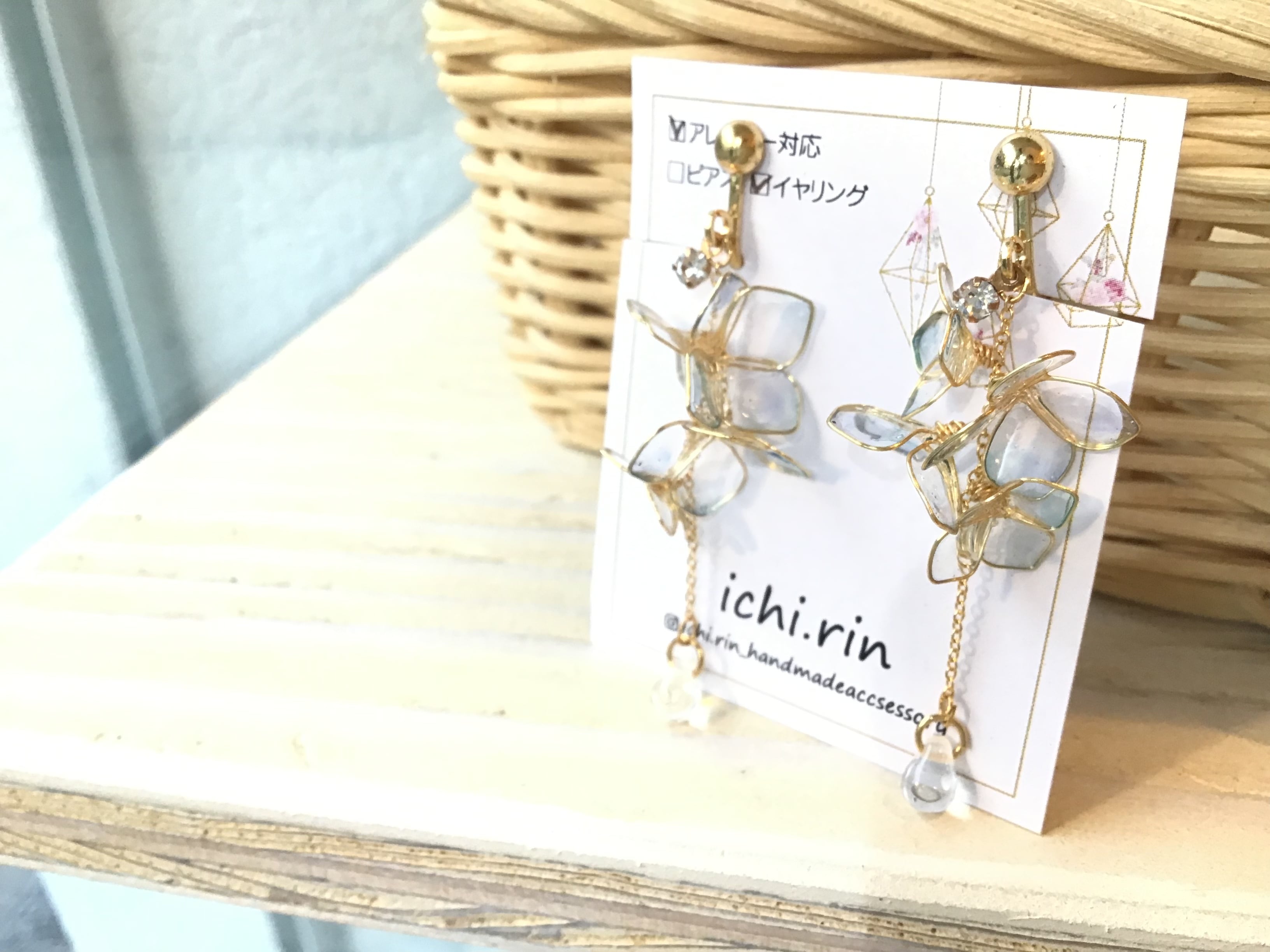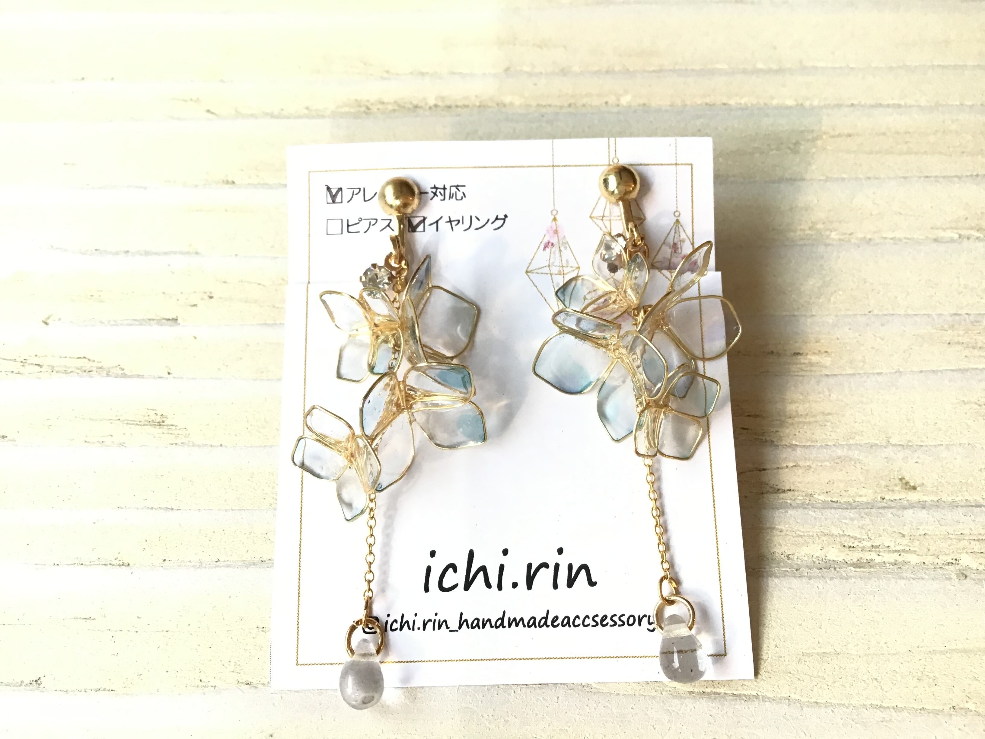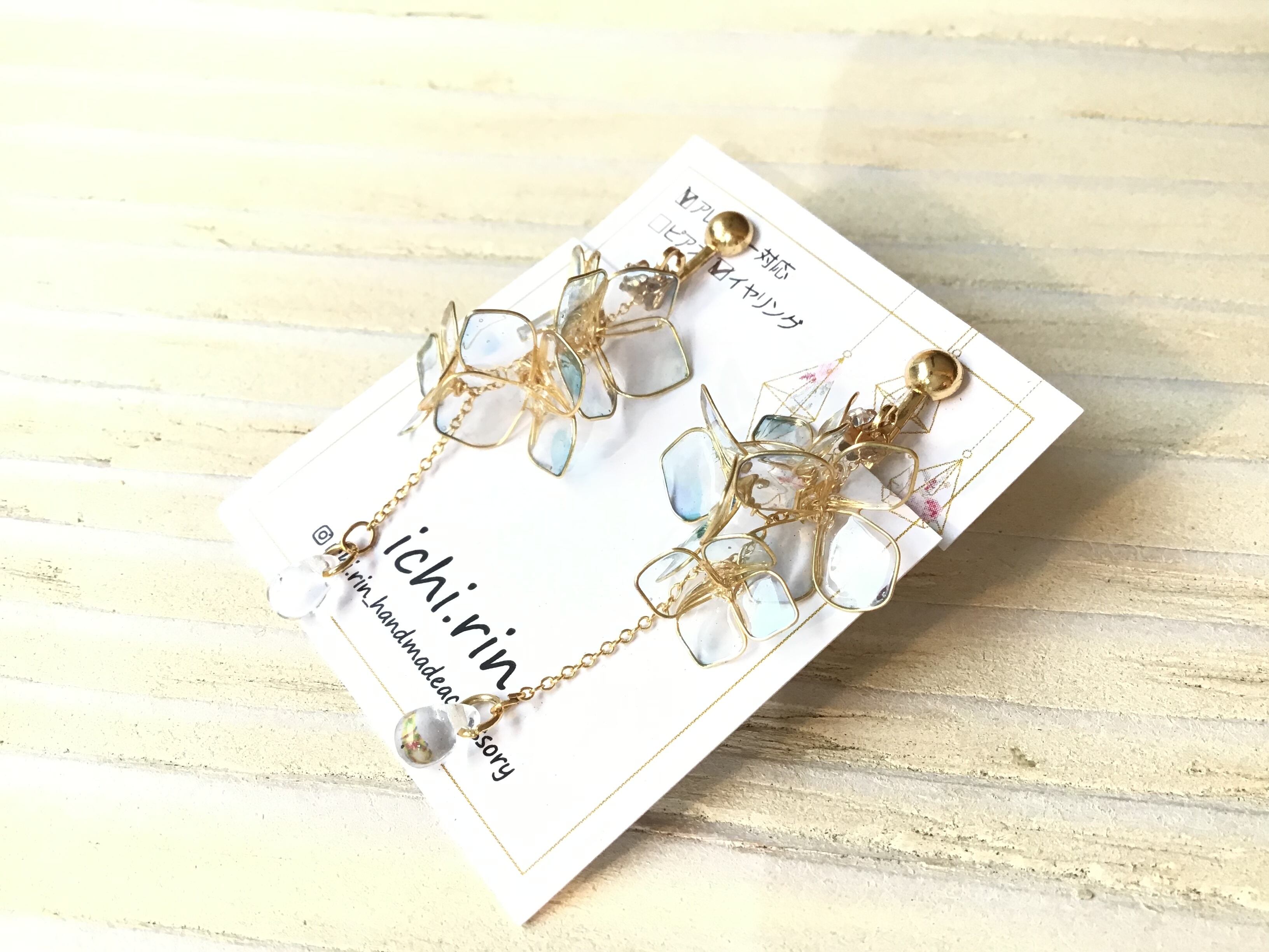 ichi.rin様制作のワイヤーディップアクセサリーです! 繊細でかわいらしいお花が、お顔周りを華やかにしてくれます♡ クリアブルーのあじさいと、雫のようなクリアビーズの組み合わせがかわいいです♪ 人気作品ですのでお早めにどうぞ‼︎ 【ピアス変更可能】 ピアスへ変更の際は、備考欄に必ずご記入下さい。 【八坂店143】