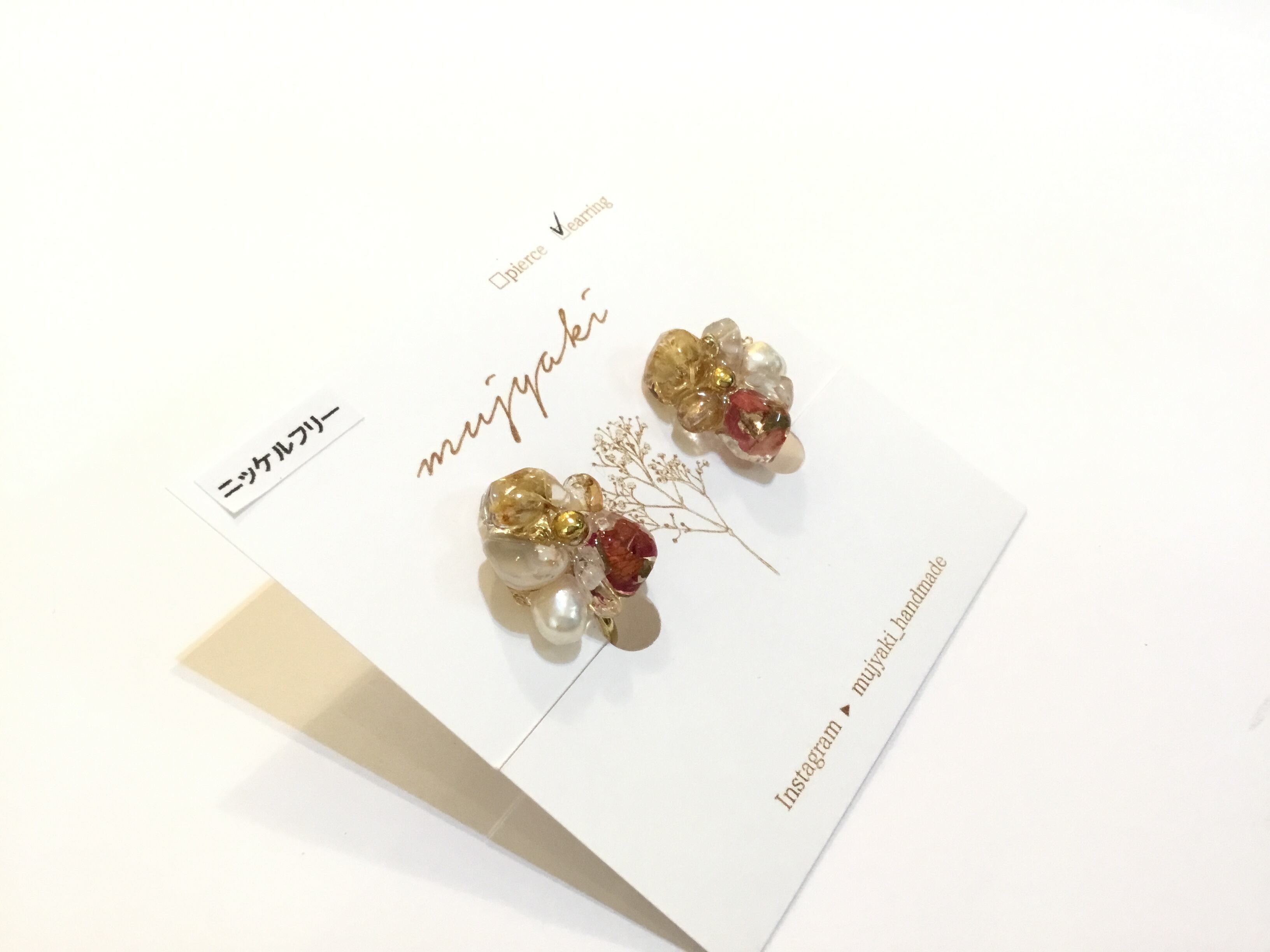 こいしを集めたような、可愛いイヤリングです。 レジンを使用されていて、中に小さな赤い花が詰め込まれています。 寺町 317
