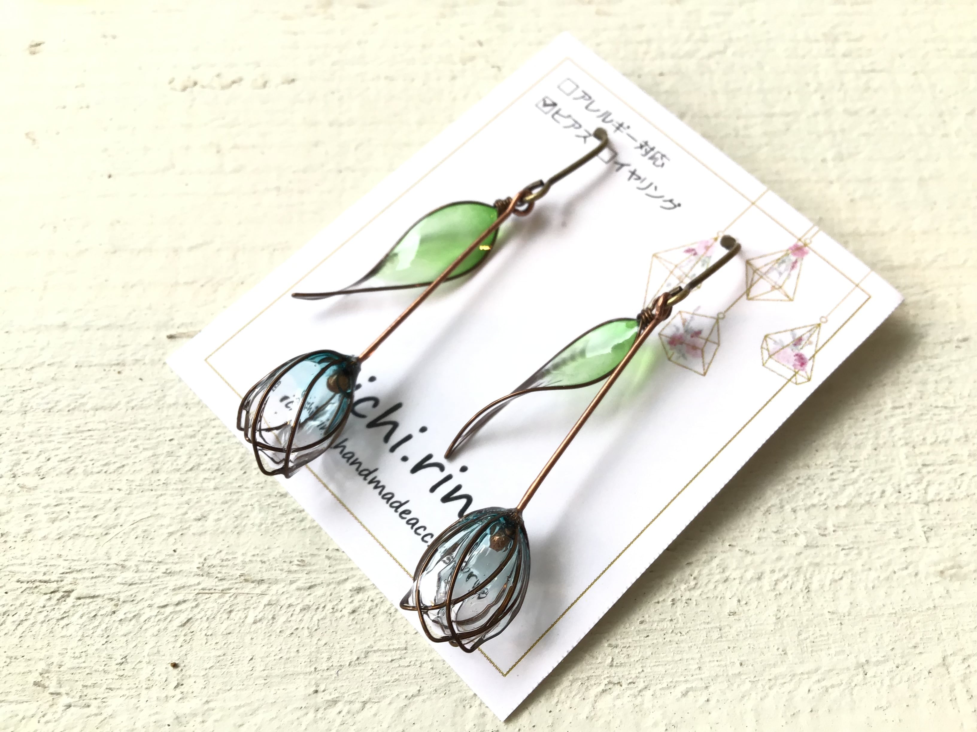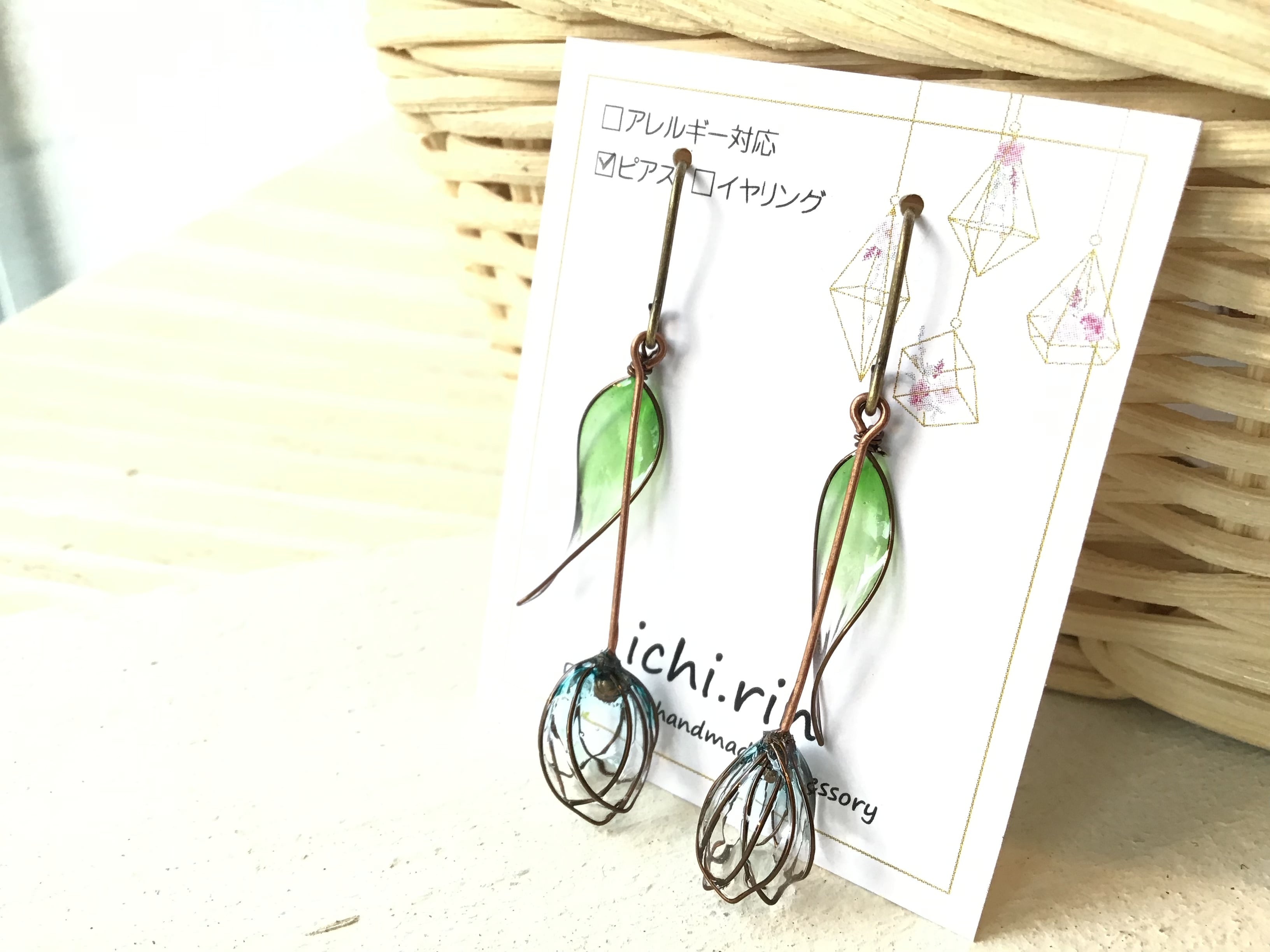 ichi.rin様制作 ワイヤーディップのチューリップピアスです✨ ステンドグラスのような花びらと、アンティーク風の金具が素敵な作品です! クリアブルーの花びらは、透明感があり爽やかです♪ ※【重要】 イヤリングに変更可能 変更の際は備考欄に必ずご記入下さい。 変更後の金具はアレルギー対応していません。 【八坂店222】