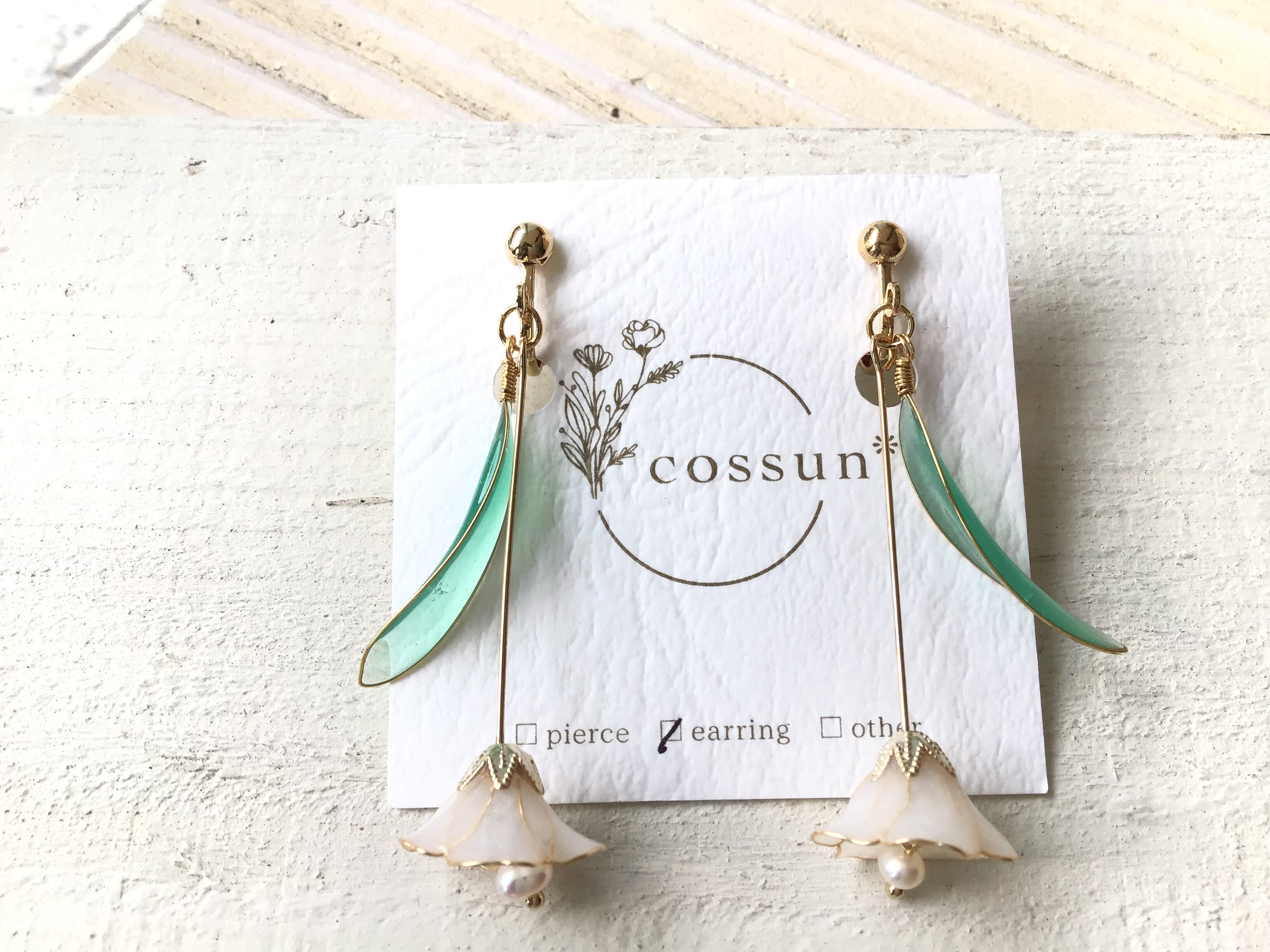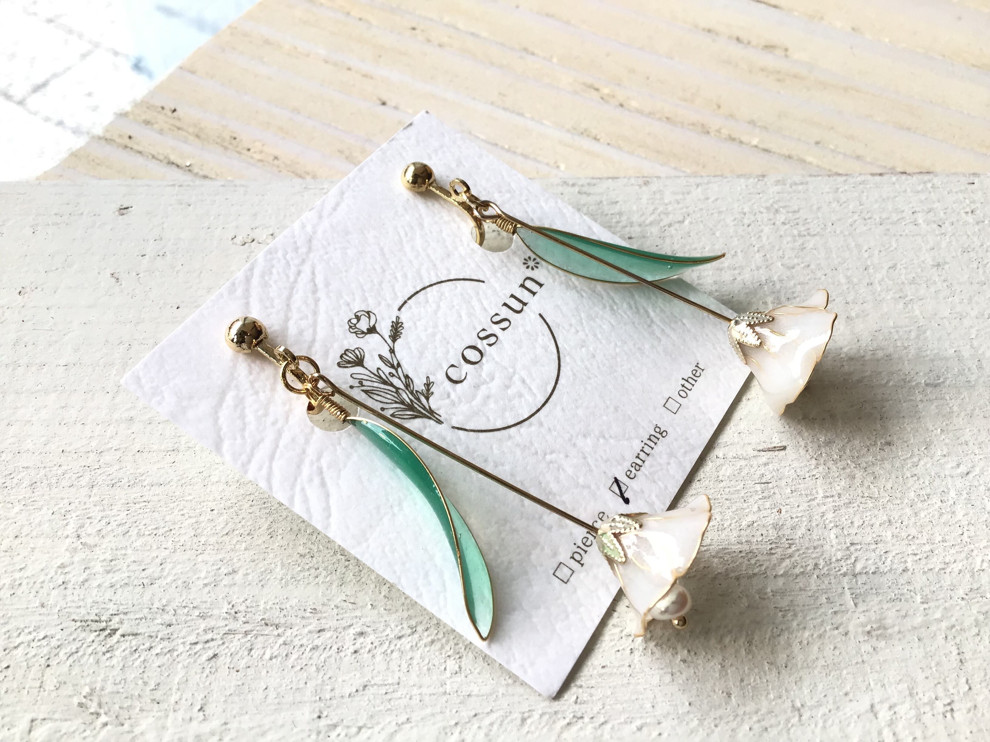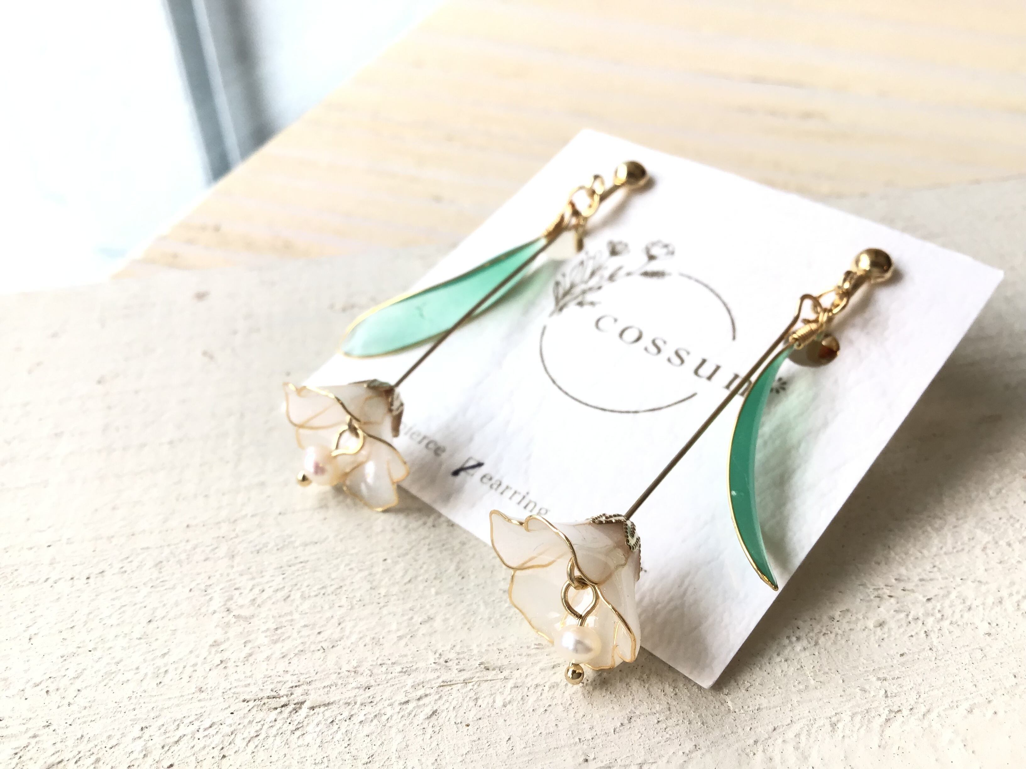 ゆらゆらと揺れる、乳白色のお花が可愛いイヤリングです✨