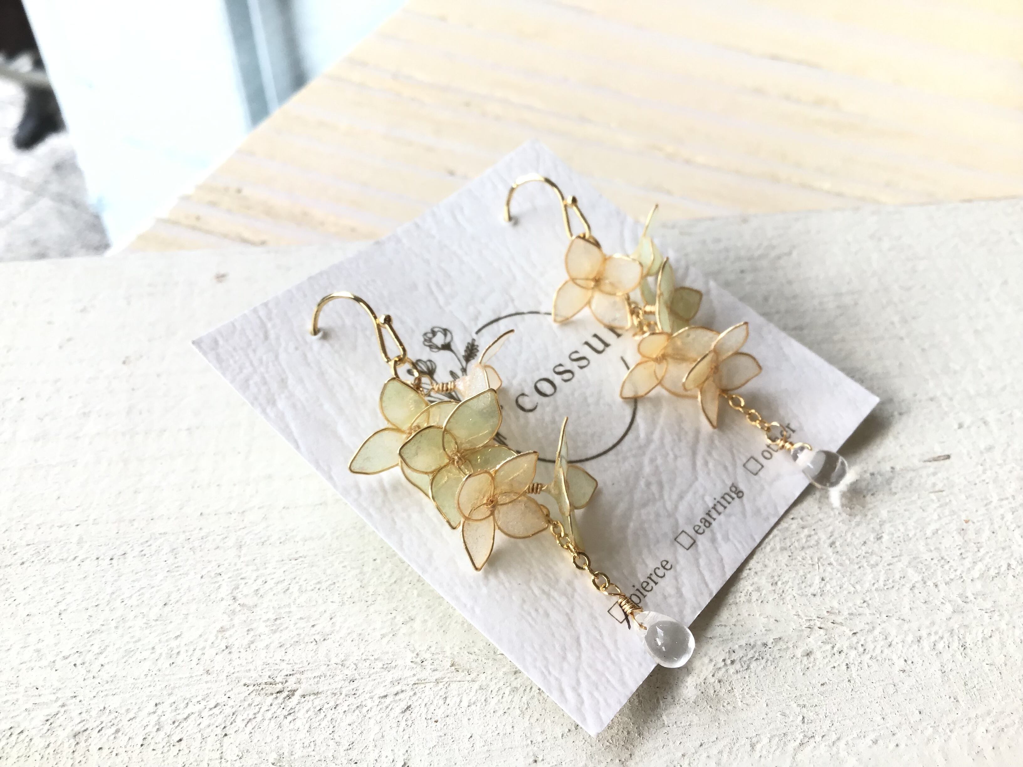 cossun*様製作のフラワーアクセサリーです! ワイヤーディップのあじさいのピアスです♡ 柔らかな色味のピンク、ライトグリーンが素敵な作品です✨ ラメが入っていたり、しずく型のストーンが付いていたりと細かなところまで可愛いです♪ ※イヤリング変更可能 イヤリングに変更希望の方は、必ず備考欄にてご連絡をお願い致します。 【八坂店b49】