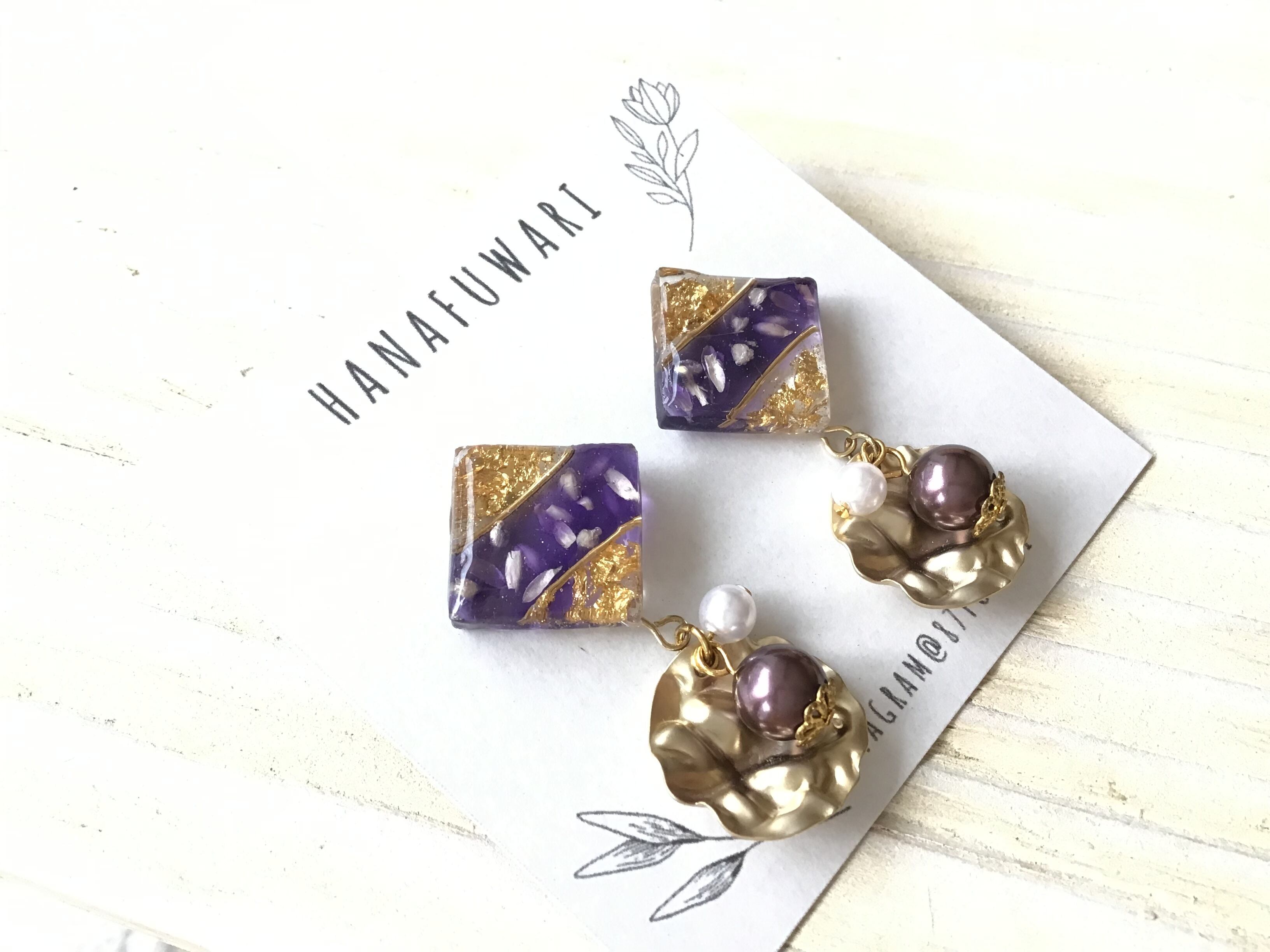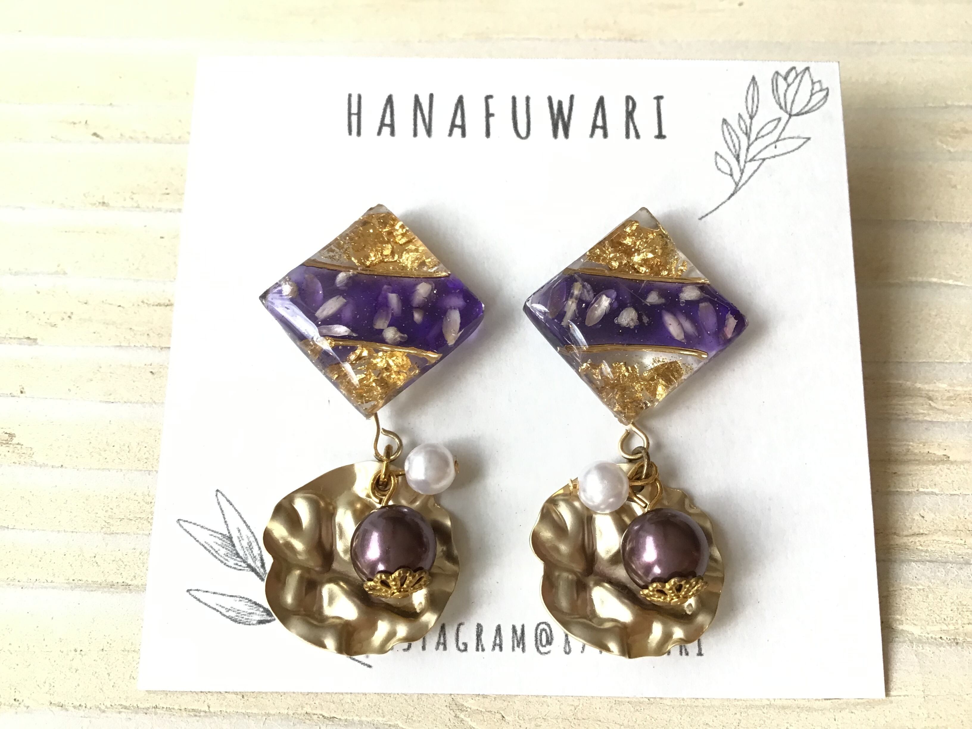 花ふわり様制作 パープル×ゴールドのレジン作品です! 金属パーツとパールが揺れる、大人っぽいアクセサリーです♪ 【八坂店hanaK17】